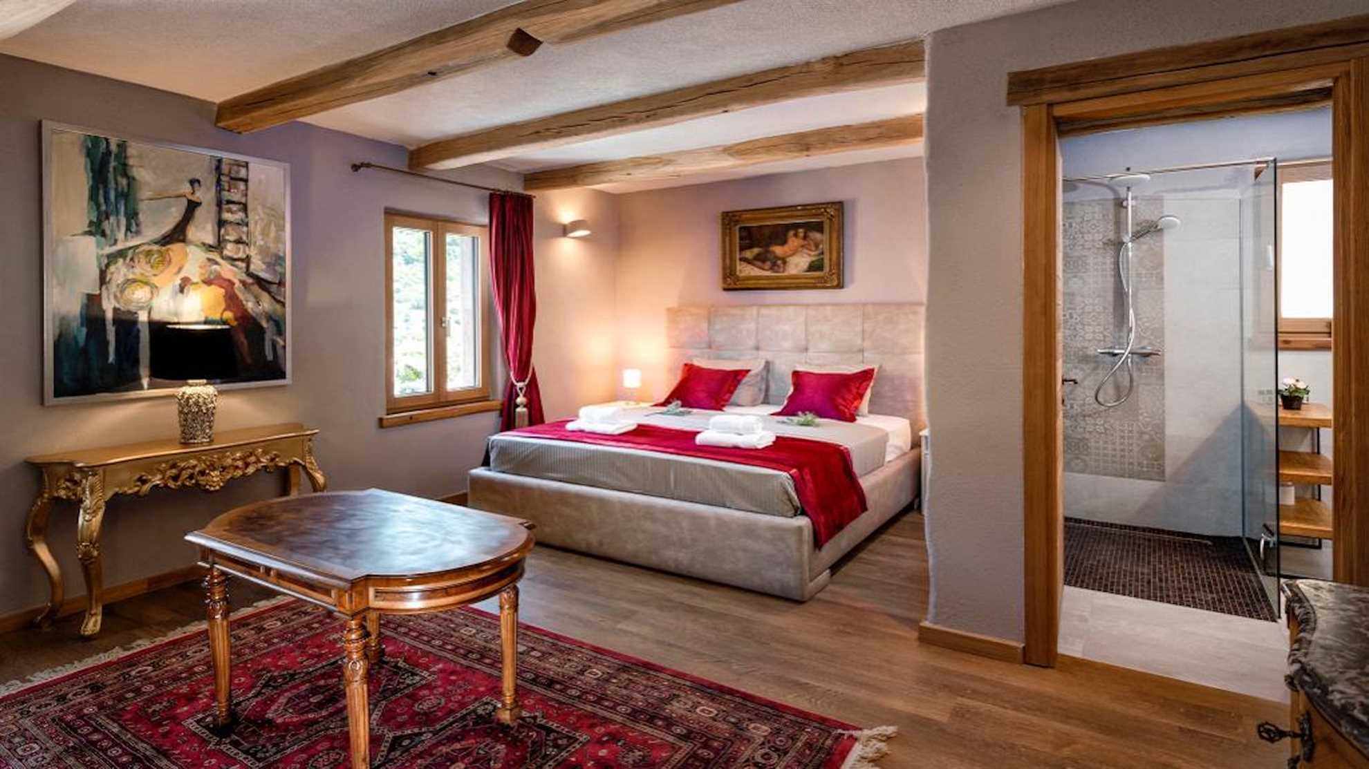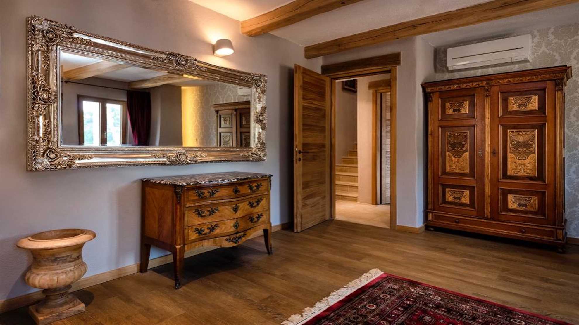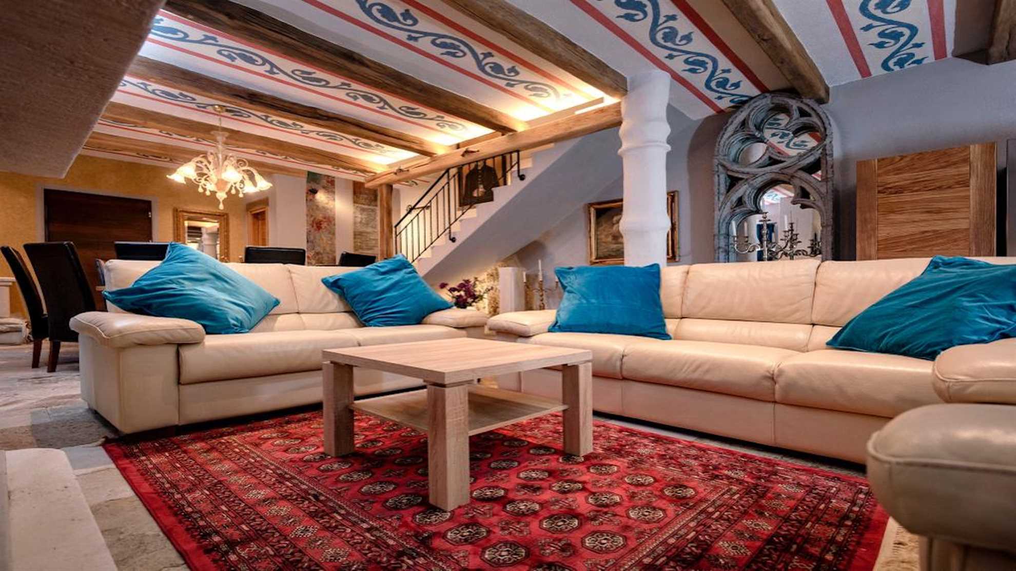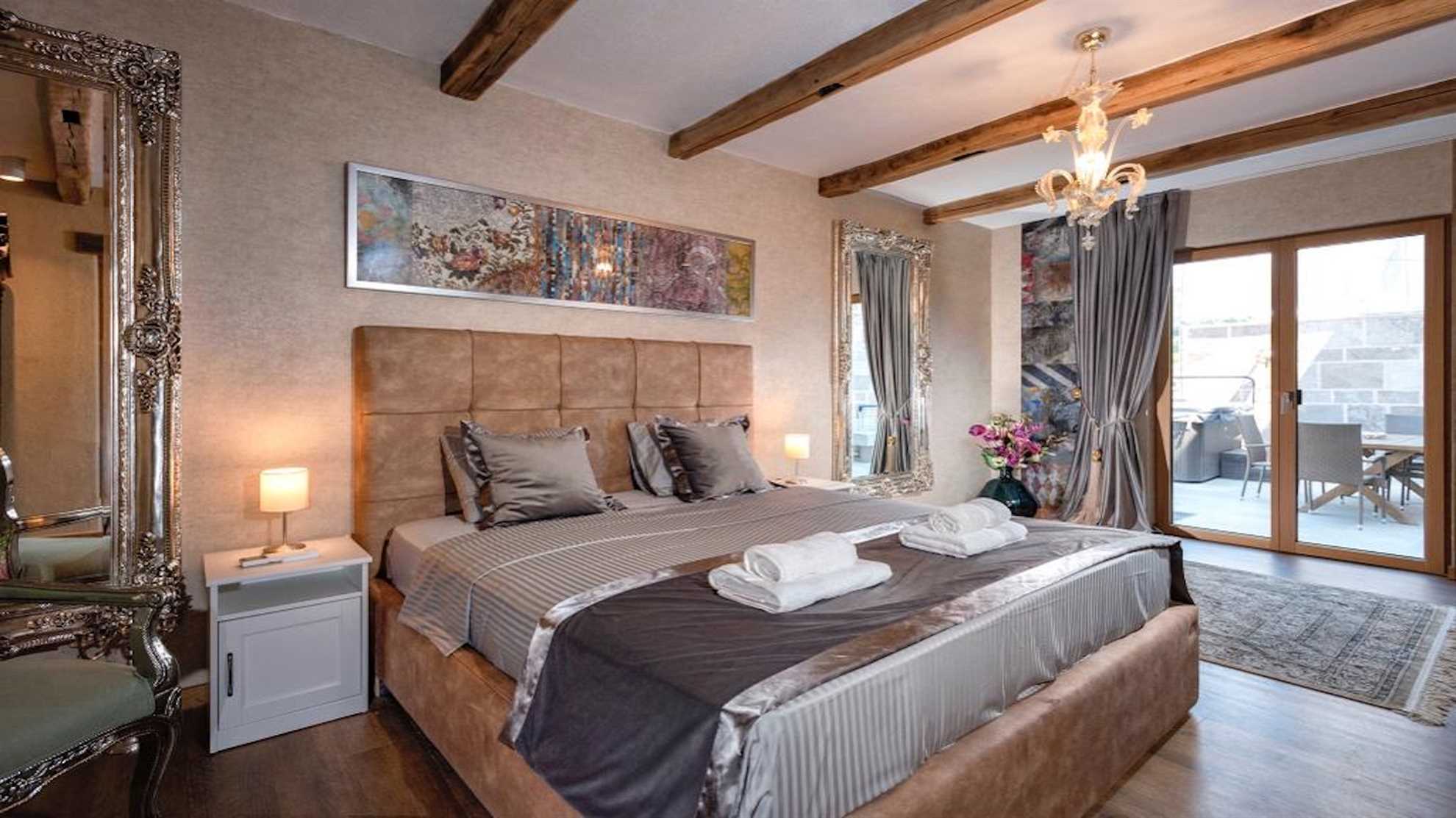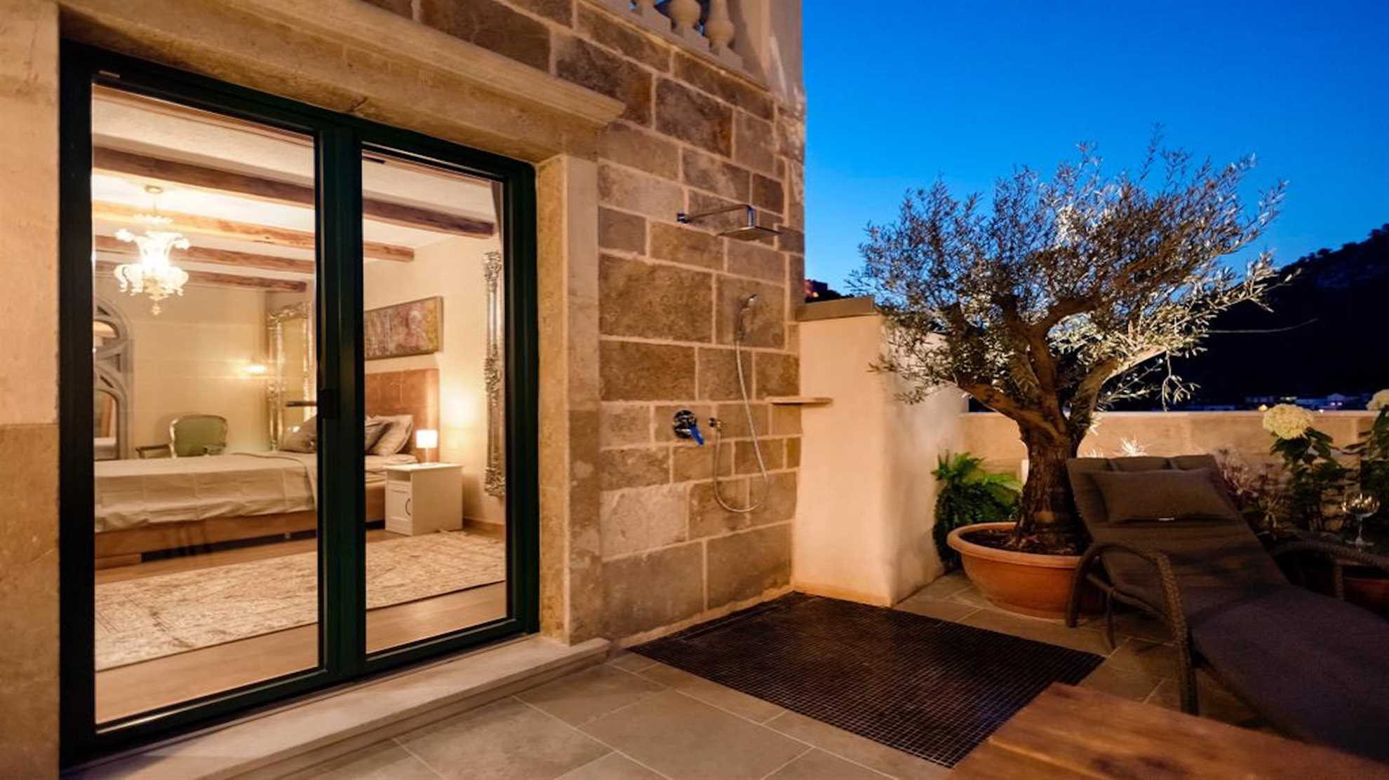 The entrance opens up directly into the living room with original fireplace, exposed Slavonian oak beams, polished ancient stone floors, Venetian Murano glass chandelier, custom-made cabinetry and a direct access to the terrace overlooking Old Town Hvar. The terrace is equipped with a seating lounge area, outdoor dining, barbecue facilities and a Jacuzzi, a spectacular place to enjoy quiet evenings while pondering the history of Hvar. Bar area and a fully equipped kitchen as well as one of the en suite king bedrooms with access to the courtyard are also on this floor. Going up the elegant staircase remaining two en suite king bedrooms can be found. Specious and luxurious master bedroom features custom drapes and cushions with hand-painted fabrics, Murano glass vases and access to a large terrace overlooking Hvar red roofs. On the second floor, with slanted ceilings with exposed beams and skylight are the two large en suite bedrooms with two and four single beds. All the bathrooms are fitted with high-end accessories, antique mirrors and walk in showers. Welcome to a Royal getaway, Palazzo Hvar.