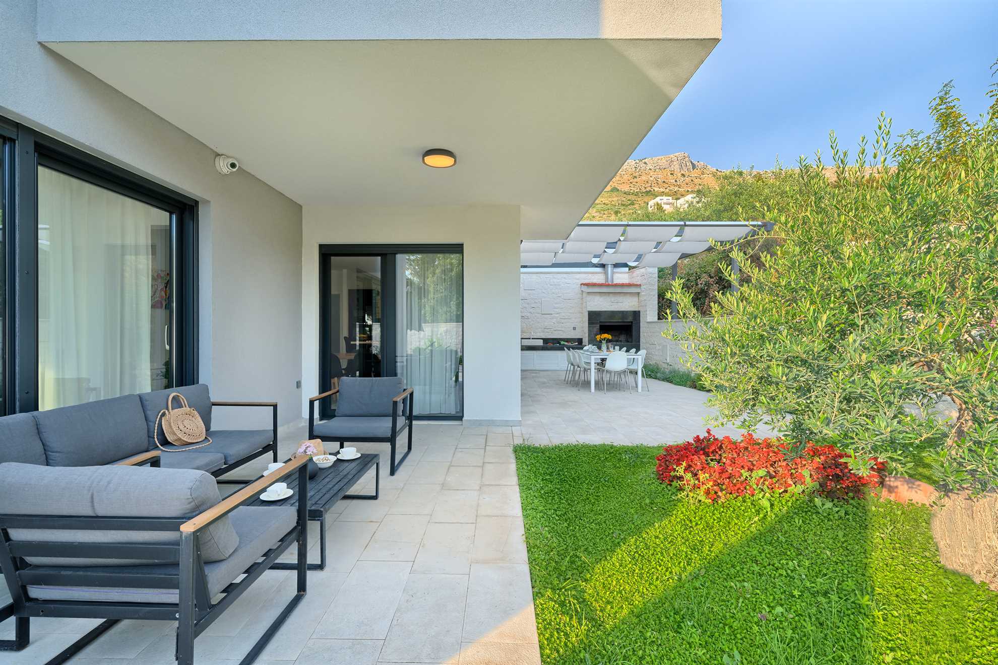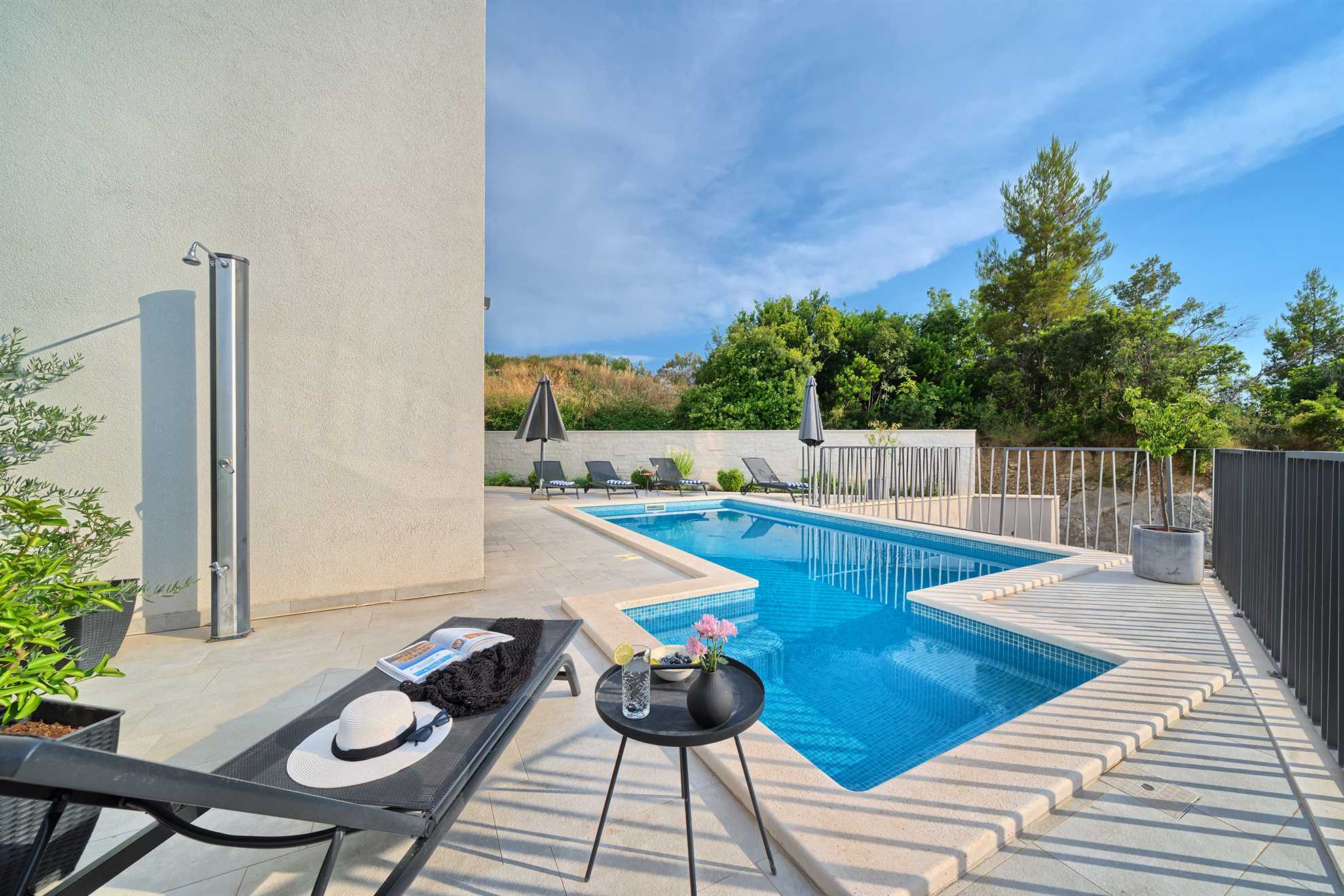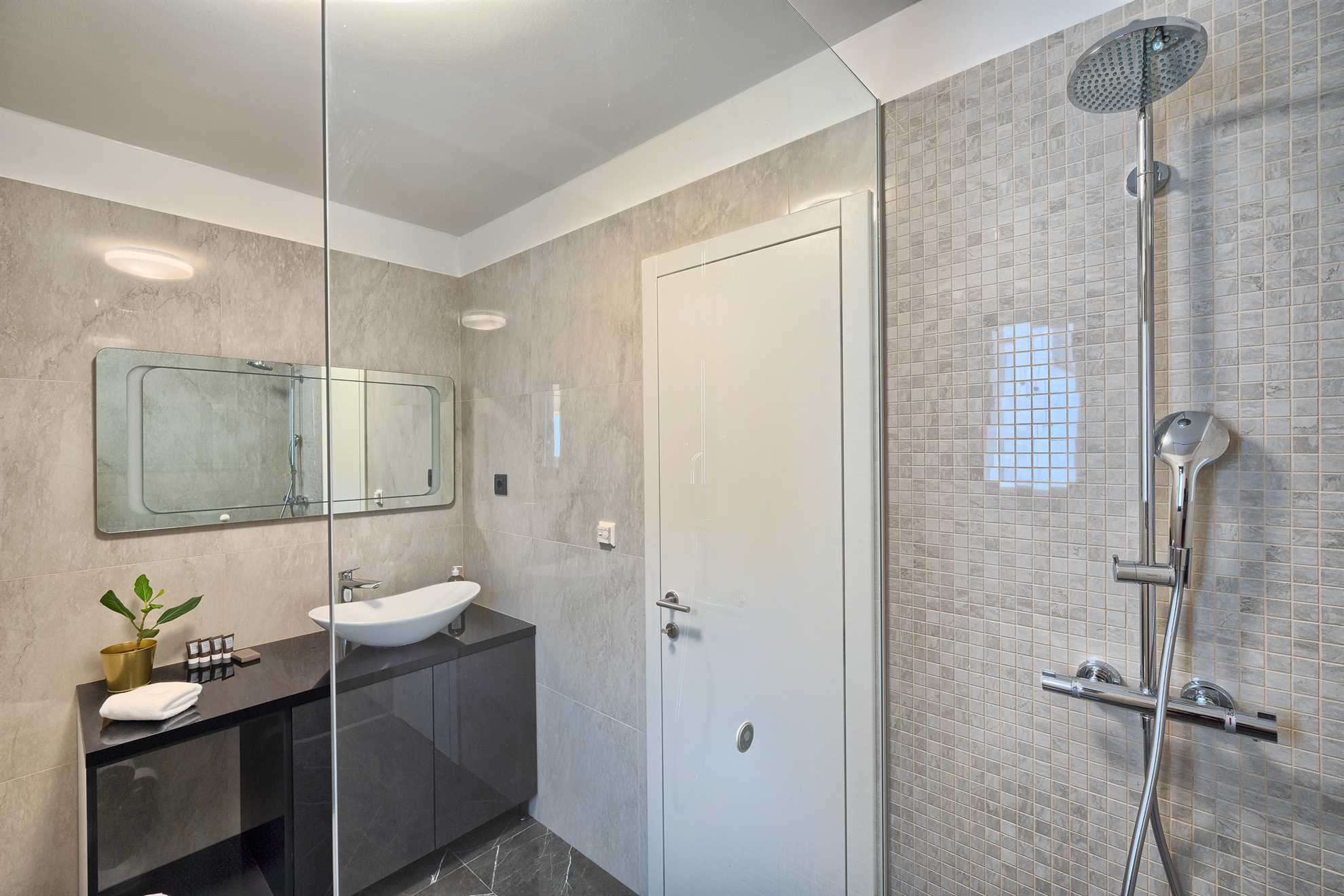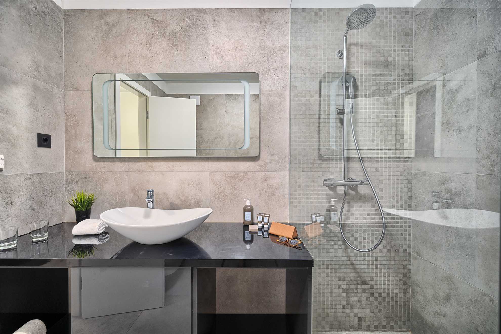 With five en-suite double bedrooms 10 adult guests are comfortably accommodated. Rooms, with walk-in closets, are beautifully decorated with creative wall art, subtle but modern light fixtures while charming bathrooms show of elegant design with wood tones and soft black textures that dominate this exquisite villa.