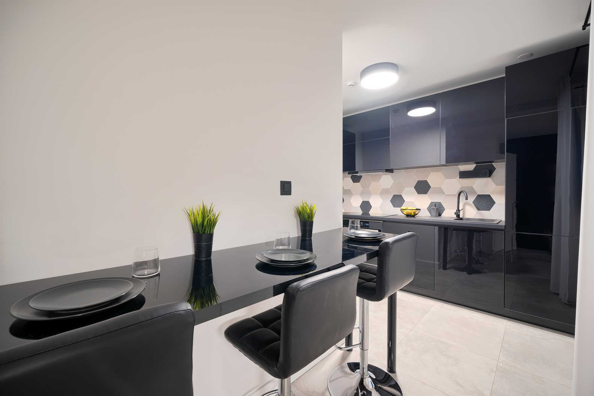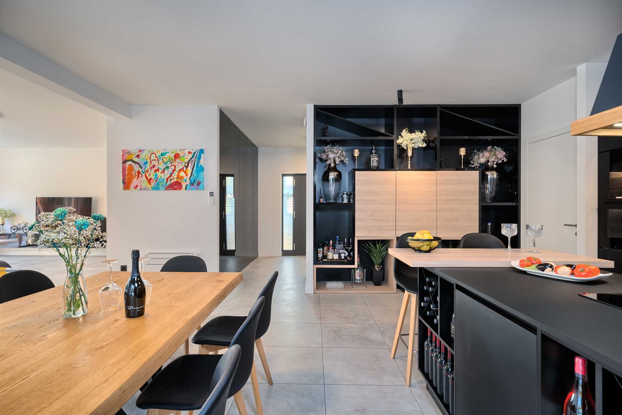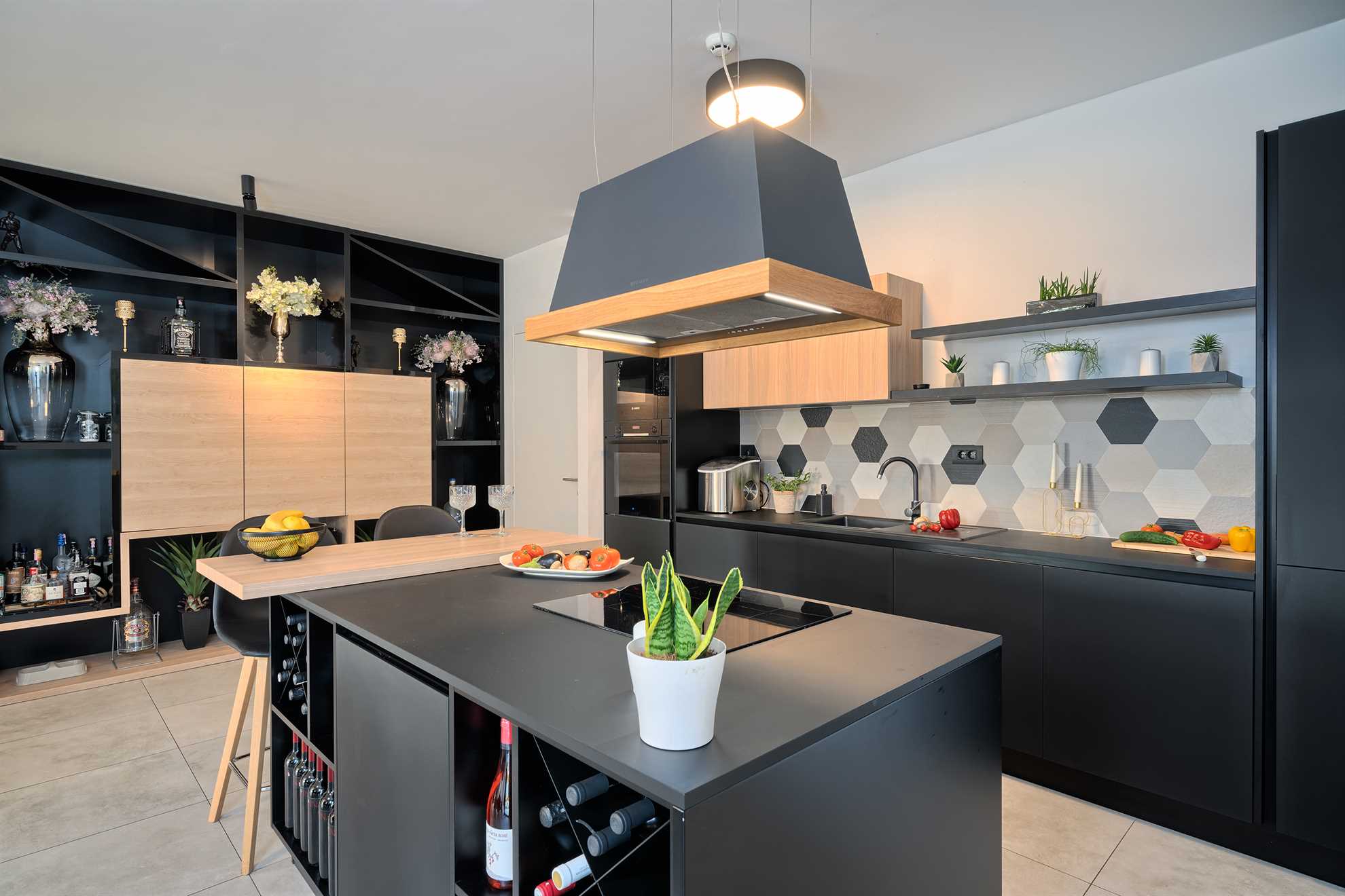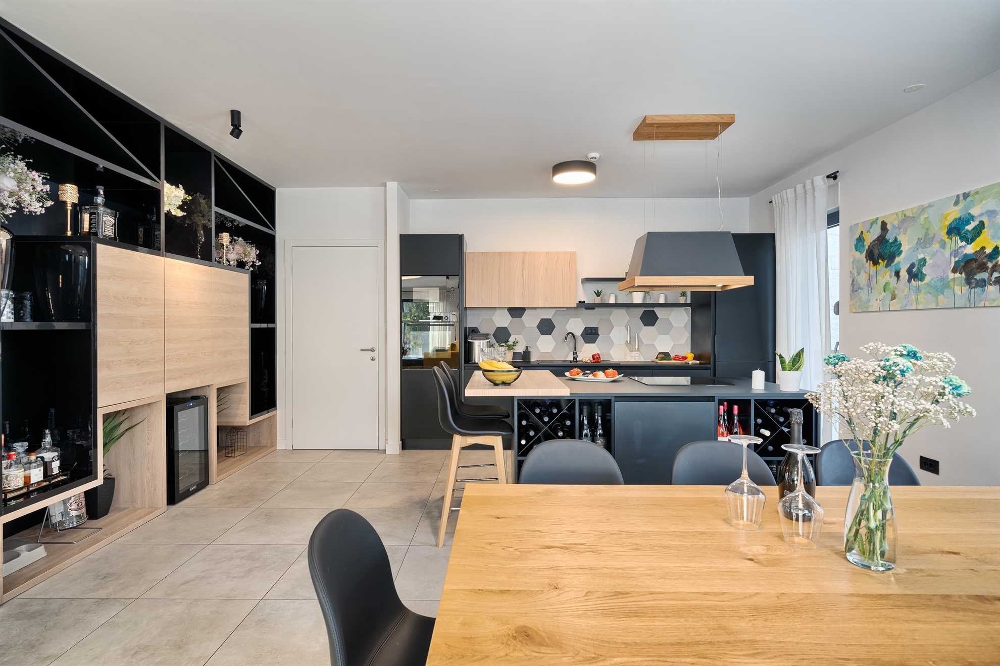 With five en-suite double bedrooms 10 adult guests are comfortably accommodated. Rooms, with walk-in closets, are beautifully decorated with creative wall art, subtle but modern light fixtures while charming bathrooms show of elegant design with wood tones and soft black textures that dominate this exquisite villa.