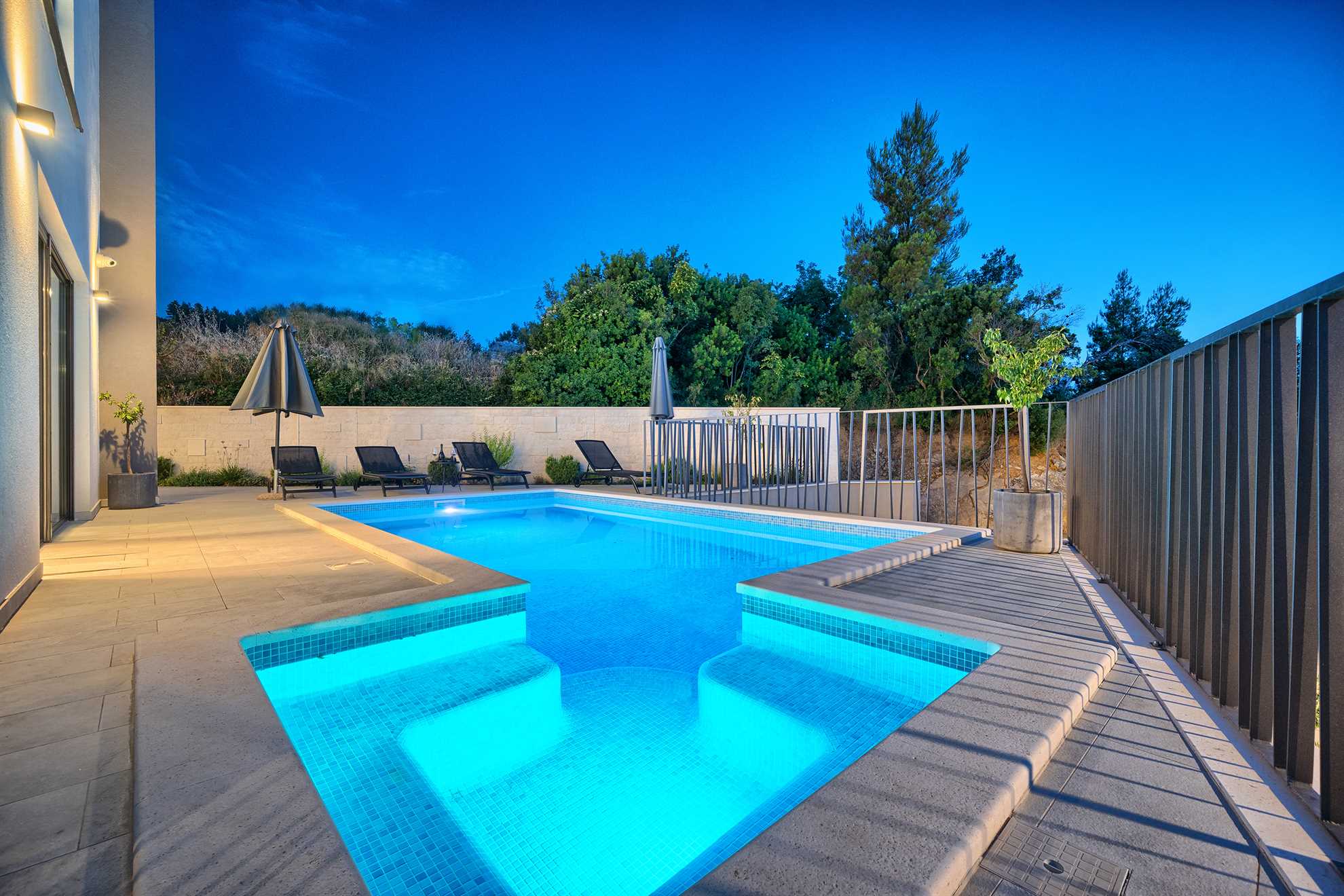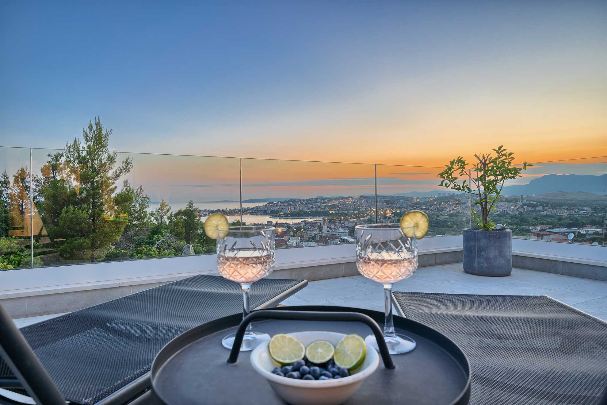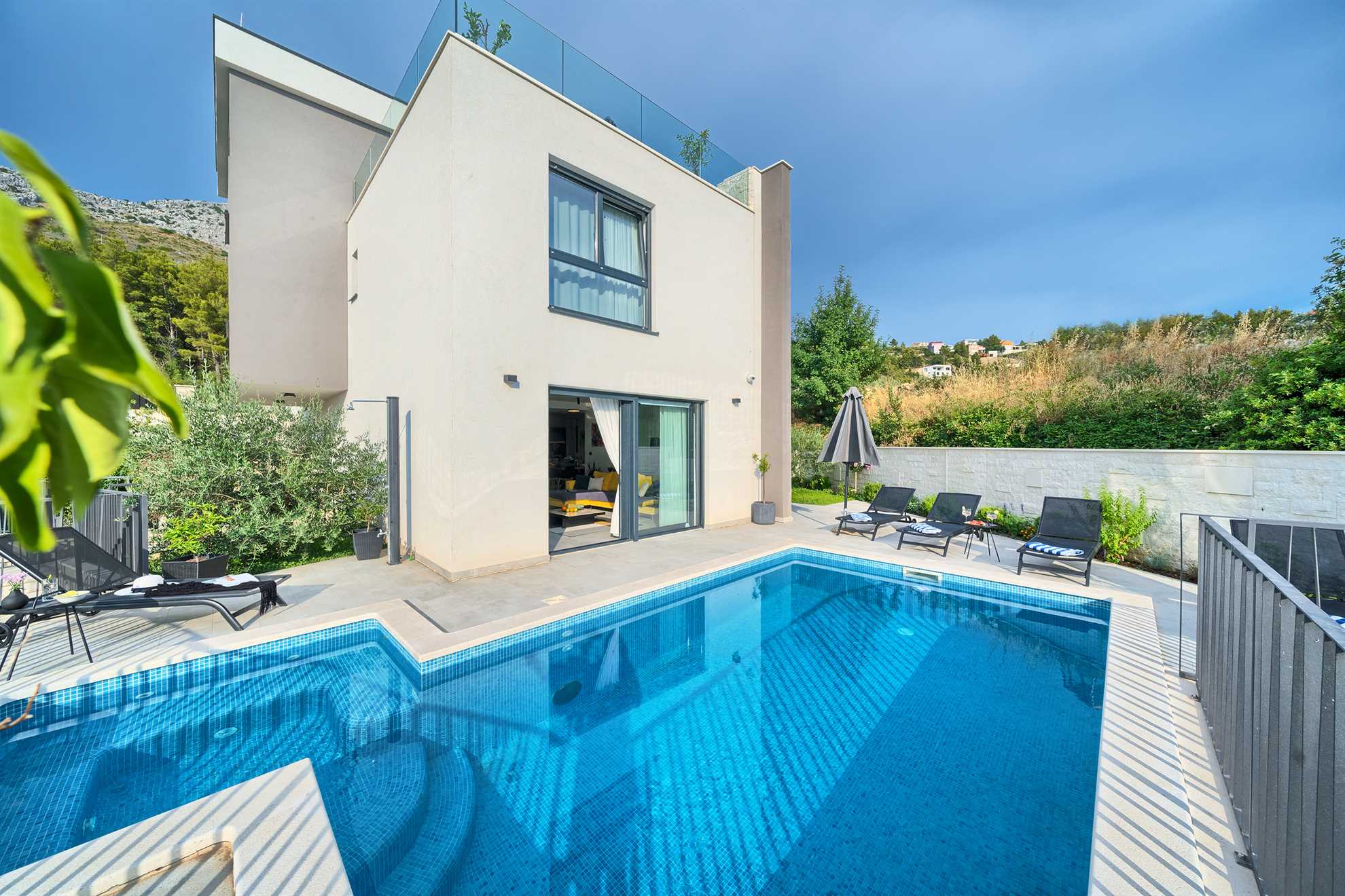 One of a kind 450 m² luxurious villa with a private pool, a sauna and stunning views of the Adriatic located nearby Split, in a picturesque village Podstrana. Beautifully designed, spacious, luminous and inviting living area with unique accents and tastefully decorated walls is equipped with luxurious oversized sofa, a fireplace and a large smart TV. An adjacent fully furnished, contemporary kitchen with a breakfast bar and a dining room completes the space with a sophisticated touch. Villa Pure Leisure is exactly that - pure leisure. Rooftop terrace, equipped with a Jacuzzi, is a perfect spot to enjoy the sunsets, while the downstairs pool deck, surrounded with sun loungers and meticulous garden, offers comfortable seating areas, outdoor dining and an authentic built-in barbecue. A four-car garage is provided for extra security and from here you can take a lift to any of the three floors of the house. Uniquely, the third floor of the house serves as a penthouse with a bedroom, its own living area, a bathroom, a separate kitchen, a terrace and access to the rooftop terrace and may be ideal for those in the family seeking extra privacy. We invite you to enjoy Croatia at its best!