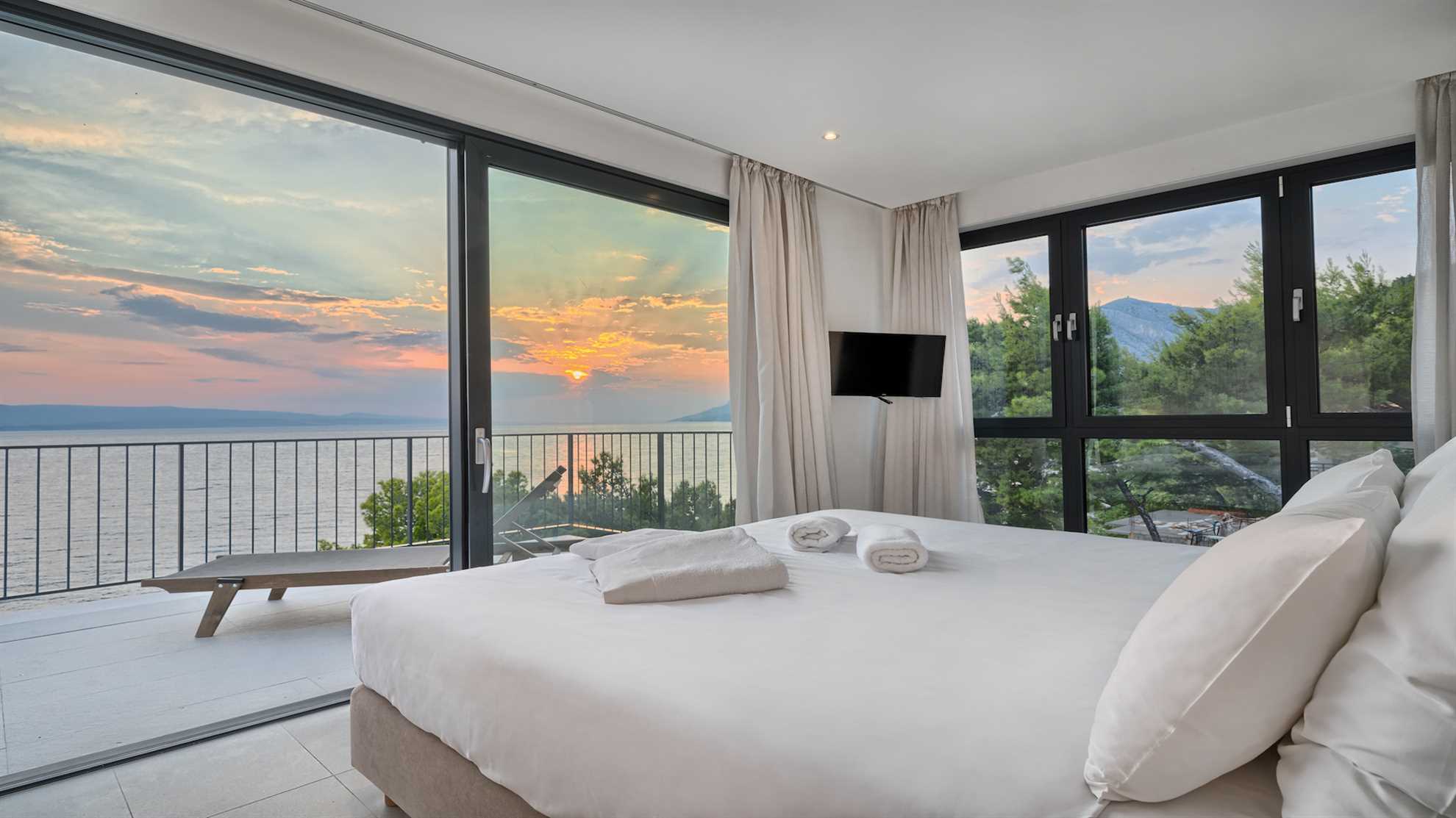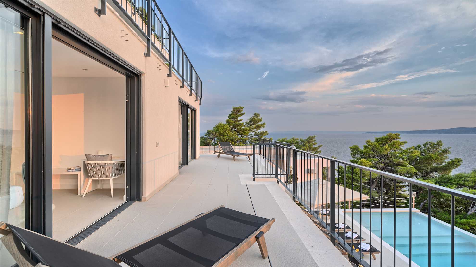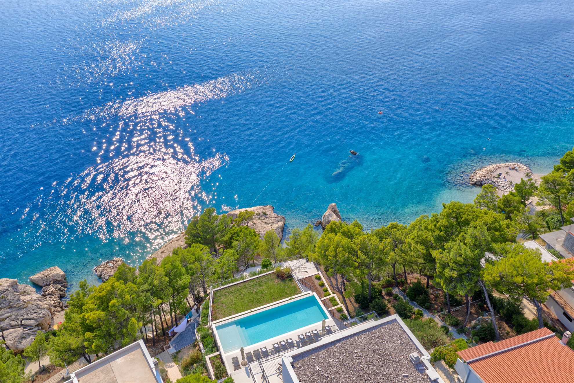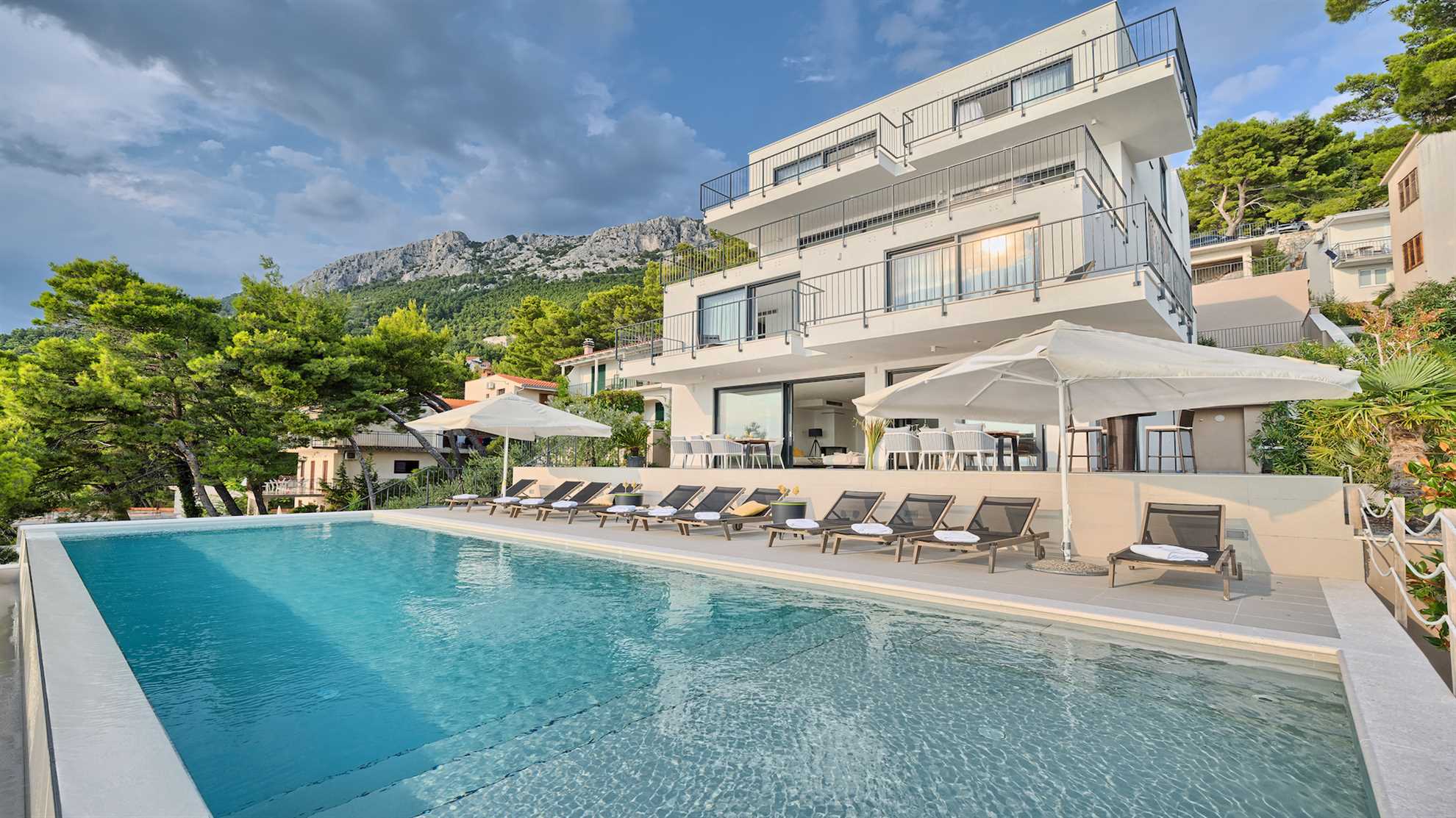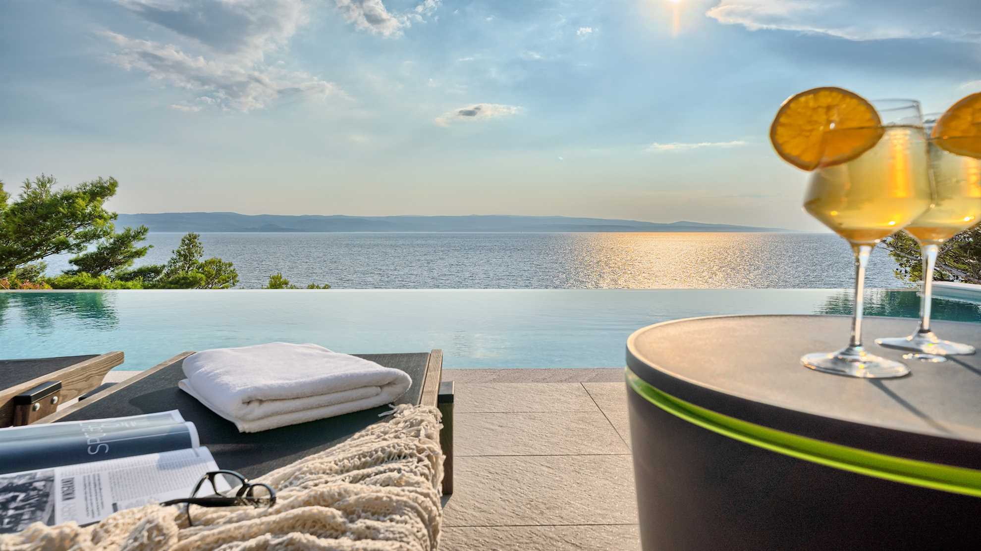 With striking mountains in your back garden, the dazzling sea at your doorstep, ultramodern facilities, rare ability to accommodate larger groups and no luxury, big or small, spared, Villa Platinum is in its own league. 650 m2 occupy the four story villa, each level easily reached with an elevator, with a sauna, gym, wine cellar and a jacuzzi at your disposal. The ground level is impressive with bright open living space and floor to ceiling windows allowing spectacular views, equipped with contemporary furnishings, a fireplace, top of the line kitchen facilities and a dining table seating 18, all with an access to a large 300 m2 terrace with a heated pool and sun loungers. The upper levels occupy eight ensuite bedrooms, fitness activities, a game room and access to balconies, ideal for admiring sunsets. Ninth bedroom is part of a separate apartment with its own entrance, a private bathroom, and a living room with a sofa bed making it a perfect choice for those opting for extra privacy.