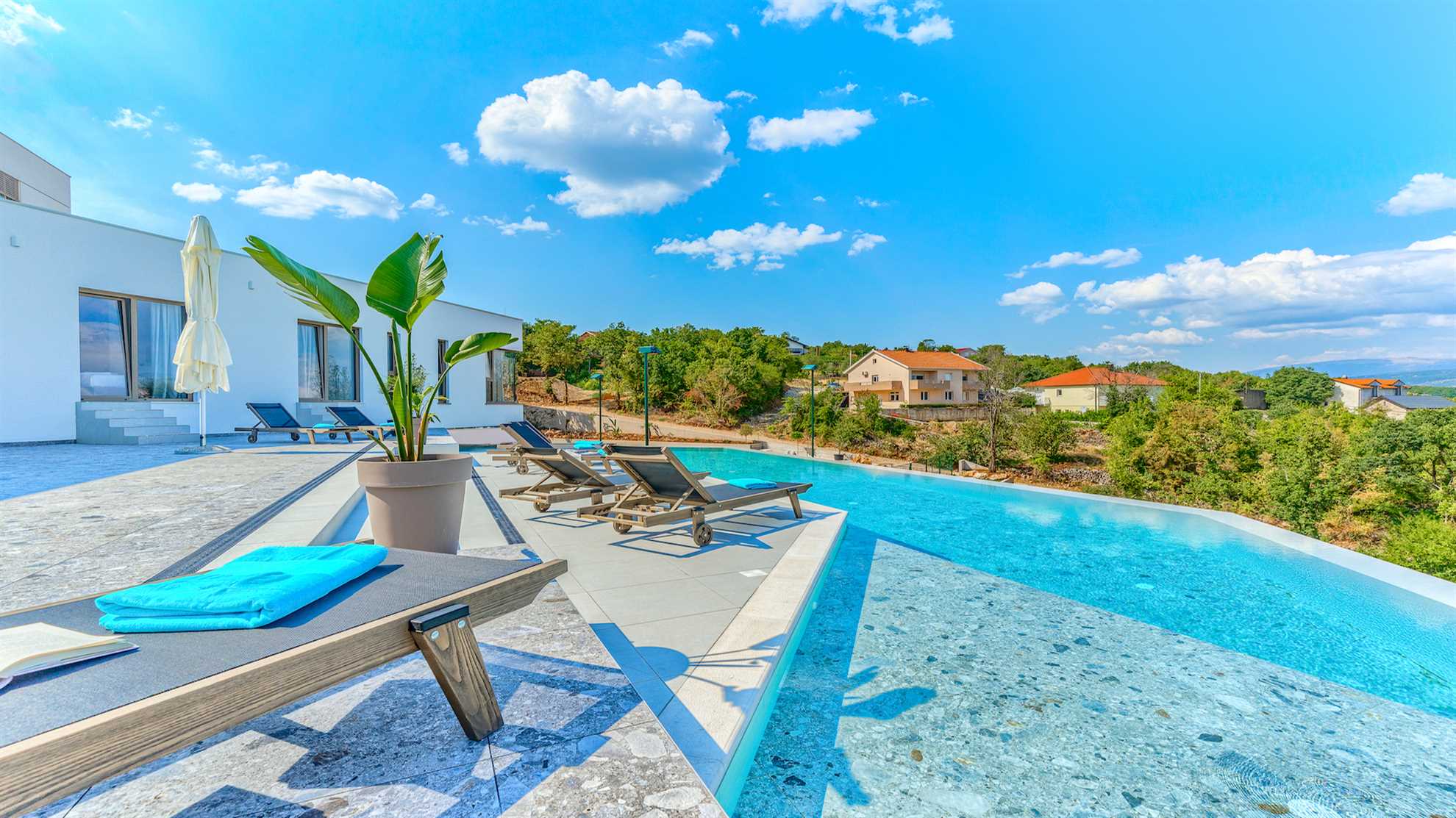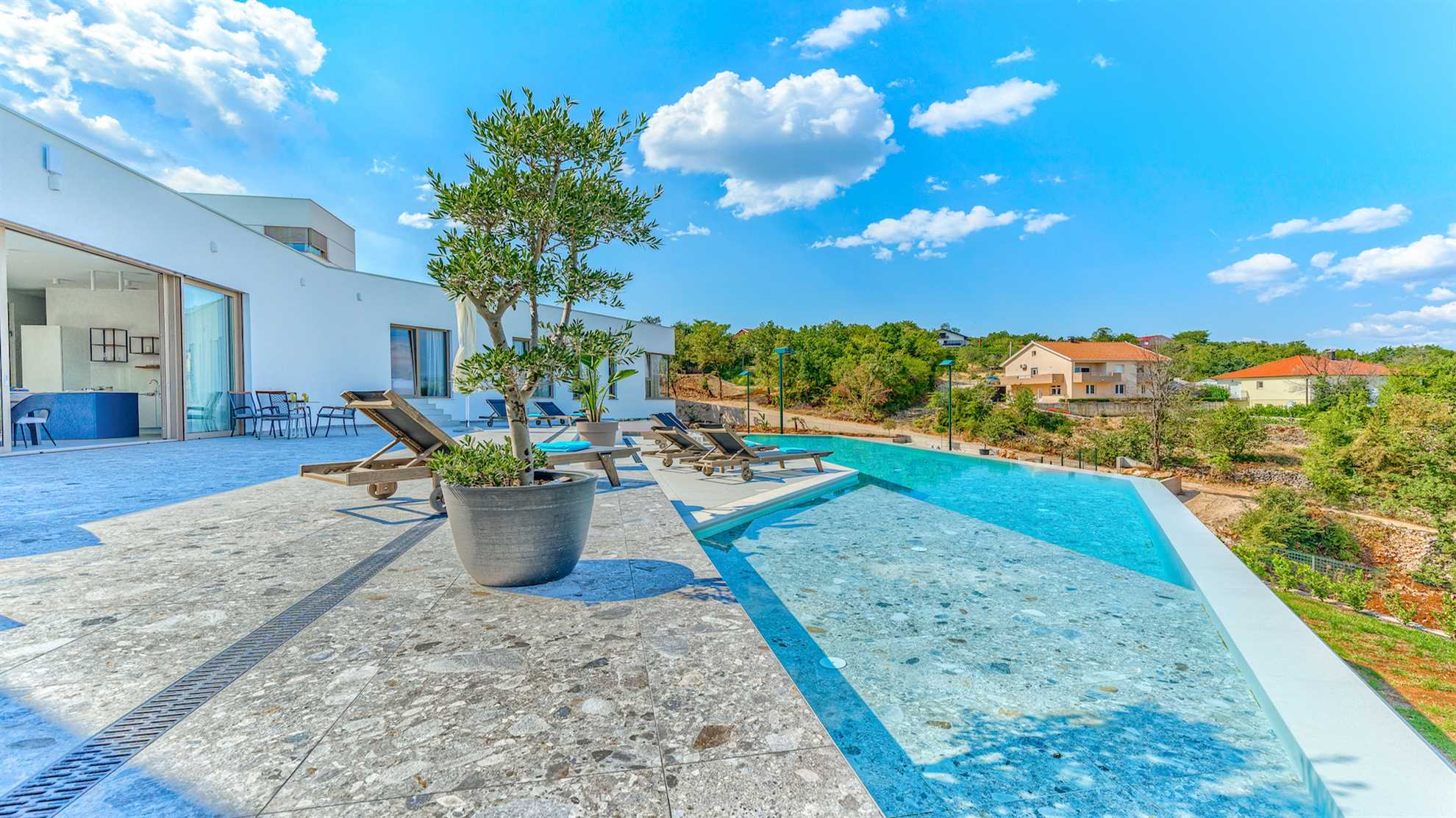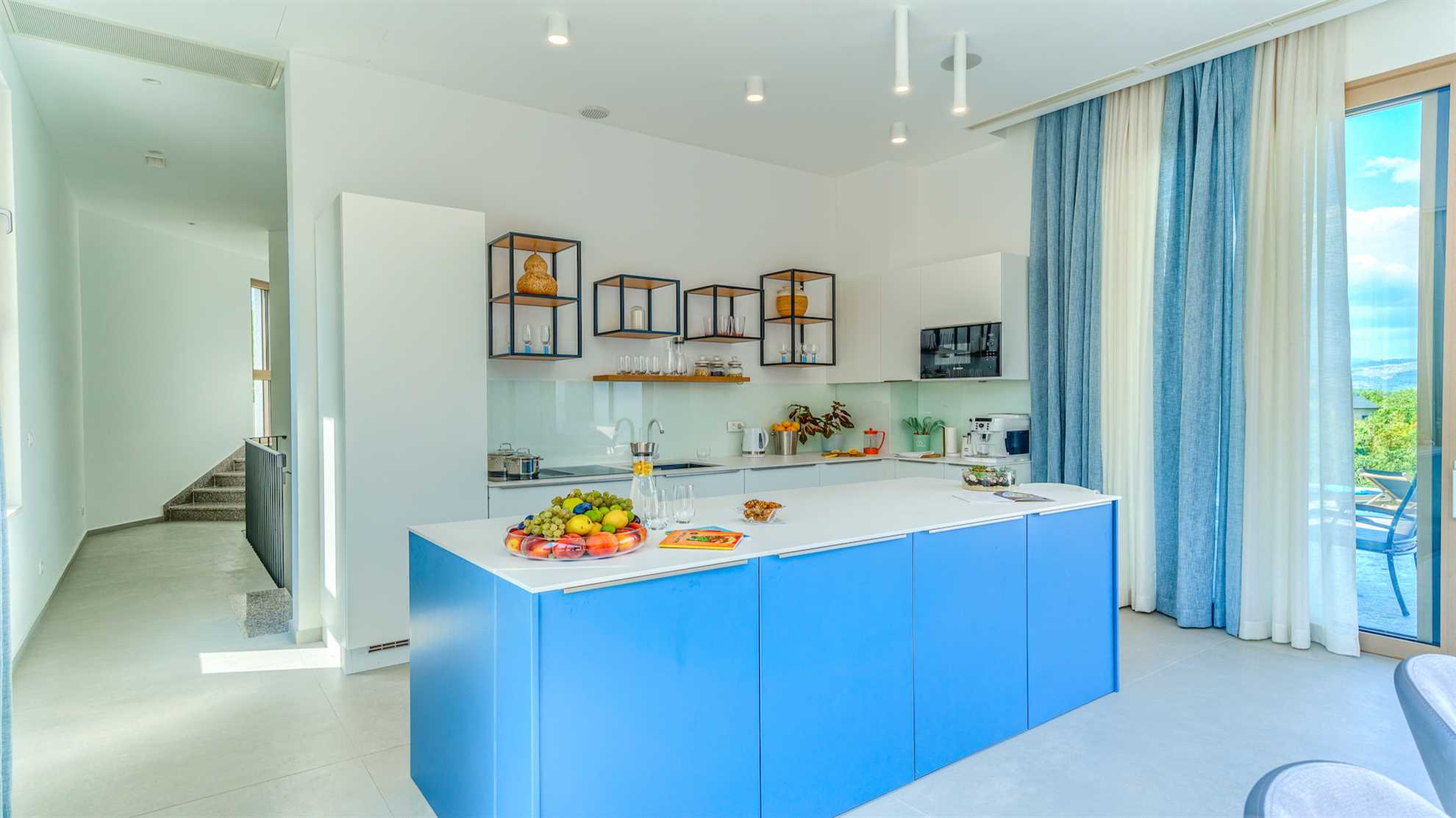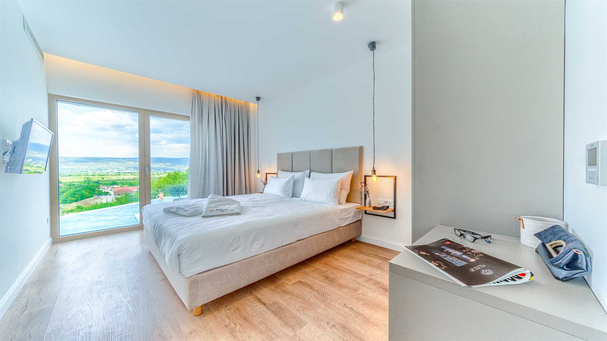 The villa features two wings, each housing en-suite bedrooms. With 5 bedrooms in total, it comfortably accommodates up to ten adult guests, making it an ideal choice for two families or a large group of friends. For larger parties, Sister Villa Daedalus, located next door, is also available and can host an additional 10 guests.