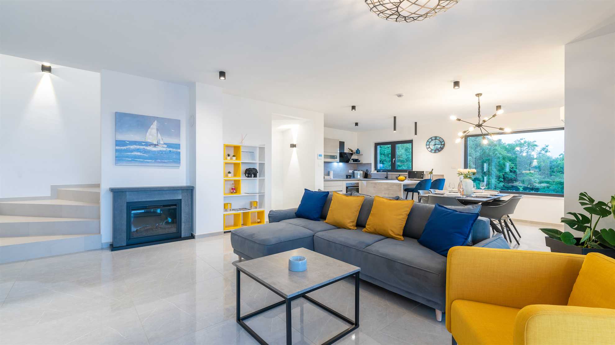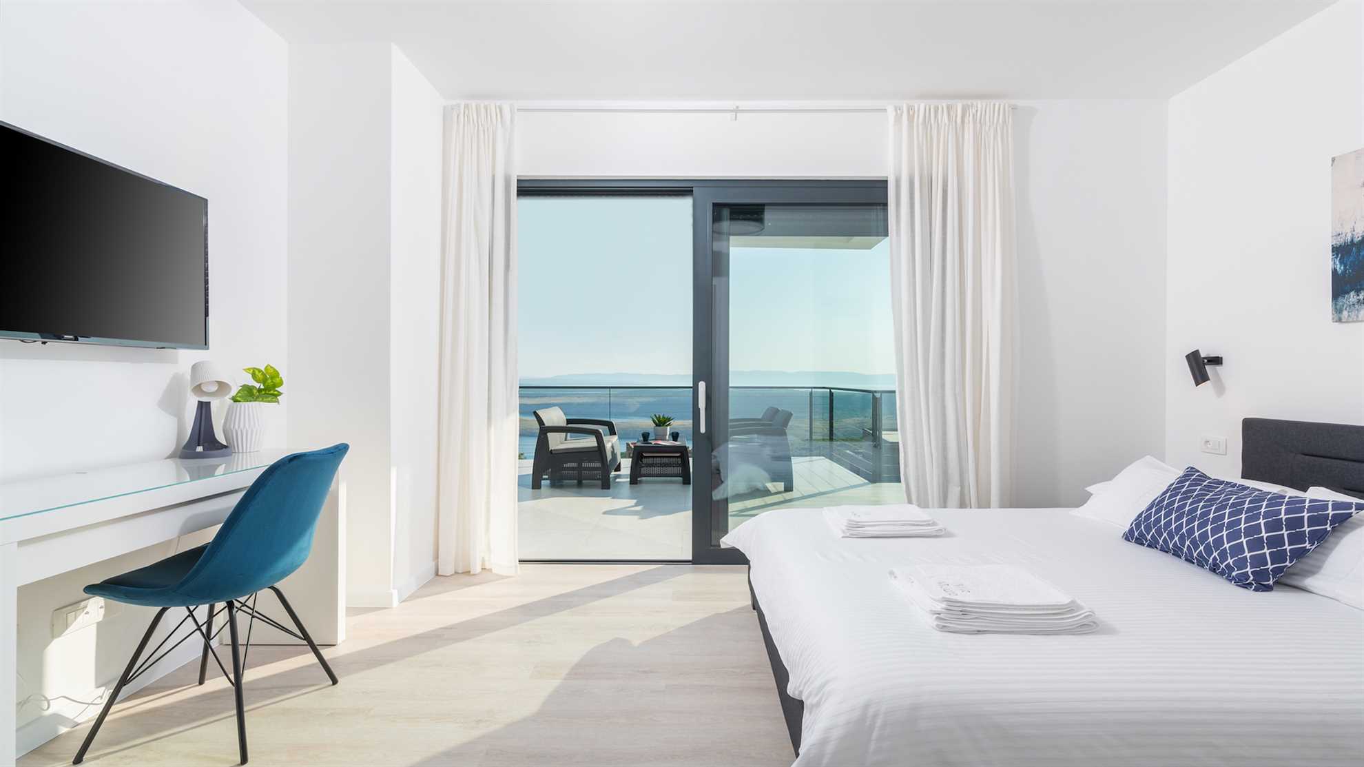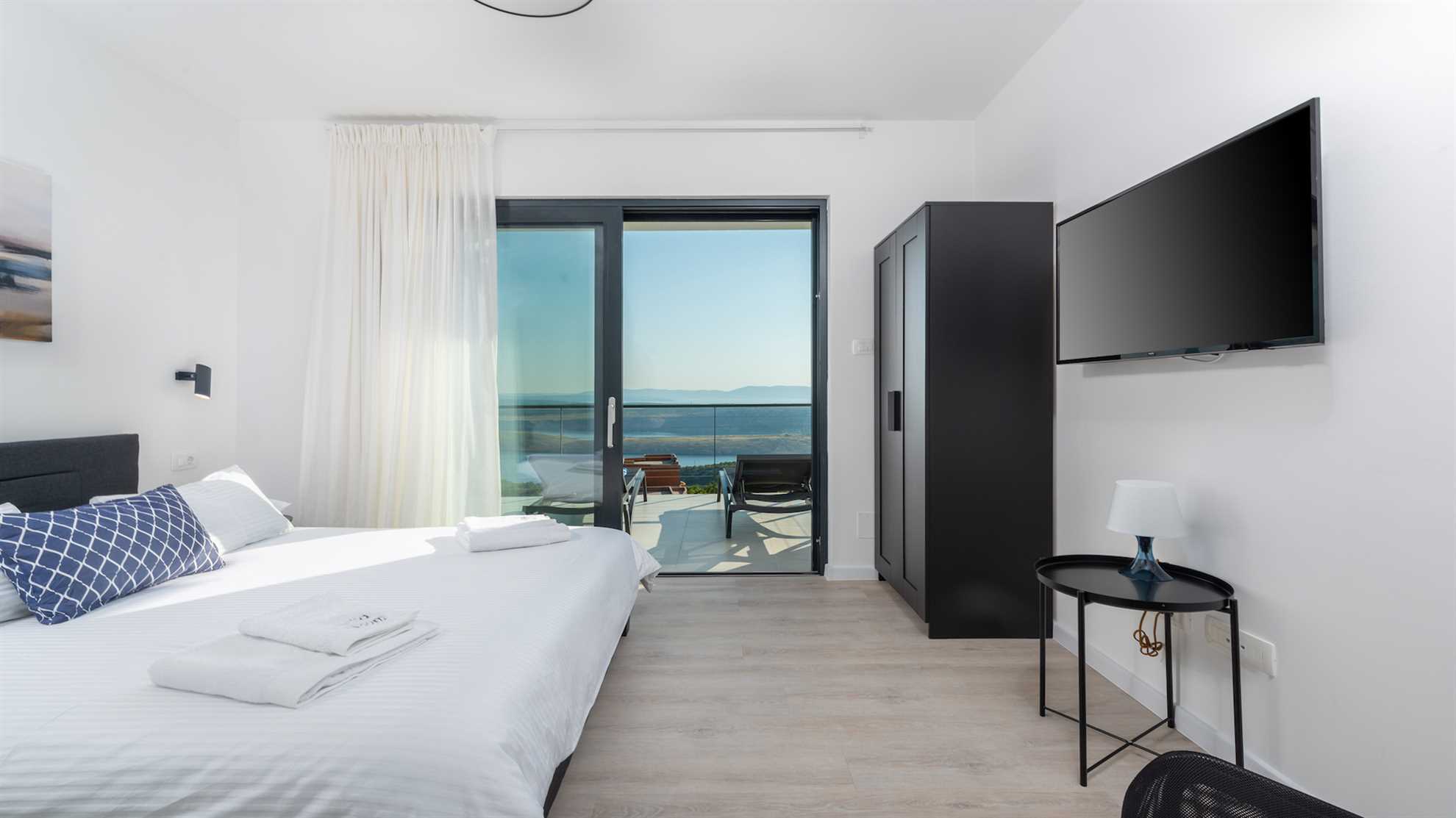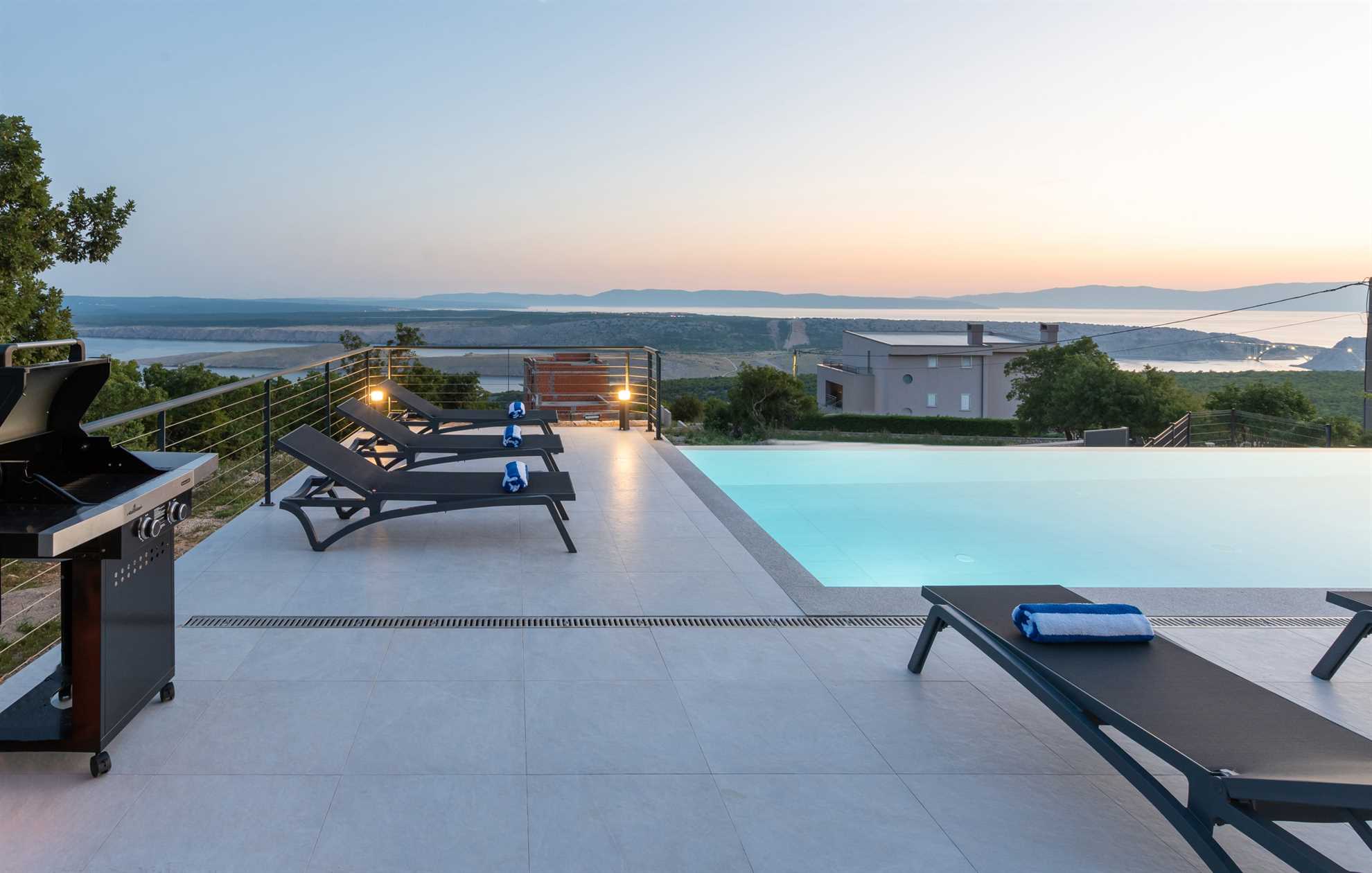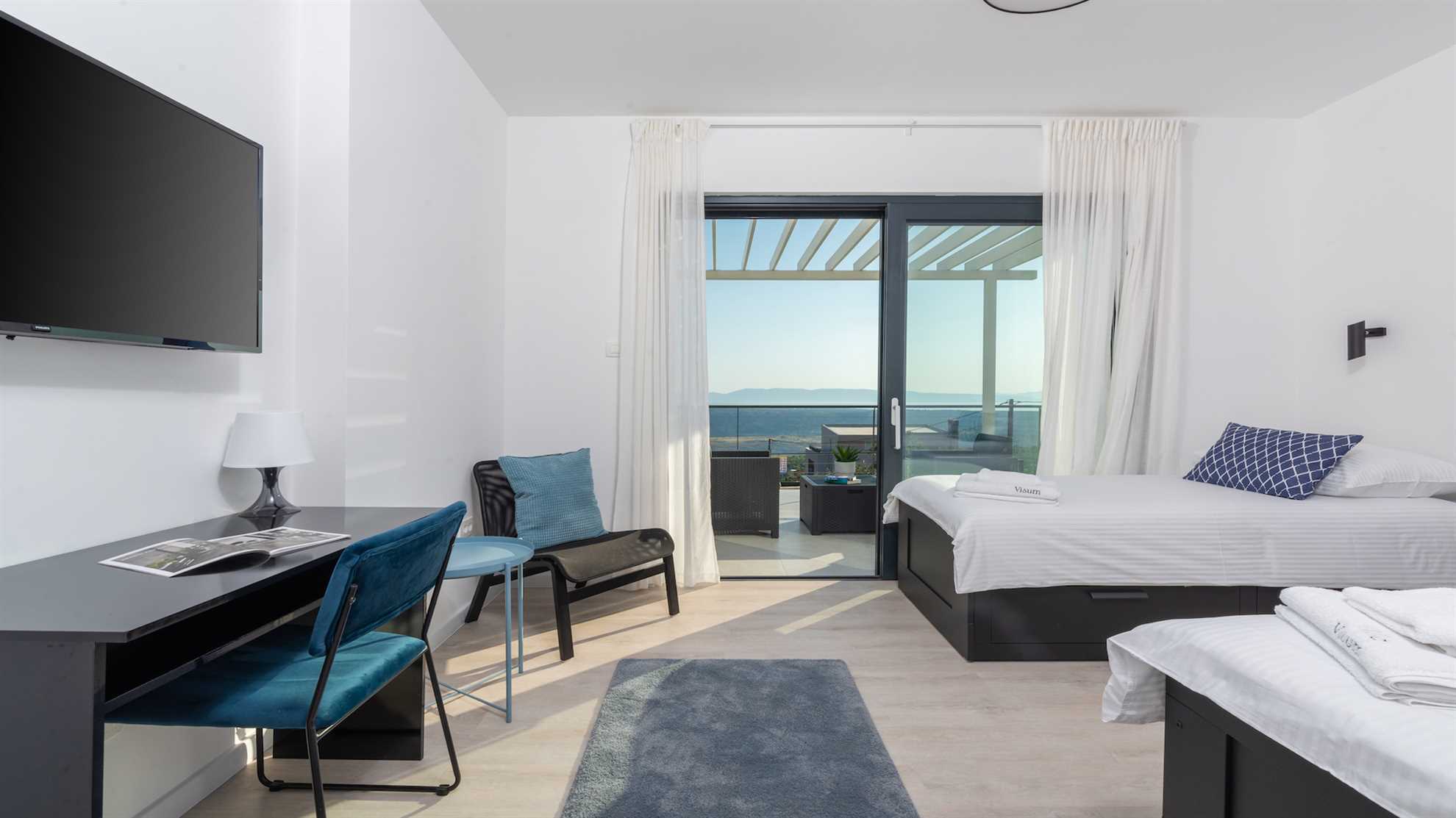 A truly incredible beauty with stunning views, modern facilities and luxuries throughout plus fun for the entire family. There is something romantic and nostalgic about Villa Stella Maris… perhaps it’s the location surrounded by greenery yielding views of the calm majestic Adriatic and the surrounding islands, perhaps it’s the way the sun lights one of its many decks and terraces, perhaps it’s the Mediterranean breeze on a cooler summer evening… perhaps, but we are sure the sweet days spent here will be embedded into your memory. We invite you to enjoy the large pool surrounded by sun loungers, throw together a BBQ at sunset or simply enjoy a lazy afternoon while the little ones splash around in a sectioned shallow end of the pool. Modern and clean design with authentic touches and quirky artwork displayed on white walls, plus a sauna, Jacuzzi and a gym make this gem a treat of a holiday. A specious living room with bright colors, comfortable sofa and a flatscreen TV, a dining lounge and fully equipped kitchen are provided for your enjoyment. Welcome.