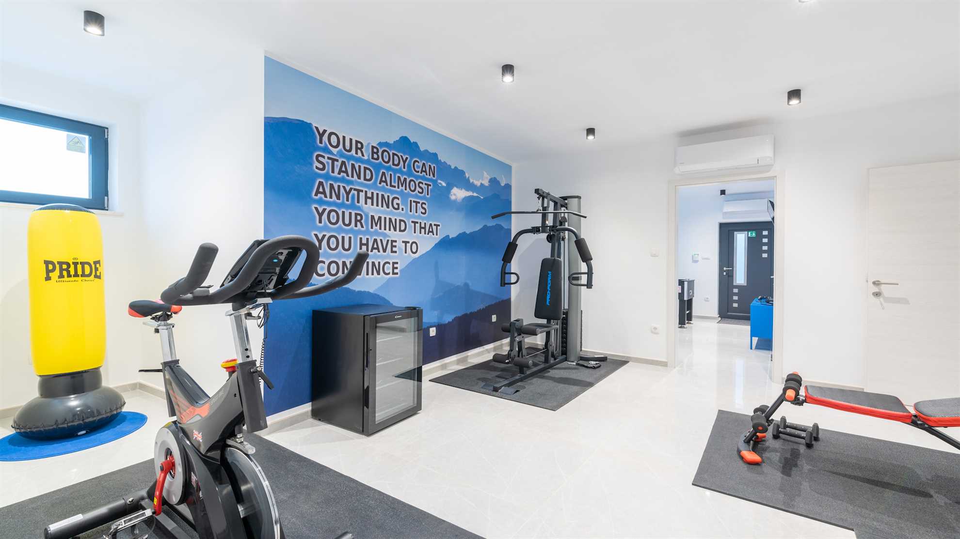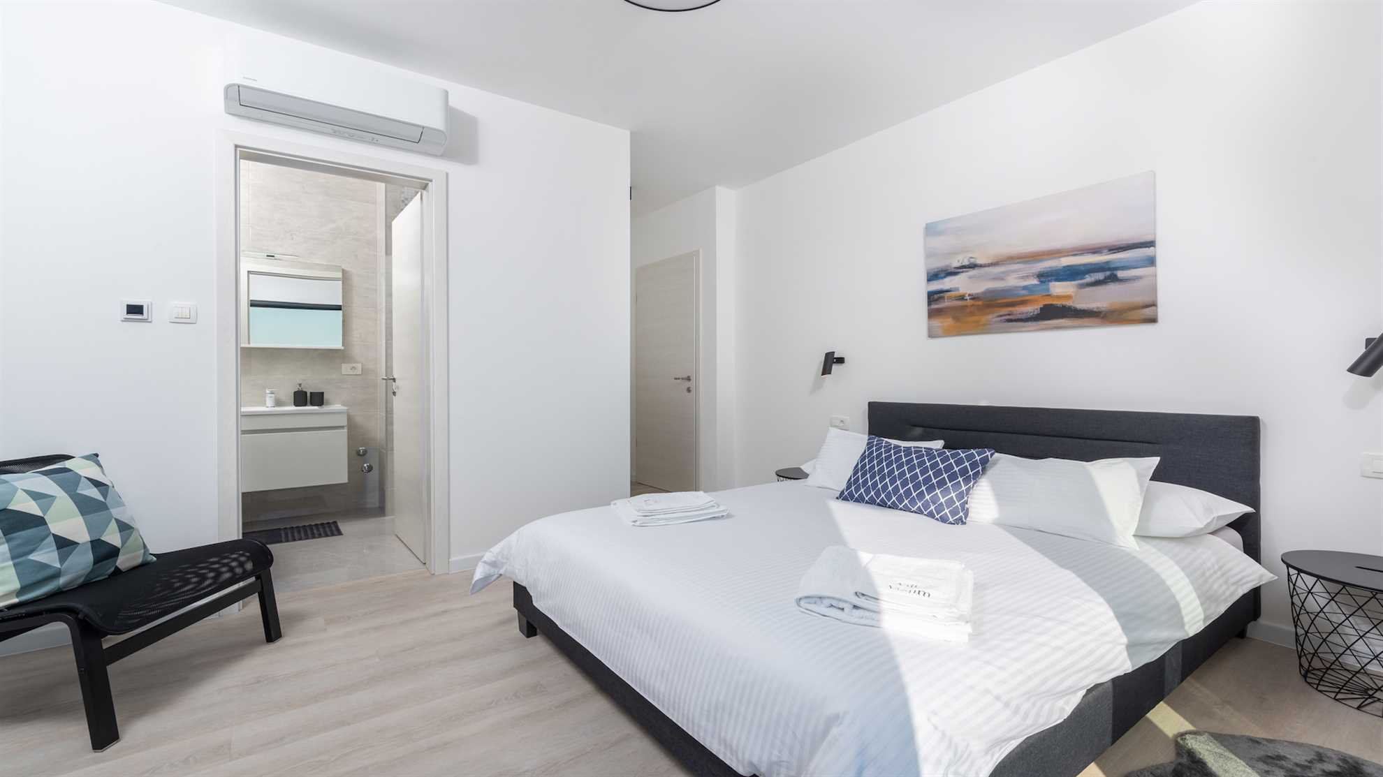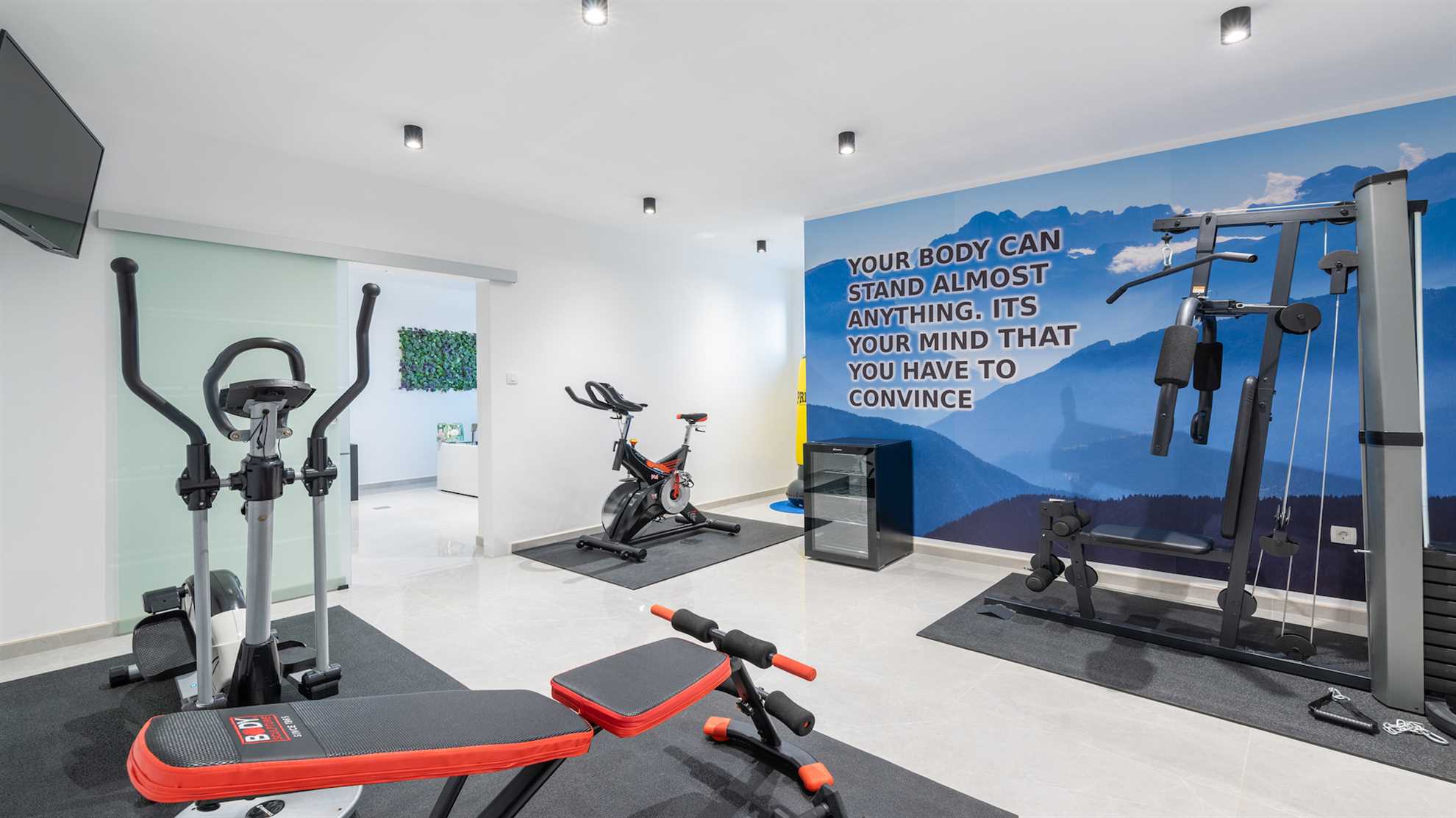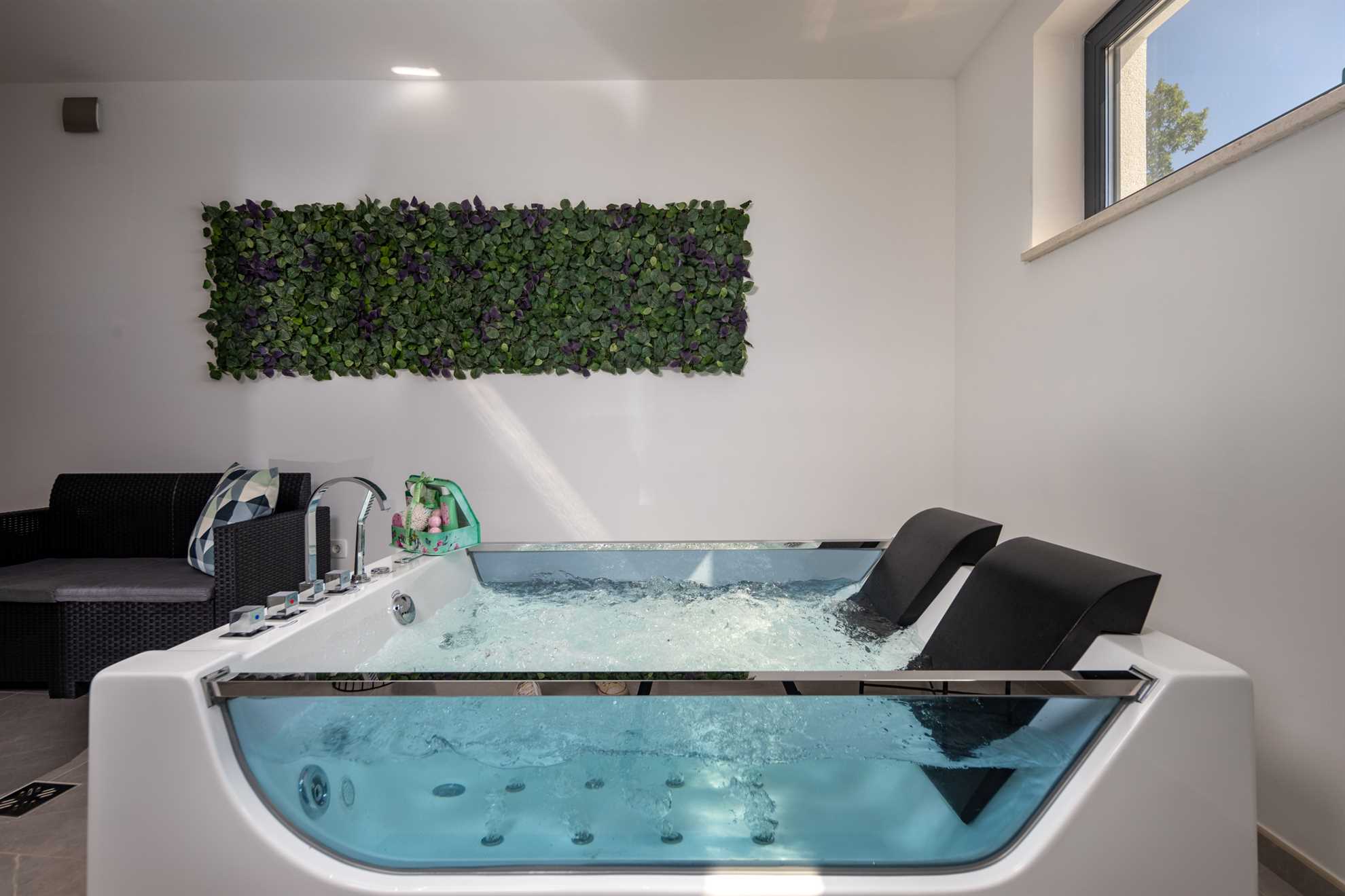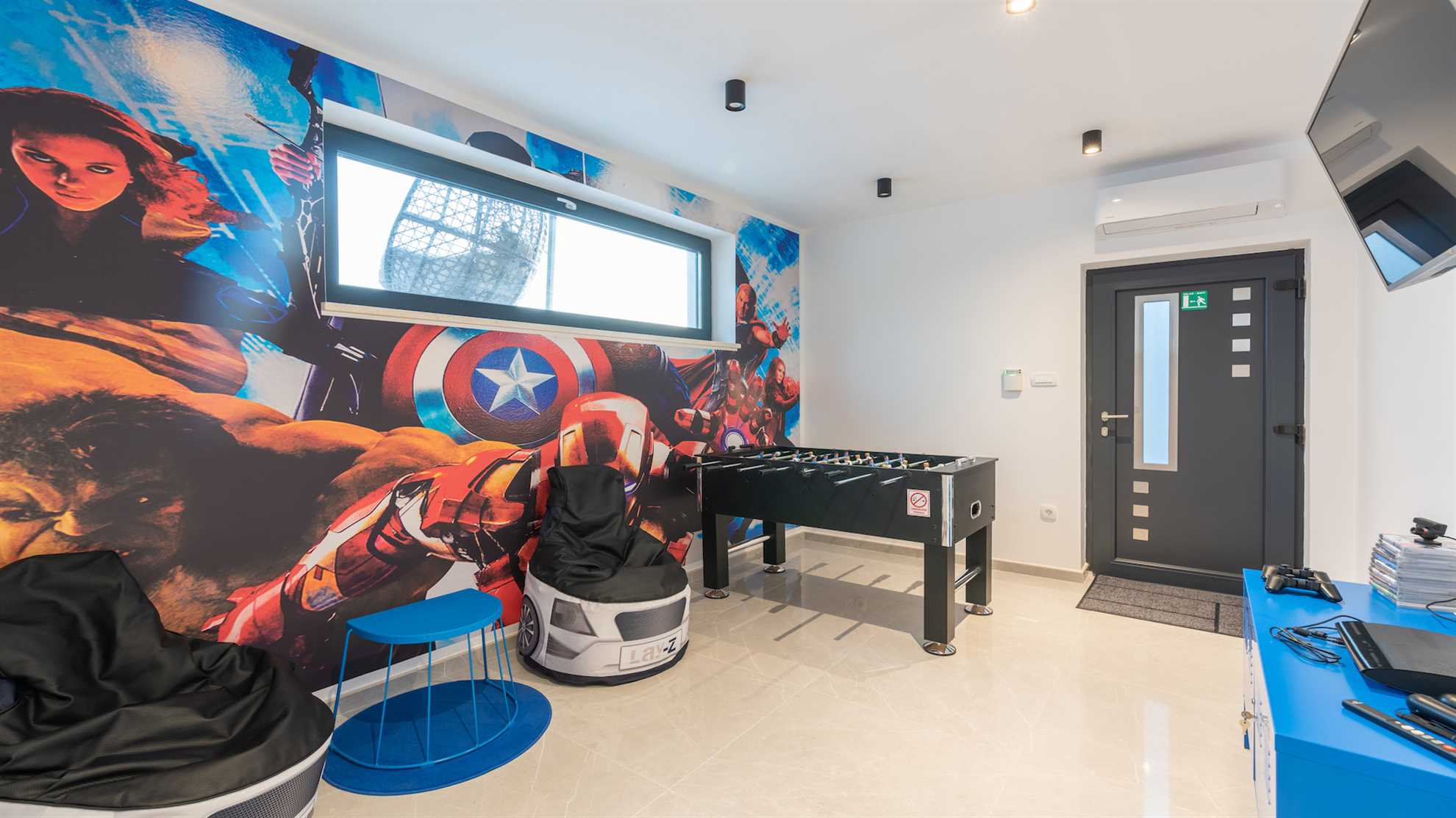 A truly incredible beauty with stunning views, modern facilities and luxuries throughout plus fun for the entire family. There is something romantic and nostalgic about Villa Stella Maris… perhaps it’s the location surrounded by greenery yielding views of the calm majestic Adriatic and the surrounding islands, perhaps it’s the way the sun lights one of its many decks and terraces, perhaps it’s the Mediterranean breeze on a cooler summer evening… perhaps, but we are sure the sweet days spent here will be embedded into your memory. We invite you to enjoy the large pool surrounded by sun loungers, throw together a BBQ at sunset or simply enjoy a lazy afternoon while the little ones splash around in a sectioned shallow end of the pool. Modern and clean design with authentic touches and quirky artwork displayed on white walls, plus a sauna, Jacuzzi and a gym make this gem a treat of a holiday. A specious living room with bright colors, comfortable sofa and a flatscreen TV, a dining lounge and fully equipped kitchen are provided for your enjoyment. Welcome.