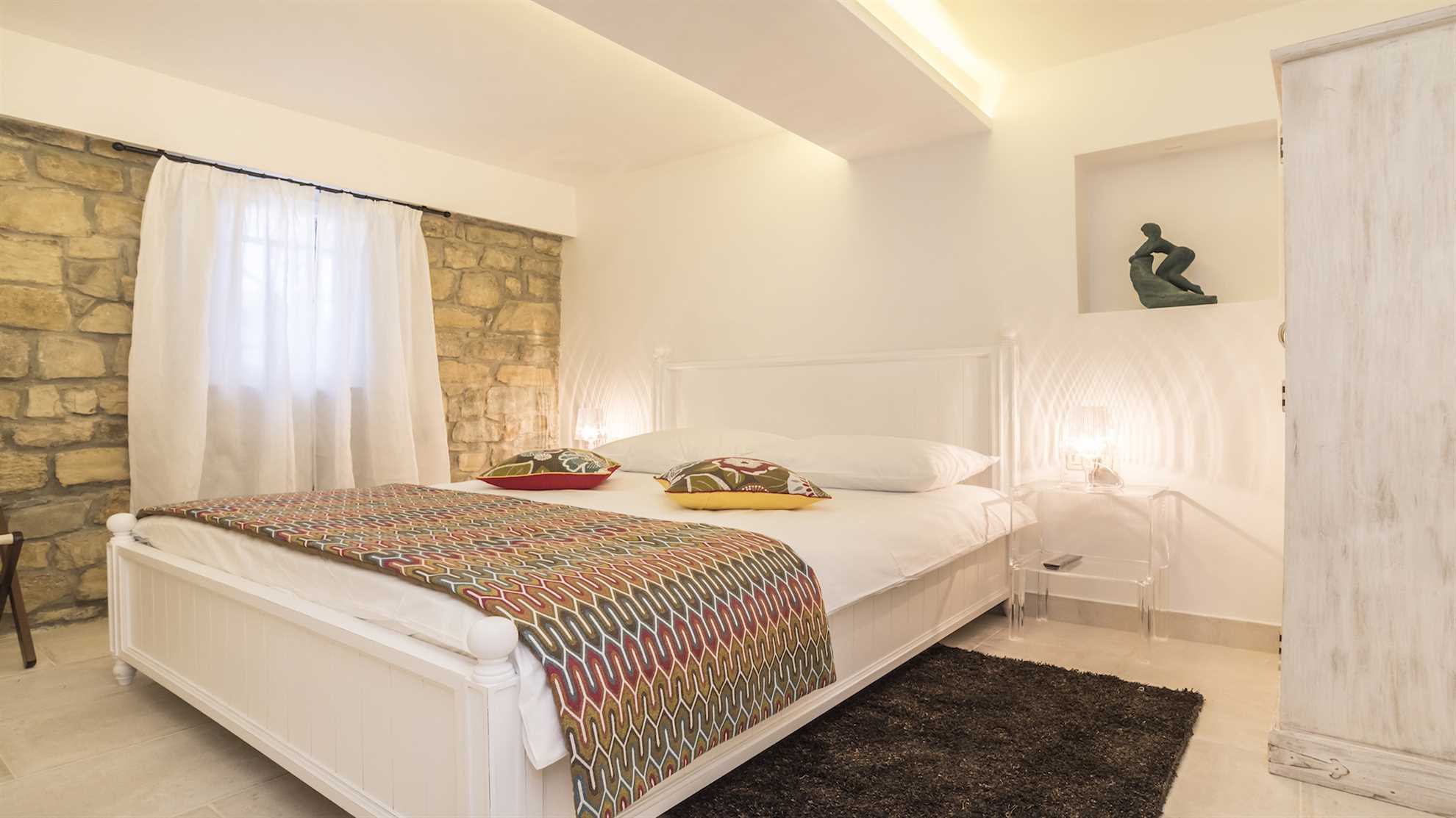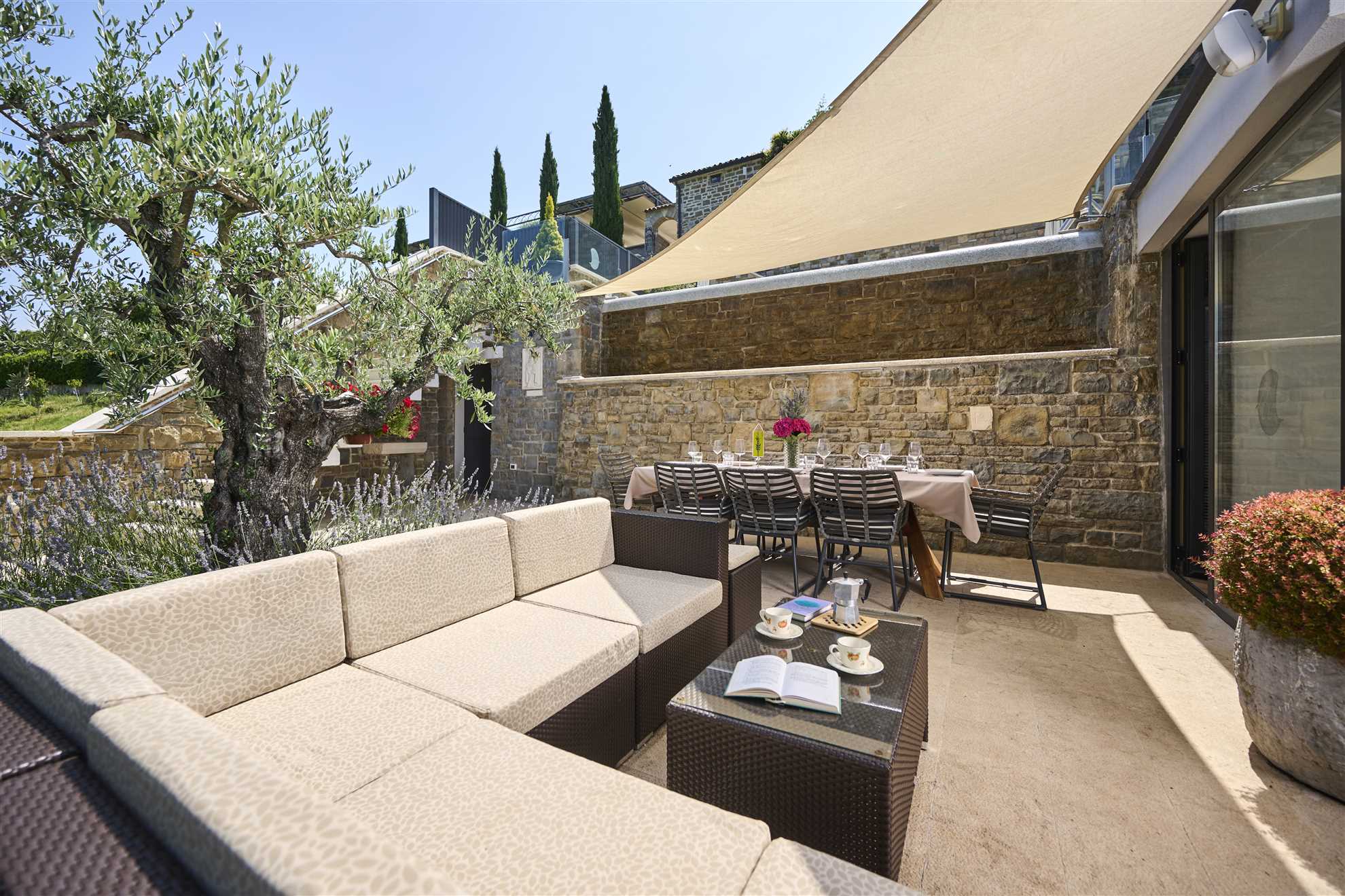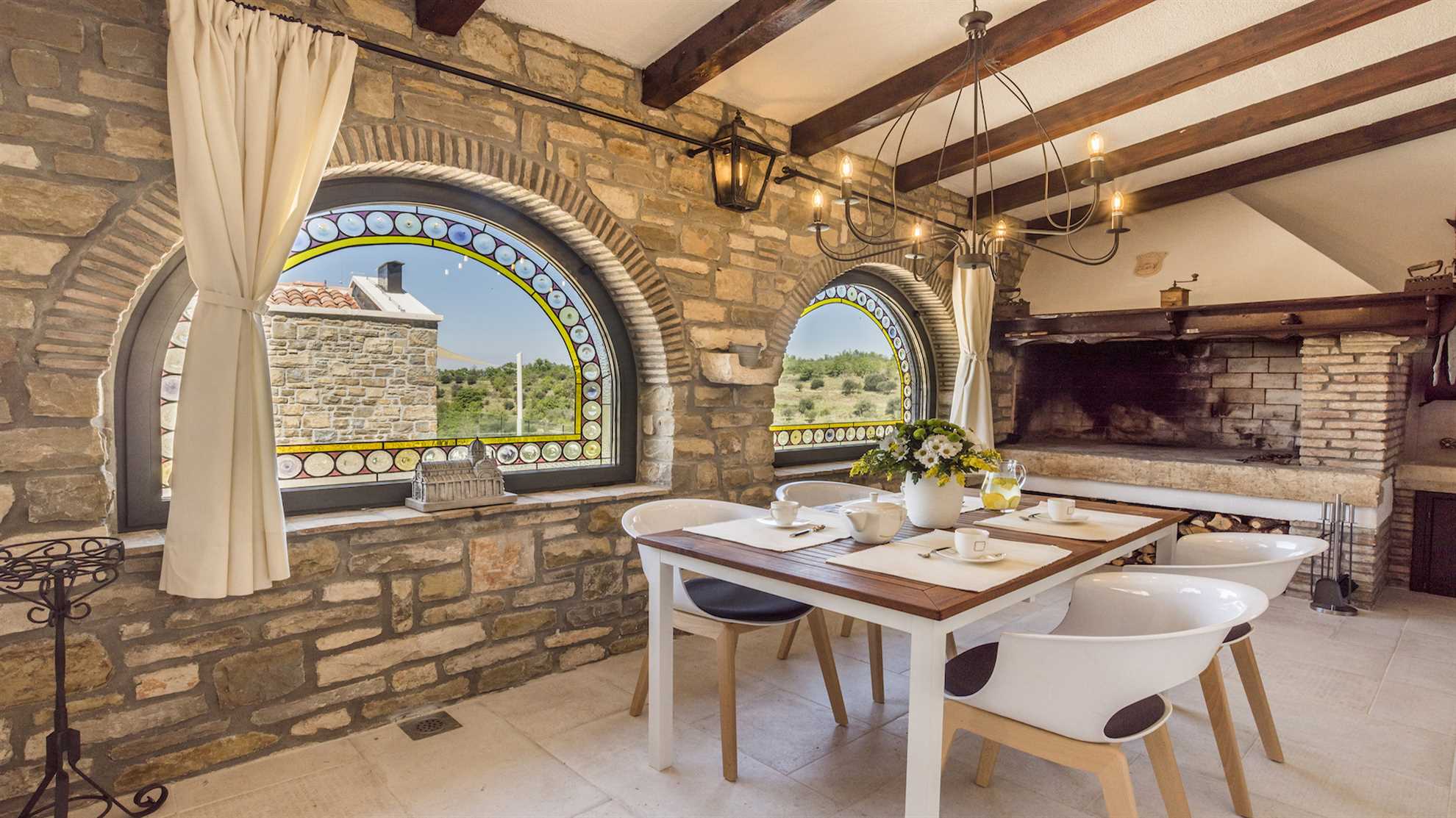 Contemporary villa with exceptional amenities and unique layout equipped for an unforgettable holiday. Perched on a hill it offers delightful views of the landscape. Three living units make it a perfect choice for 2 or more families or a large group of friends as it offers plenty of privacy with separate sleeping areas as well as a unit designated specifically for leisurely activities. No luxury is spared on design which is equally modern, warm, inviting, timeless and cozy, with exposed wood beams, parquet floors, exposed stone walls, authentic fireplace, charming light fixtures and specious bedrooms. One unit consists of a traditional “tavern” with a dining room for eight, and two bedrooms, one on each floor, each with a private bathroom and a lounge area. Second unit offers a fully equipped kitchen, dining area, living room with a fireplace and two bedrooms, one on each floor, each with a private bathroom. The third, fun equipped unit, completes the luxury villa with a wellness area featuring a jacuzzi, sauna, a separate shower, another fully equipped kitchen with access to a terrace with an alfresco dining table and BBQ facilities, and the entertainment room with a pool table and table football. Air conditioning is available throughout. Welcome to Villa Fortezza.