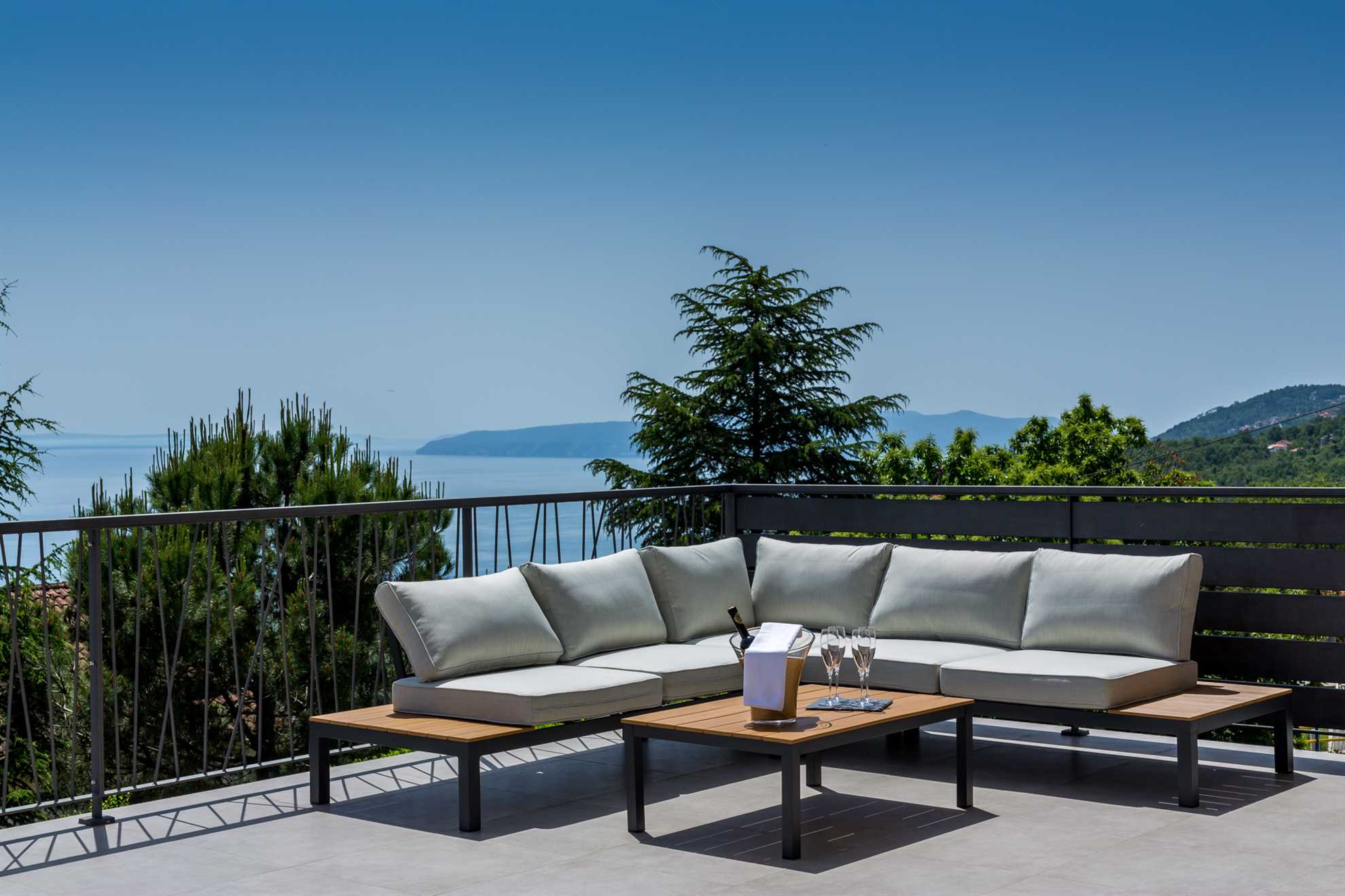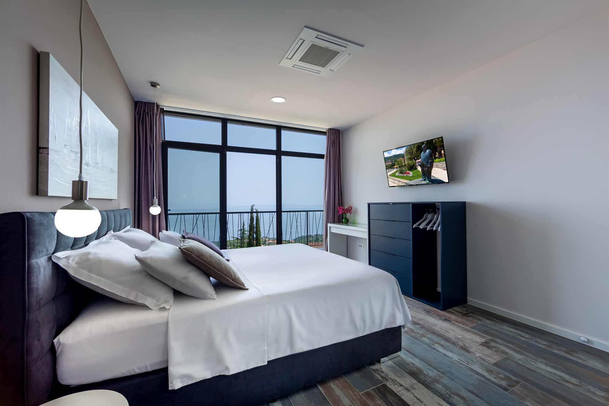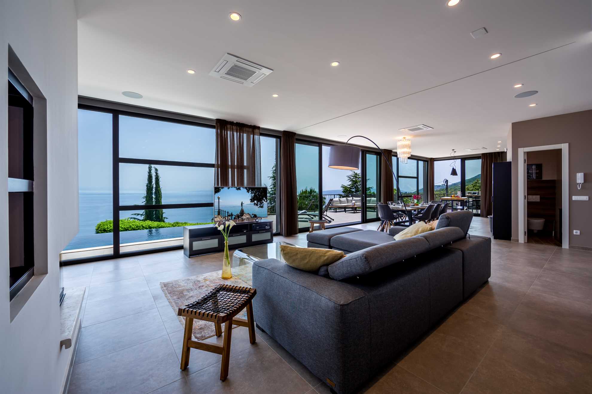 A stunning, luxurious Villa offering breath taking views of the Adriatic set on a hillside nearby Istria’s longest standing and most prestigious holiday destination, the city of Opatija. Spread over 450 m² with windows stretching from floor to ceiling, contemporary and exquisitely designed interior, comfortable and eye pleasing furnishings, stylish artworks, plus a living and dining area including sea views Villa Grand Vision is a place to exhale, relax and enjoy. Gorgeous outdoor infinity pool, a balcony the width of the villa, a terrace with an outdoor dining and BBQ area, a sauna and a jacuzzi are all there making sure you will wish for nothing in making your holiday one to be remembered. Elegant and specious en-suite bedrooms provide sea views, and each comes equipped with your very own flat screen TV. However you choose to spend your holiday, this splendid gem has it all! Welcome to Istria!