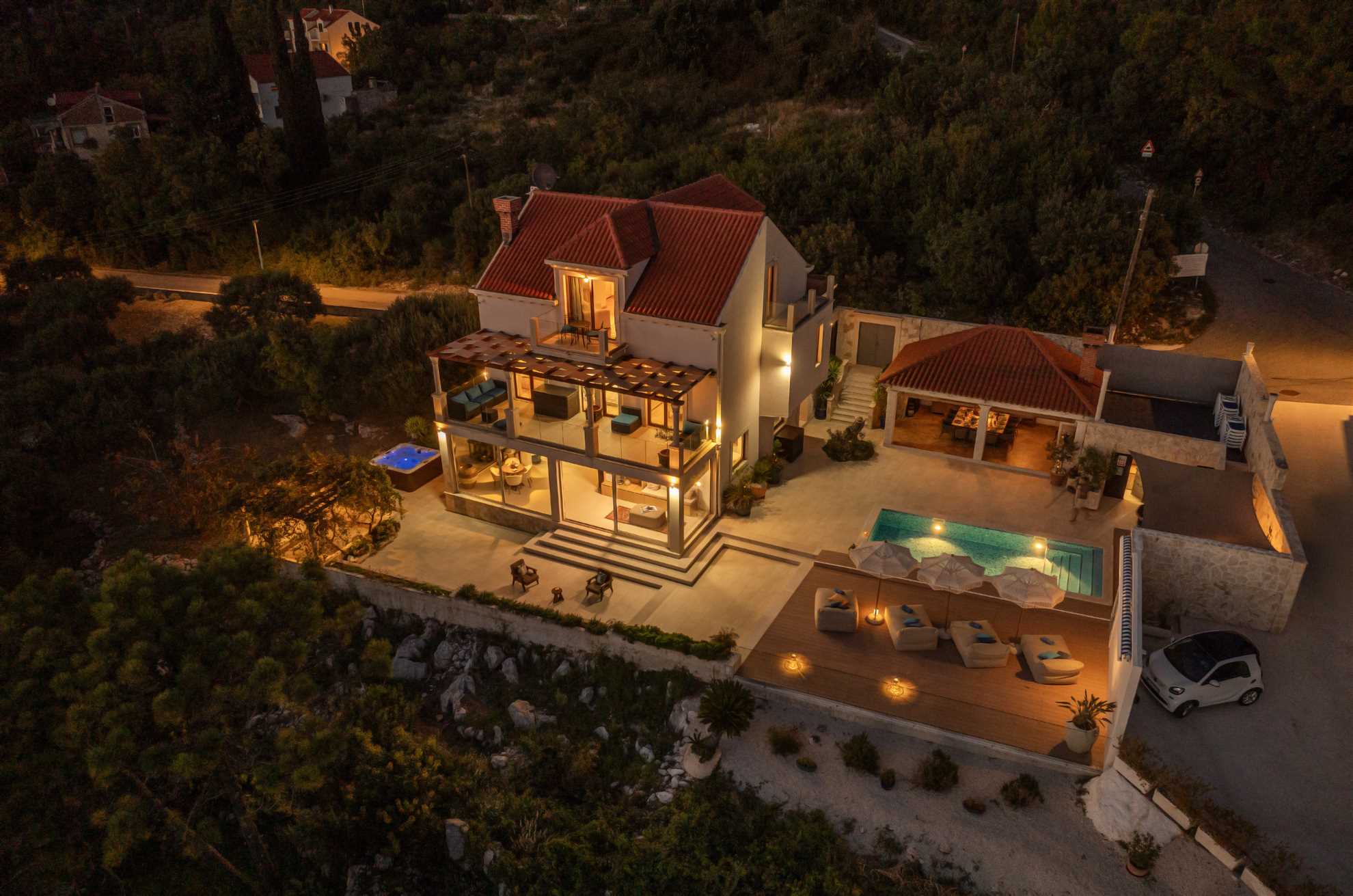 Villa Paradiso is a serene retreat nestled into the picturesque Dalmatian hillside, gazing out over the glistening Adriatic Sea. Featuring a 25m2 outdoor heated pool, 14 inviting sun-beds, an outdoor shower, and numerous cozy seating areas, this property exudes an atmosphere of pure relaxation. Its expansive terrace boasts a Jacuzzi, summer kitchen, outdoor fireplace and BBQ, and alfresco dining area perfect for enjoying leisurely meals outdoors. Take in the awe-inspiring vistas of the sea and surrounding Dalmatian landscape, adorned with elegant cypress and pine trees, at any hour of the day. This villa is an ideal venue for weddings, birthdays, or any occasion deserving of a special celebration. Each bedroom, with its own charm, offers unique allure, including breathtaking sea views. The spacious kitchen, complete with a central island, is fully equipped for hosting gatherings and entertaining guests.