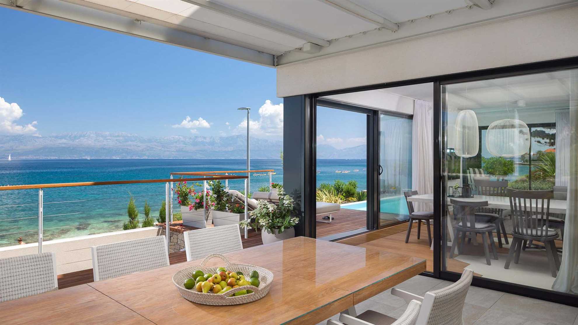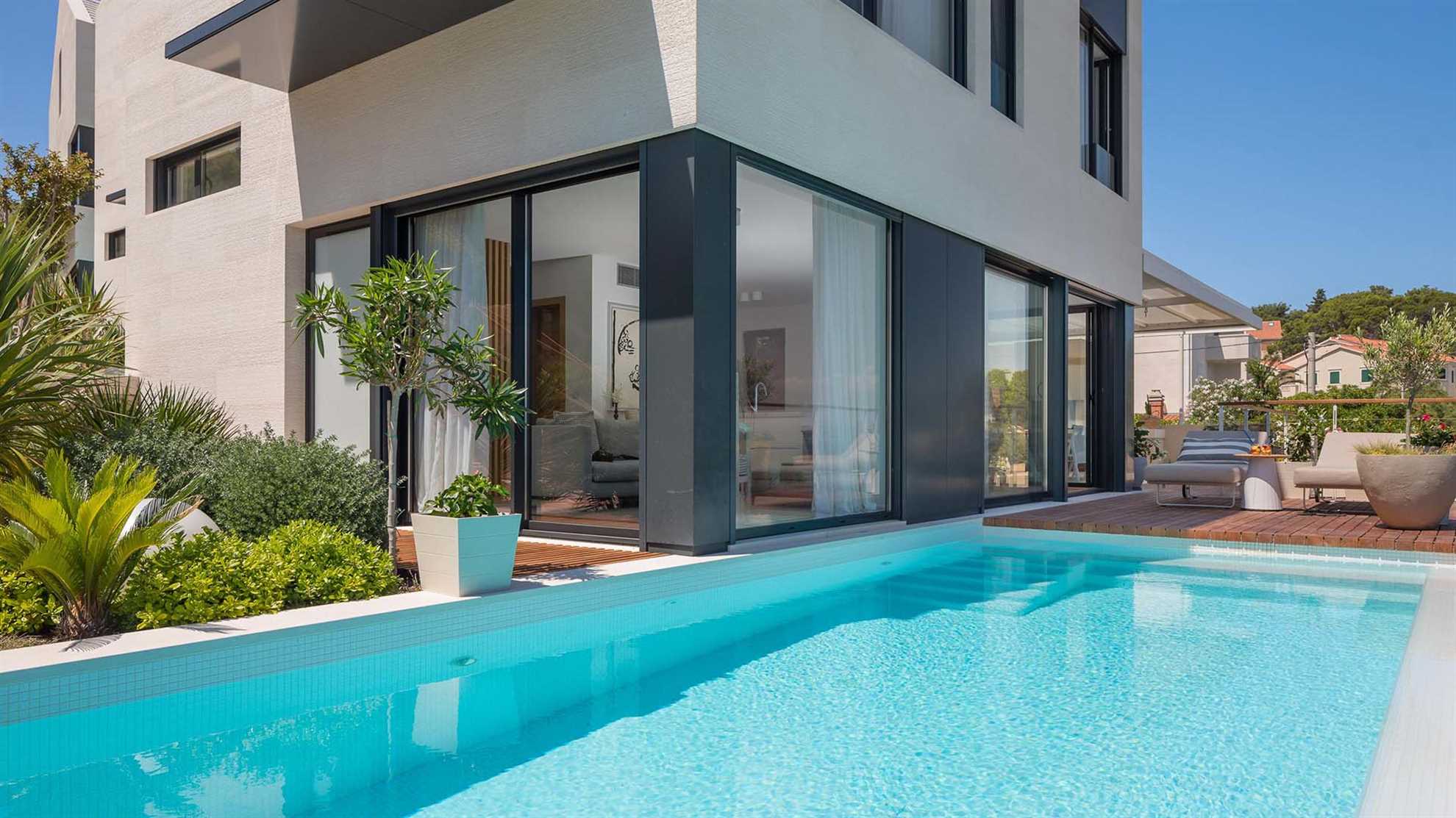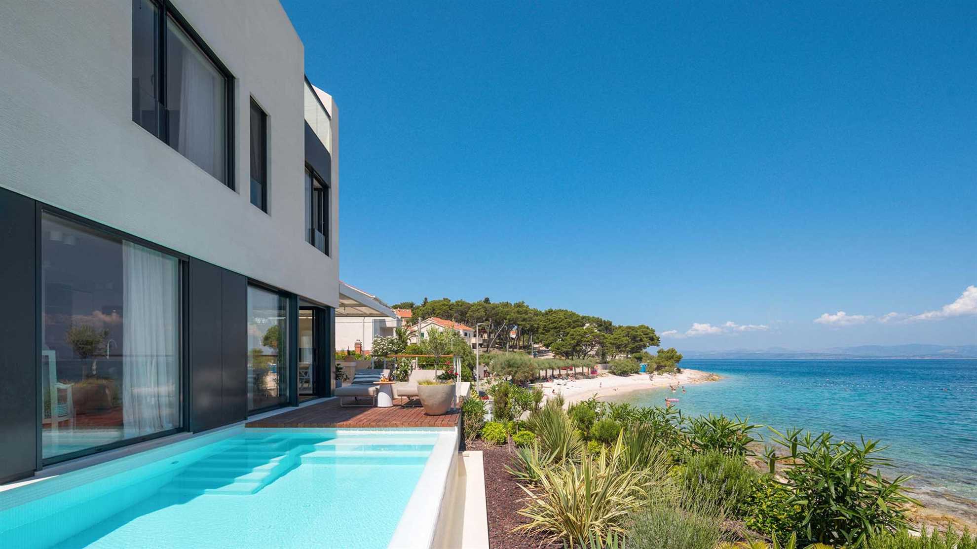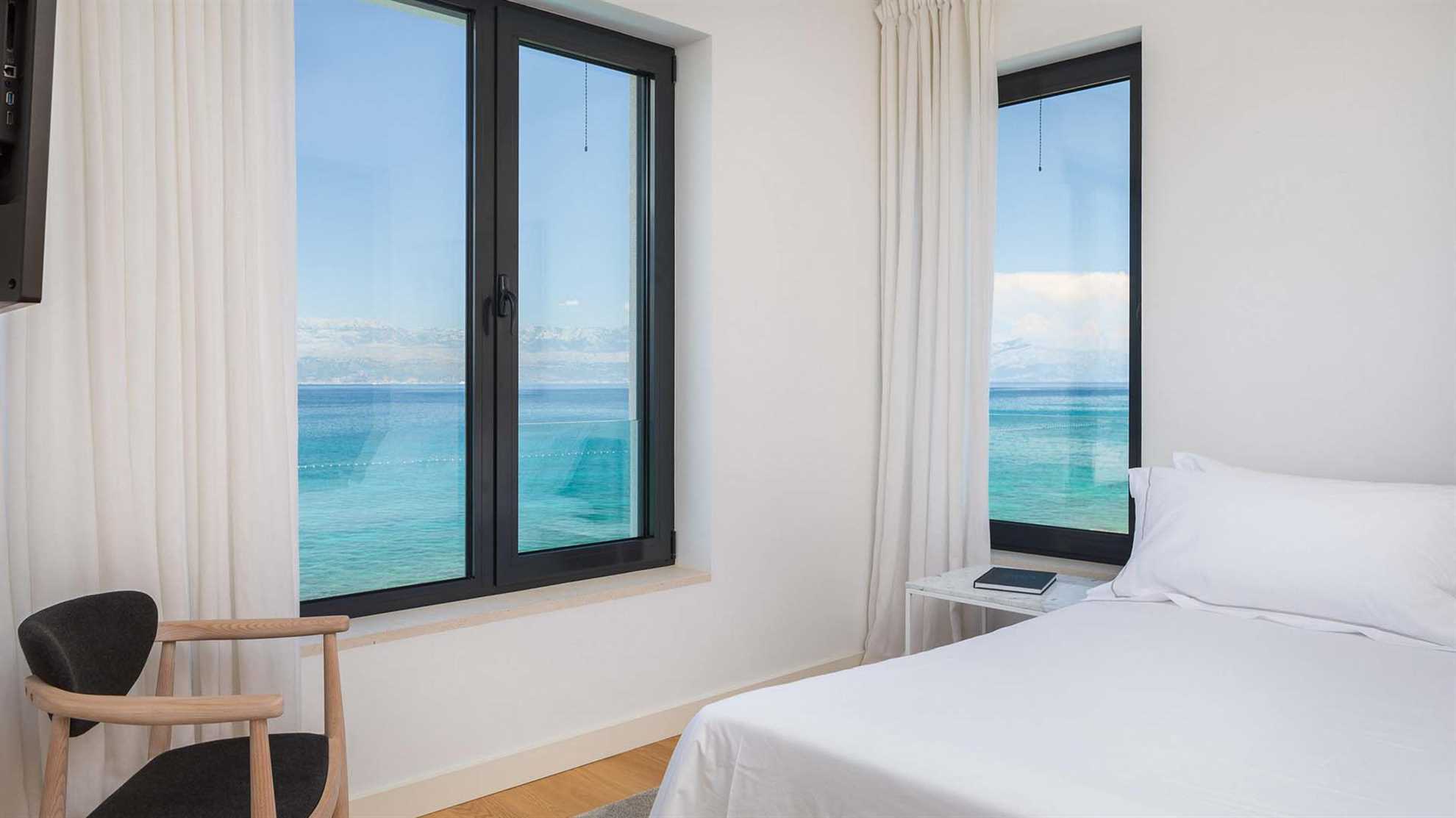 This amazing, modern poolside villa was made everyone looking for a true island life experience with lots of glamour. Its location right next to the beach tells you about one of the unknown privileges of the people living on Dalmatian islands – the perfect wake-up routine that is to get out of the bed and jump right into the sea. Better than coffee or any other morning ritual you may have, this will be your favorite part of the vacation. In case you want privacy, the infinity pool in front of the villa is the perfect solution. The interior of the house is just as delightful as the outdoors. Decorated with elegance and great attention to every little detail, you will especially love the luminous kitchen next to the terrace. The glass walls oriented towards the sea let a lot of light in, so preparing any meal will be a delight.