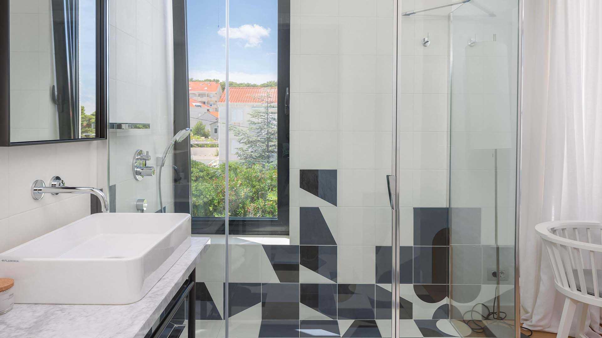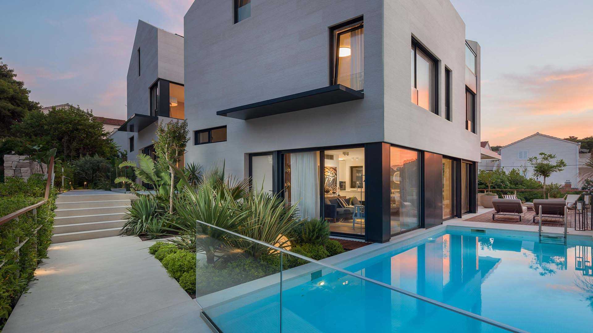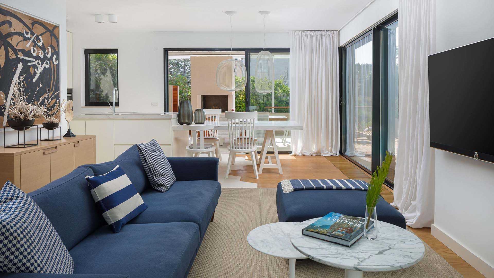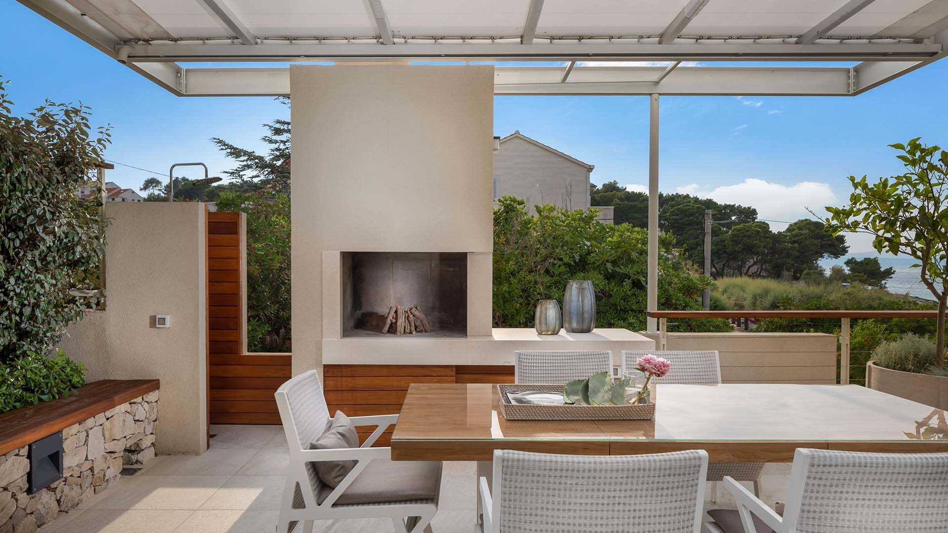 The elegant and luxurious villa tells you a story about joining the winders of modern build and design with the best of the island tradition. What speaks more about interpolation of the tradition with class than a modern villa with white stone walls or a wooden barbecue nestled into an elegant, white fireplace? The charming living area of the house opens up to the shaded terrace through a glass wall where you will enjoy the perfect morning coffee, an afternoon cocktail of a dinner while enjoying the sunset. Brač is an island famous for its white stone quarries, so what choice did the interior designers have than to use deep blue color and stone to decorate the villa’s interior? The bedrooms were decorated for your ultimate comfort, and the litlle glass balconies in hidden in the villa’s exterior walls are there for a breath of fresh air far away from nosy looks.