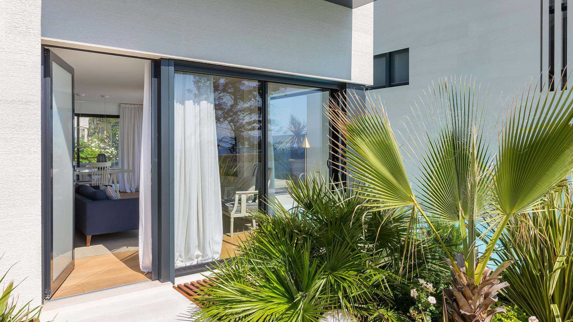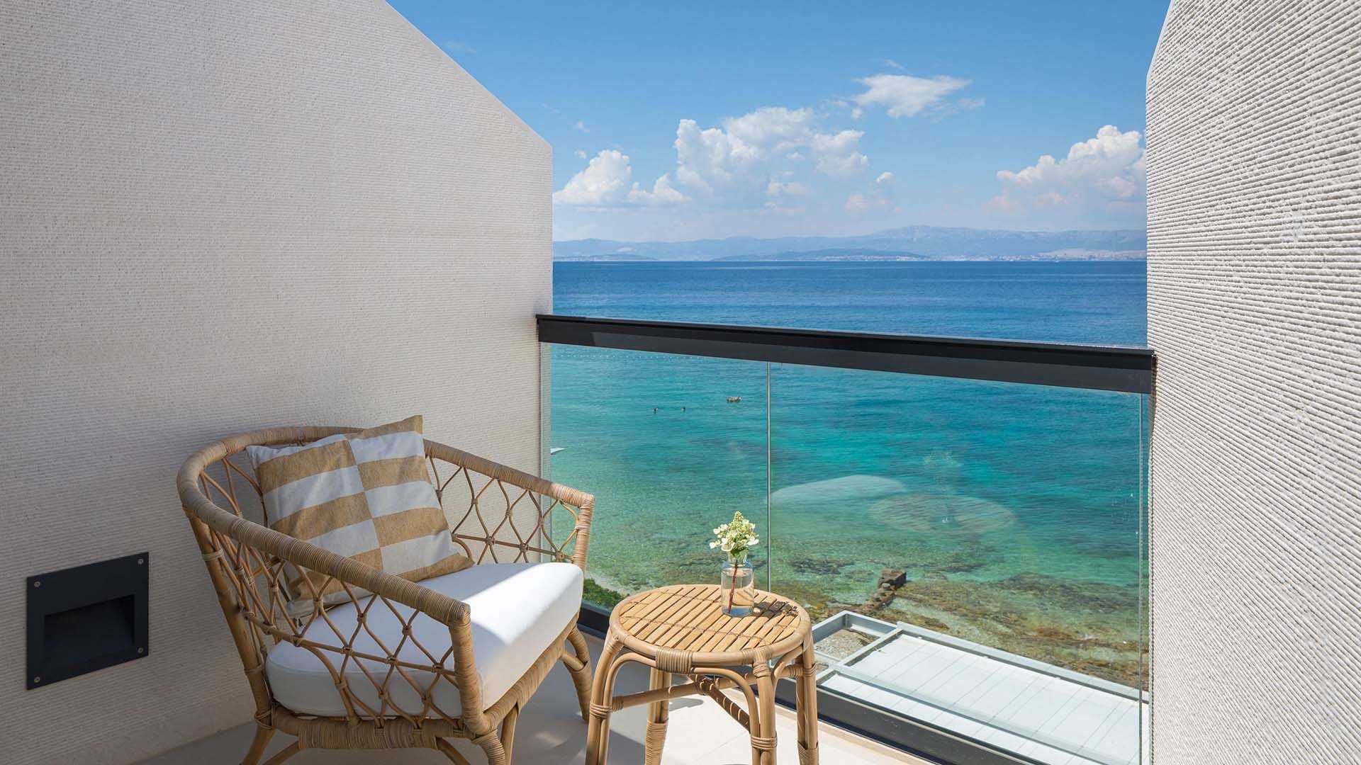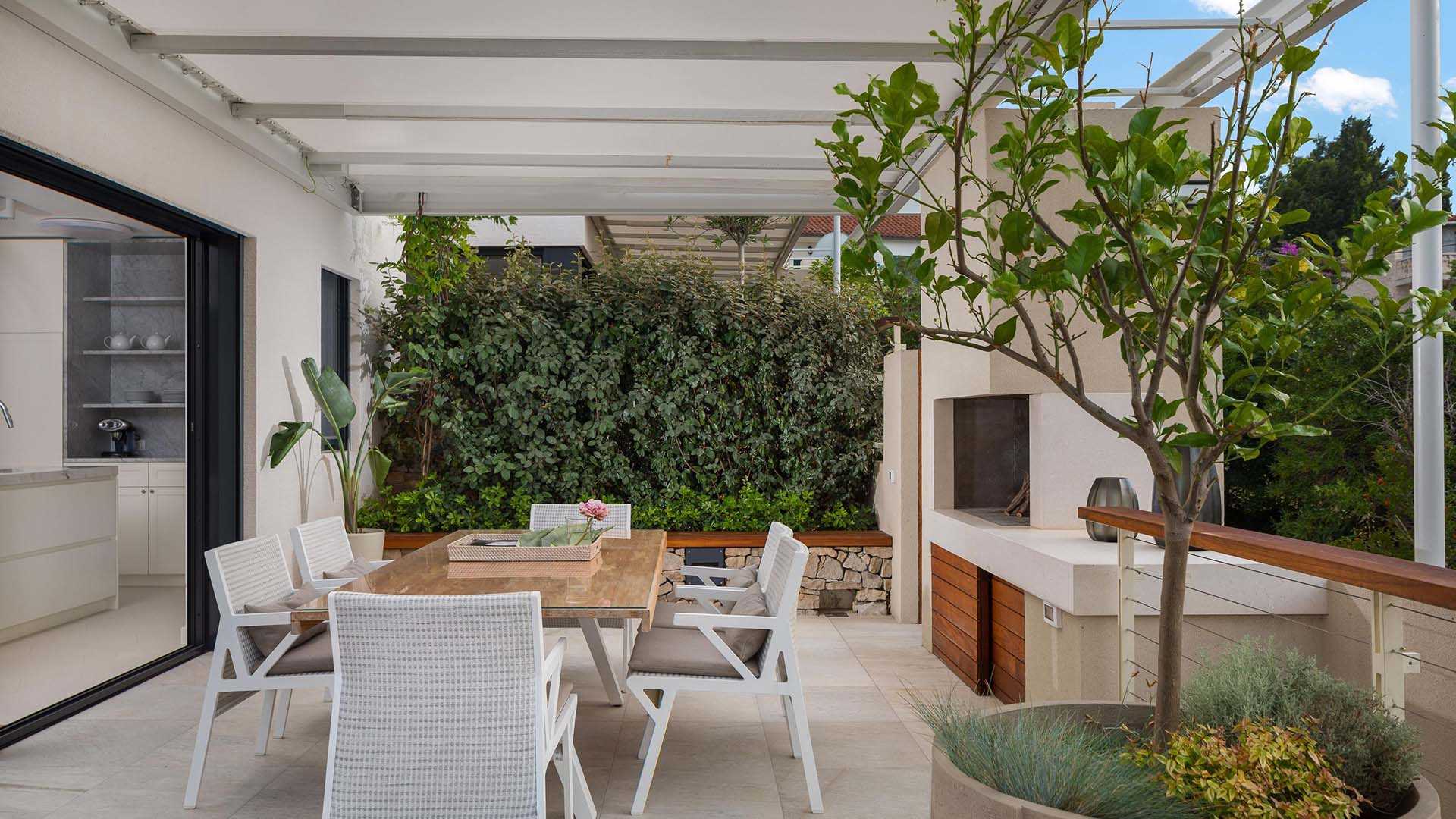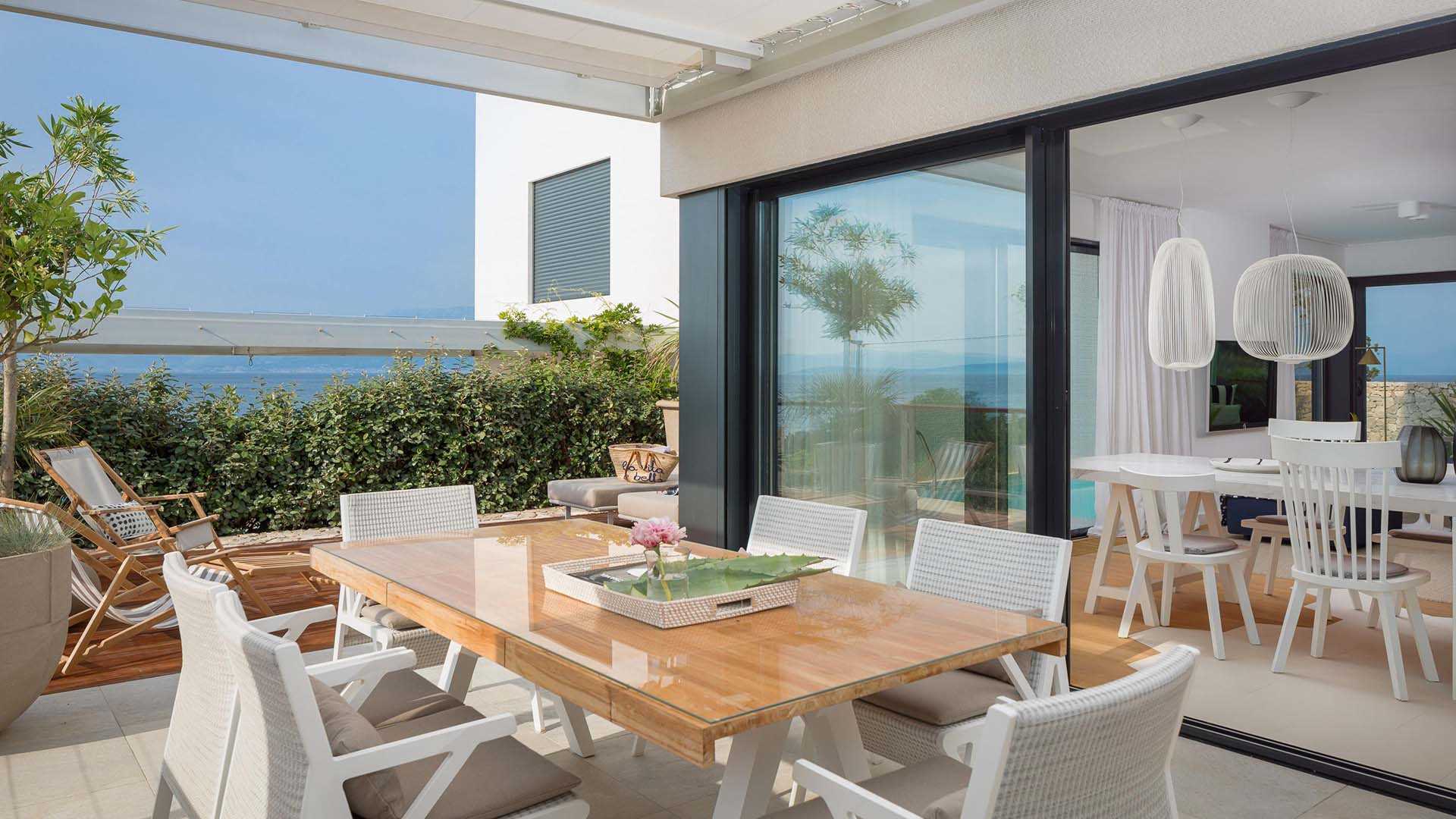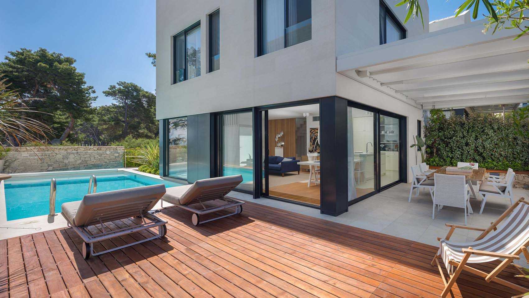 The elegant and luxurious villa tells you a story about joining the winders of modern build and design with the best of the island tradition. What speaks more about interpolation of the tradition with class than a modern villa with white stone walls or a wooden barbecue nestled into an elegant, white fireplace? The charming living area of the house opens up to the shaded terrace through a glass wall where you will enjoy the perfect morning coffee, an afternoon cocktail of a dinner while enjoying the sunset. Brač is an island famous for its white stone quarries, so what choice did the interior designers have than to use deep blue color and stone to decorate the villa’s interior? The bedrooms were decorated for your ultimate comfort, and the litlle glass balconies in hidden in the villa’s exterior walls are there for a breath of fresh air far away from nosy looks.
