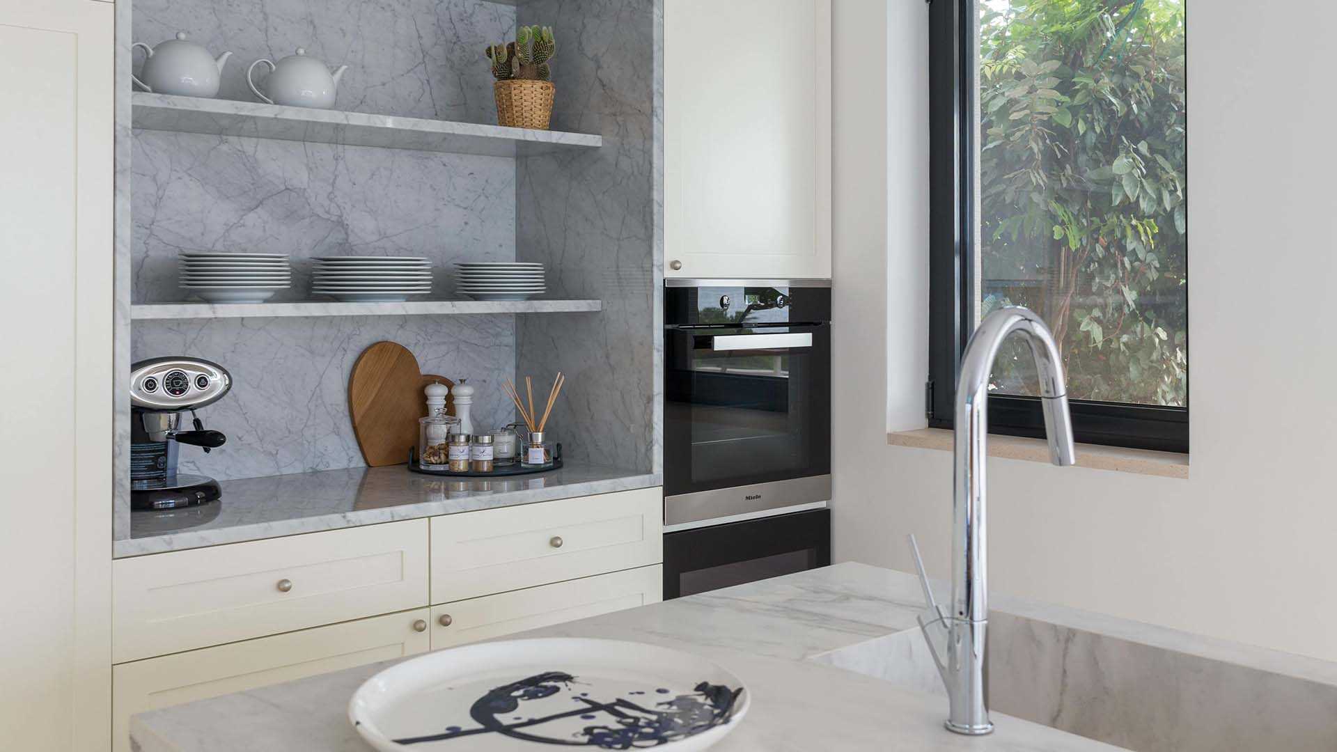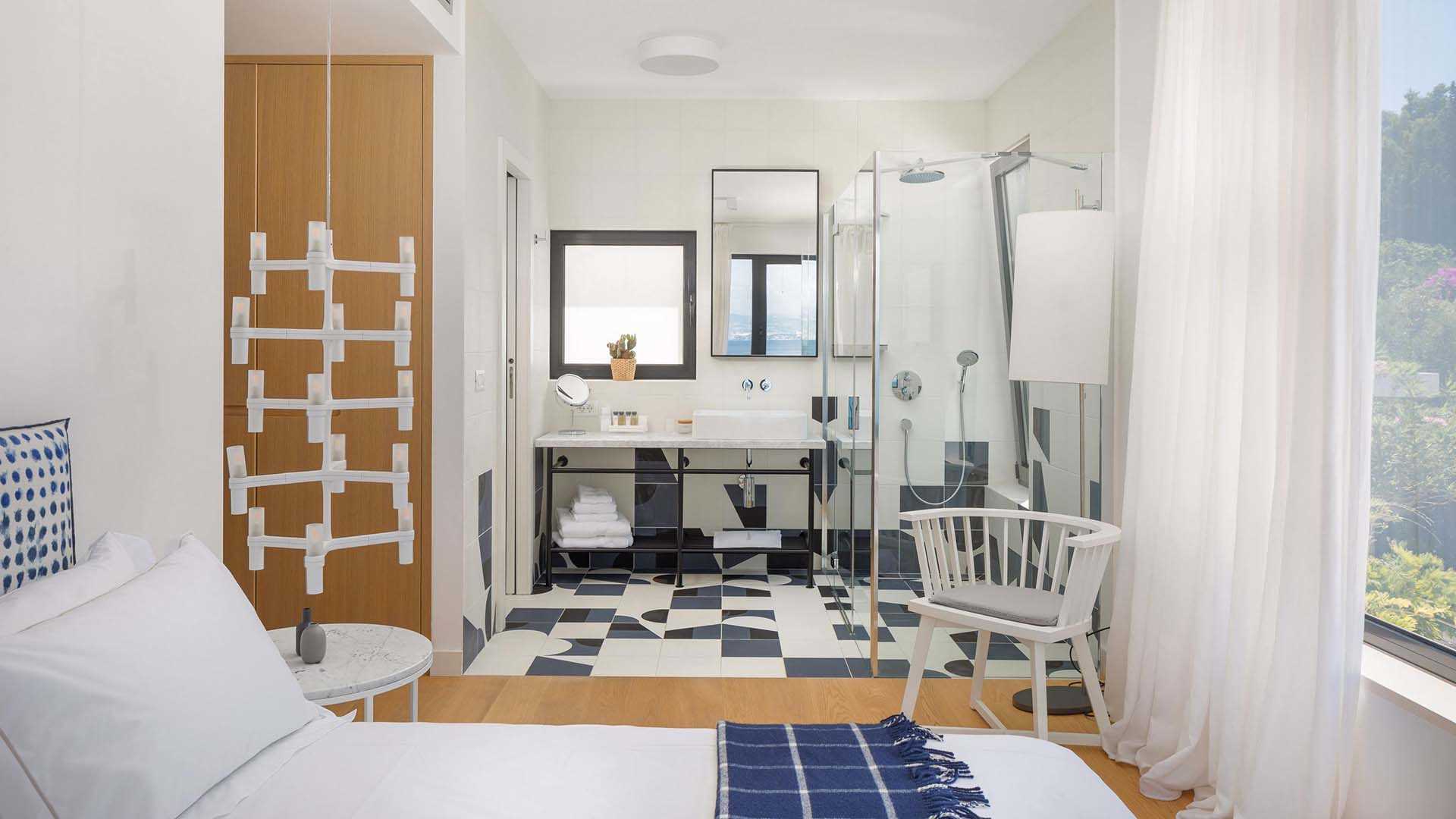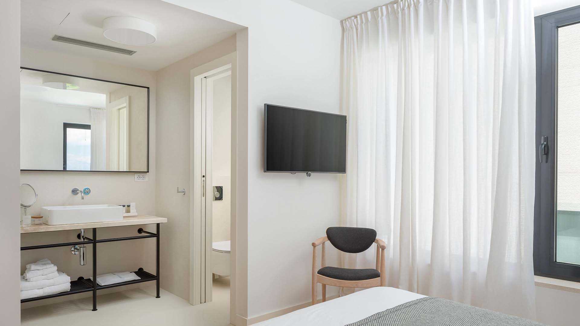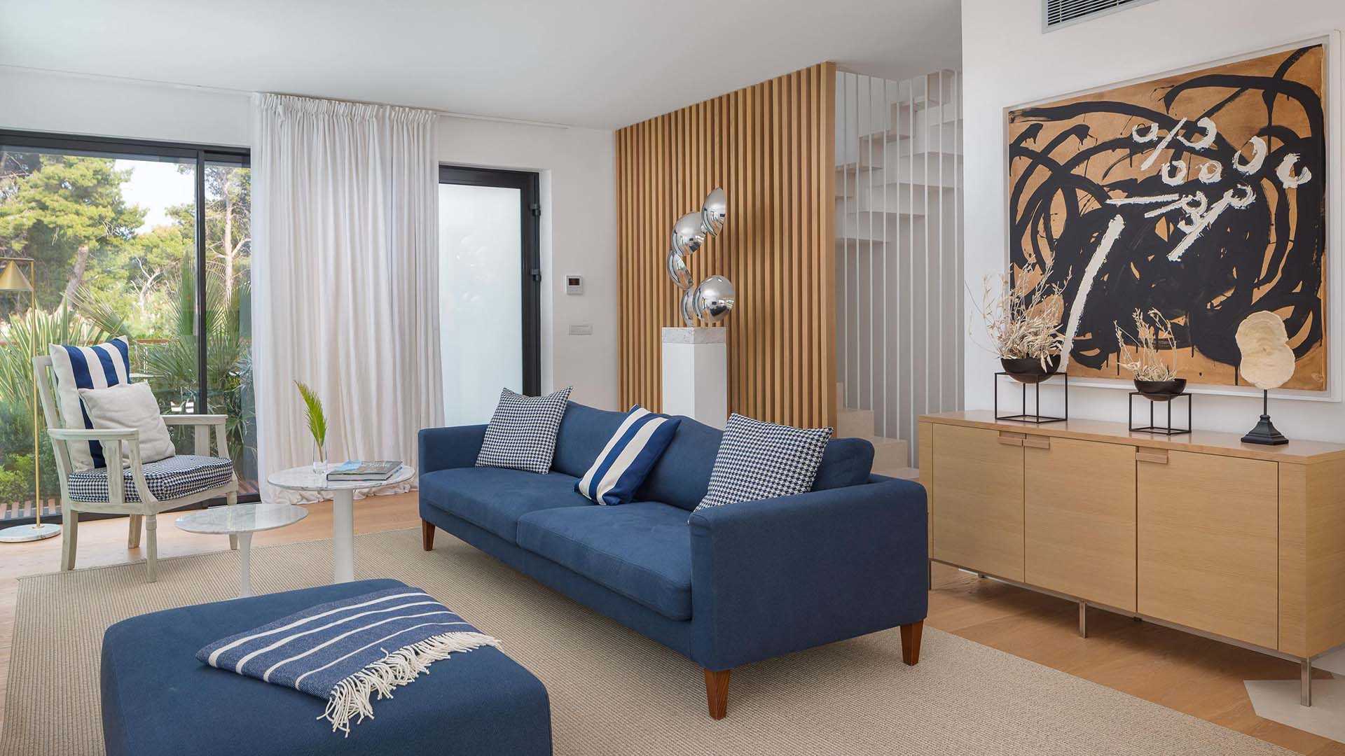 The elegant and luxurious villa tells you a story about joining the winders of modern build and design with the best of the island tradition. What speaks more about interpolation of the tradition with class than a modern villa with white stone walls or a wooden barbecue nestled into an elegant, white fireplace? The charming living area of the house opens up to the shaded terrace through a glass wall where you will enjoy the perfect morning coffee, an afternoon cocktail of a dinner while enjoying the sunset. Brač is an island famous for its white stone quarries, so what choice did the interior designers have than to use deep blue color and stone to decorate the villa’s interior? The bedrooms were decorated for your ultimate comfort, and the litlle glass balconies in hidden in the villa’s exterior walls are there for a breath of fresh air far away from nosy looks.