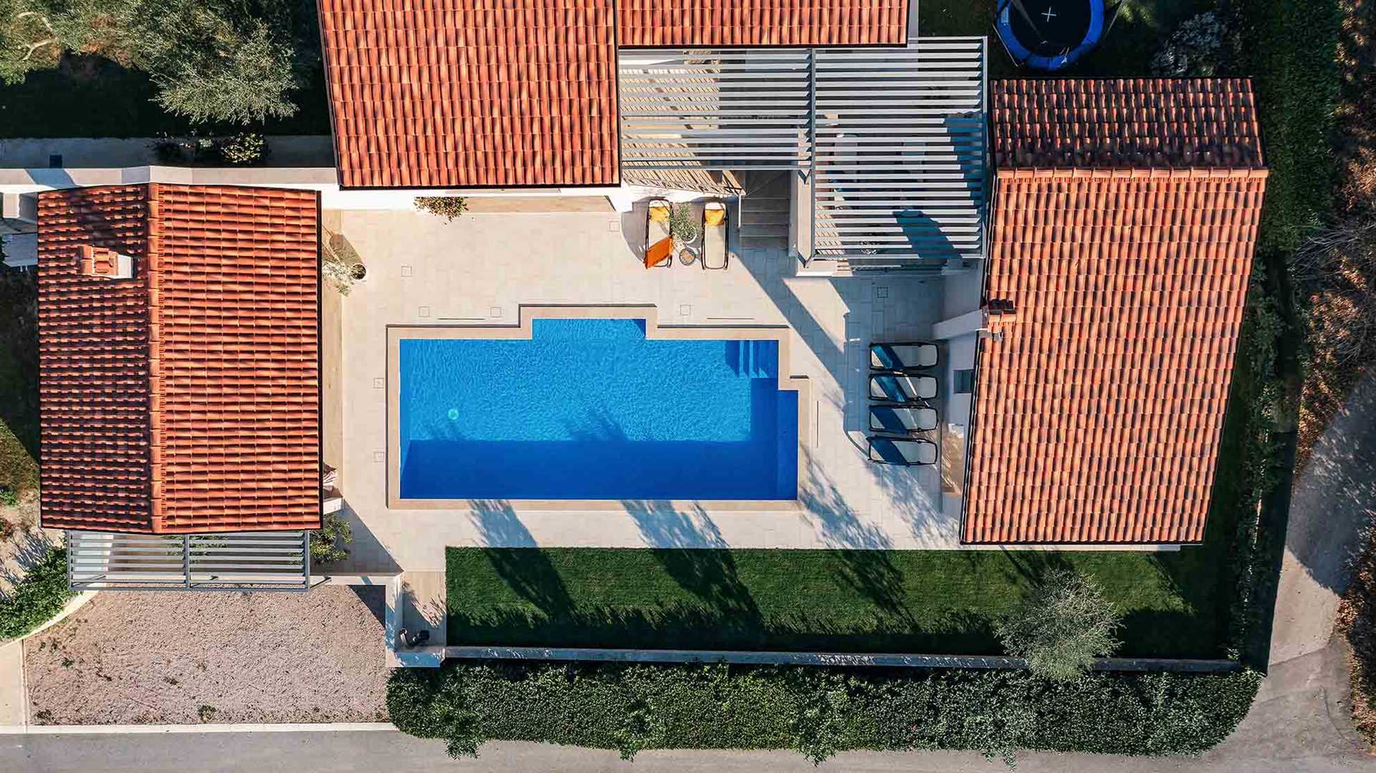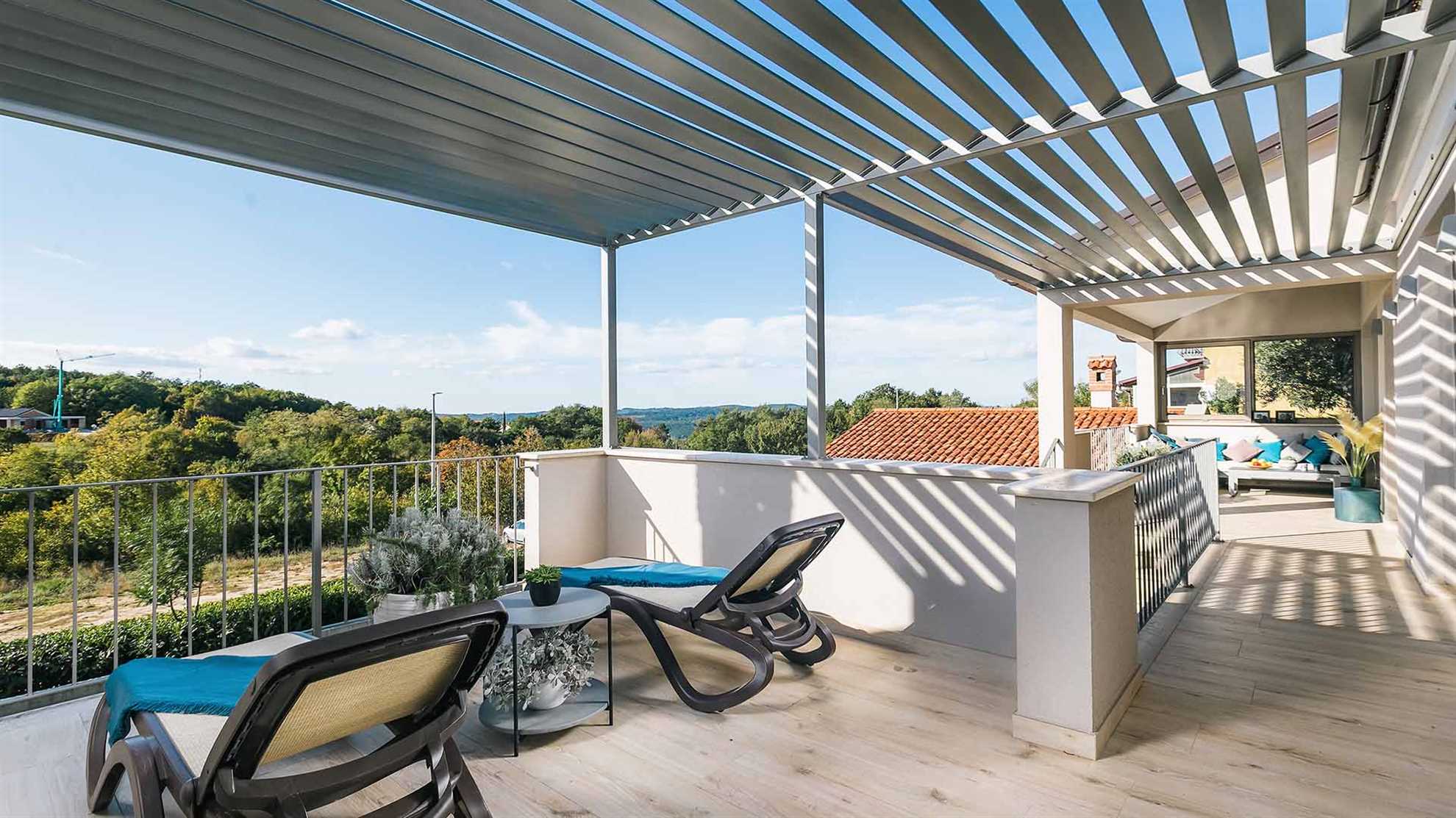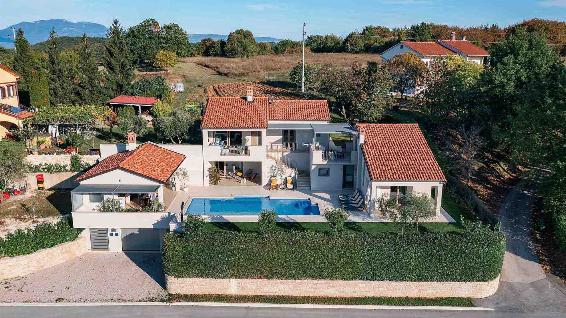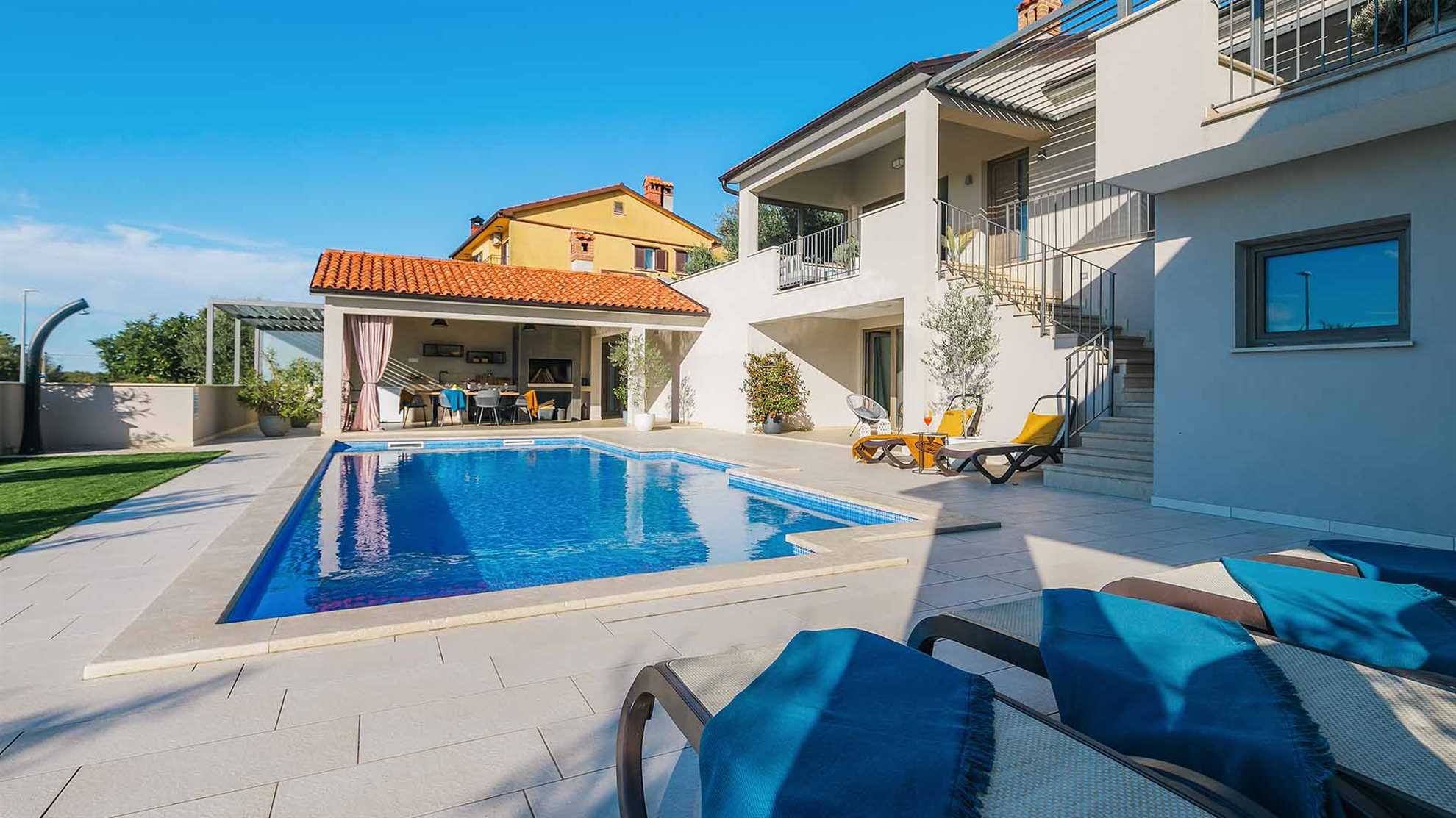 This villa is an expansive villa that can easily accommodate up to 10 people. While it is a single property it actually consists of 2 completely functional separate apartments which makes it ideal for a multi-family holiday with friends or relatives. Everything centres on a lovely outdoor pool where everybody can come together to enjoy the sun or have a meal in the outdoor dining area. However, if you want to relax alone or in smaller groups the property is full of many quiet places, like the gallery or the balconies, where you can enjoy a cup of coffee or a good book. The kids will have a fun time in the garden or on the trampoline.