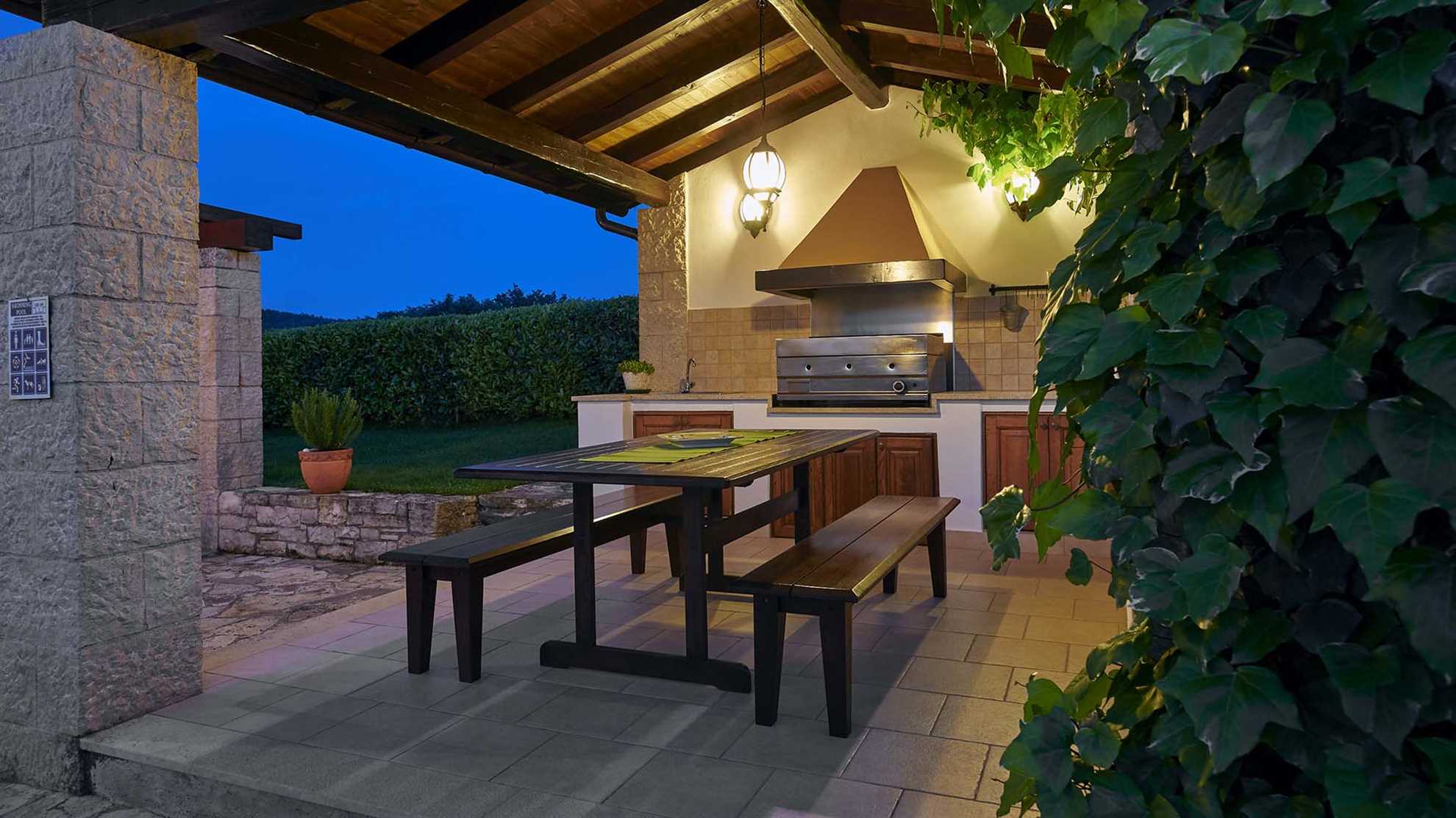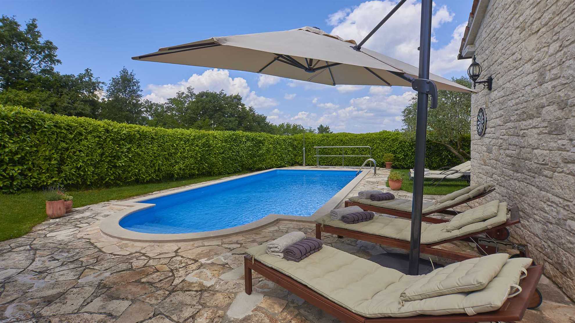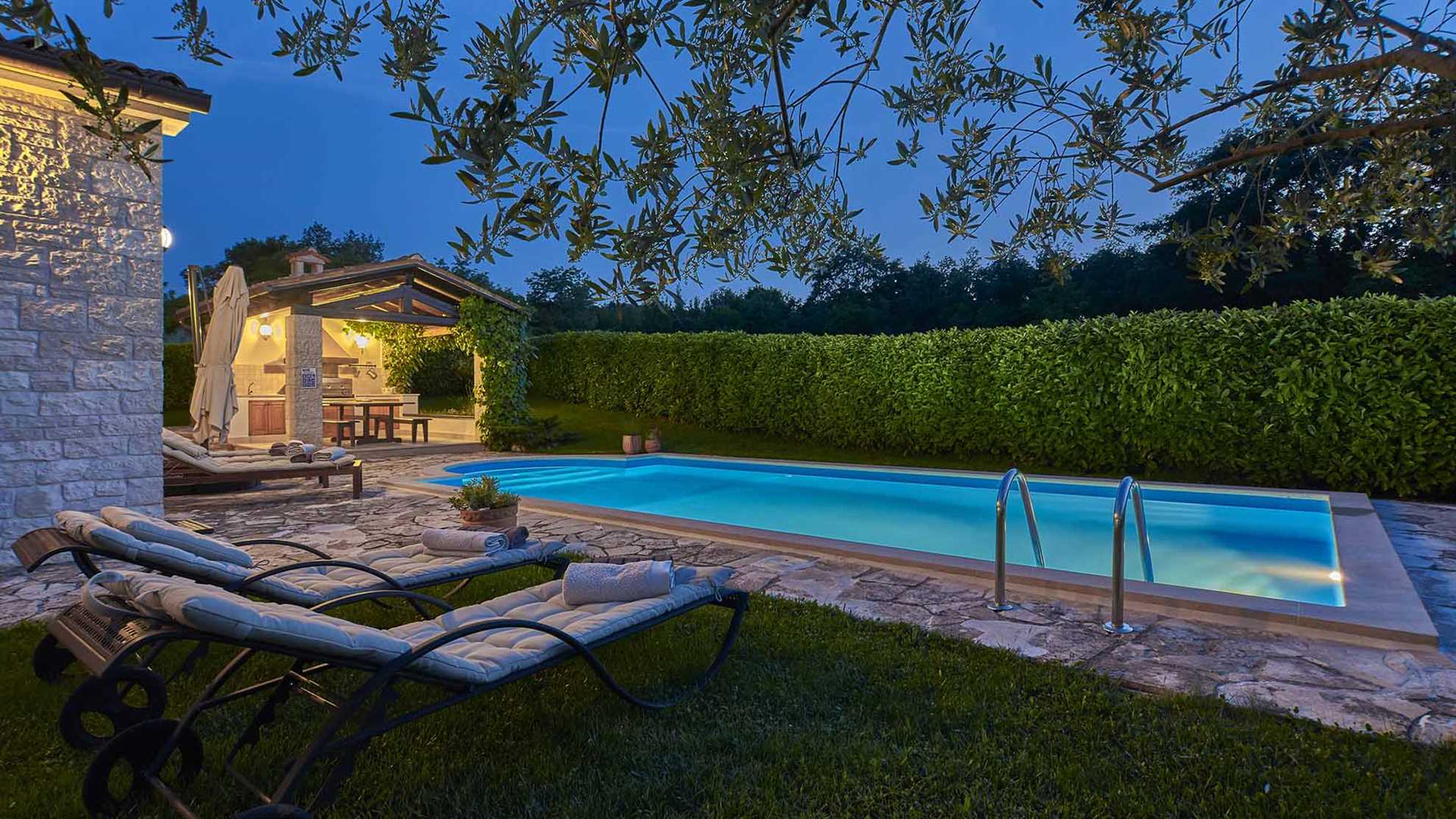 This lovely stone villa offers four bedrooms, each with its own bathroom. Guests will share a spacious living room decorated in a style of wood and stone combination. It exudes the warmth of old Istrian houses with a large antique fireplace, and on the other hand offers guests a luxurious and modern space for relaxation. It is followed by a dining room and kitchen that stylishly accompany the decoration of the entire building. During their stay in the villa, guests will mostly enjoy the garden terraces and the pool, next to which you can sunbathe on one of the five large deck chairs during the day, while at night you can admire the beautiful starry sky. The outdoor dining and kitchen are covered and equipped with a wood or gas grill. What further enriches your stay here is a beautiful garden full of greenery, centuries-old olive trees and palm trees. It is quite distant from the first neighbors so guests will be able to enjoy a complete vacation in peace and quiet.