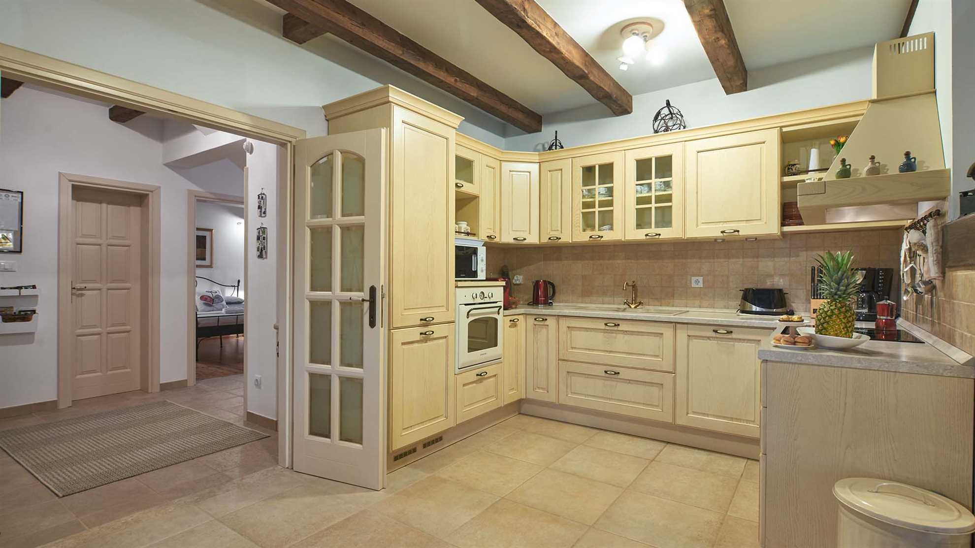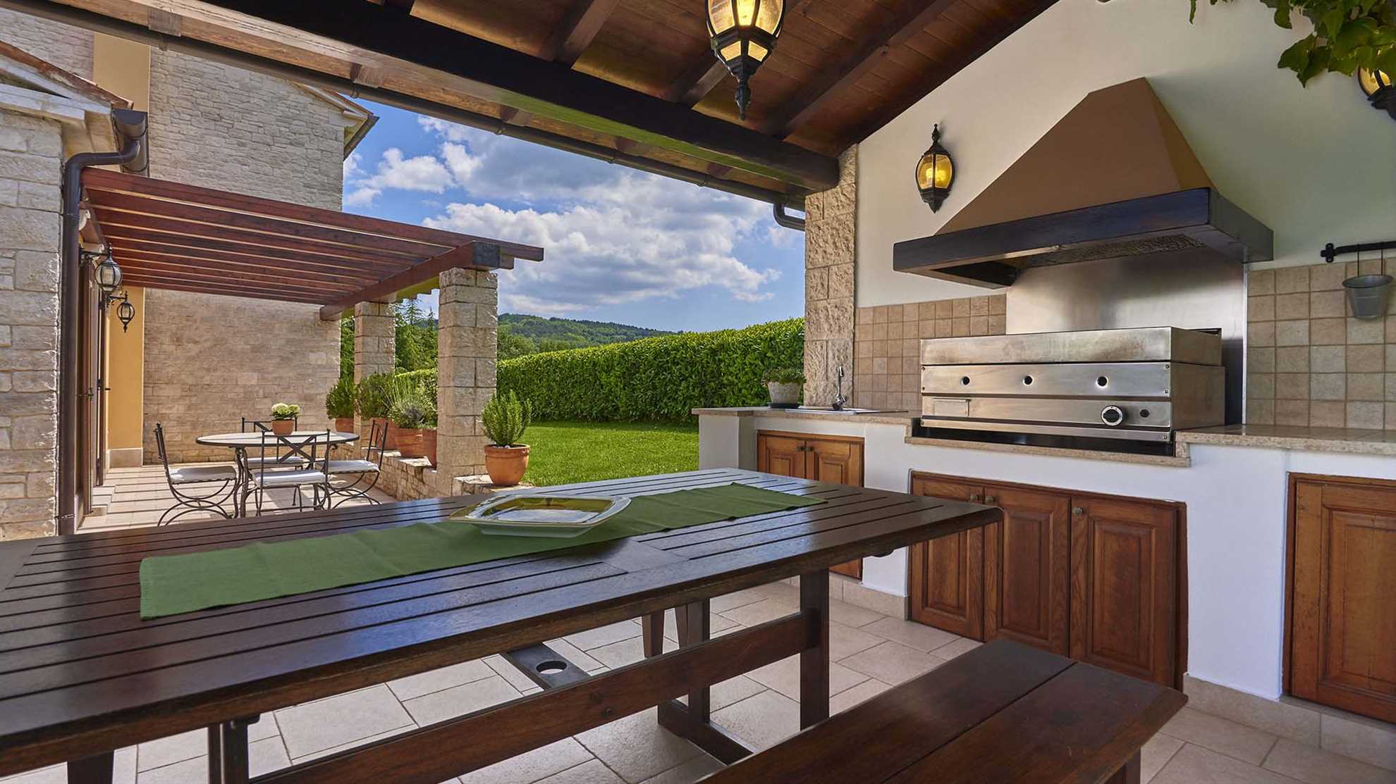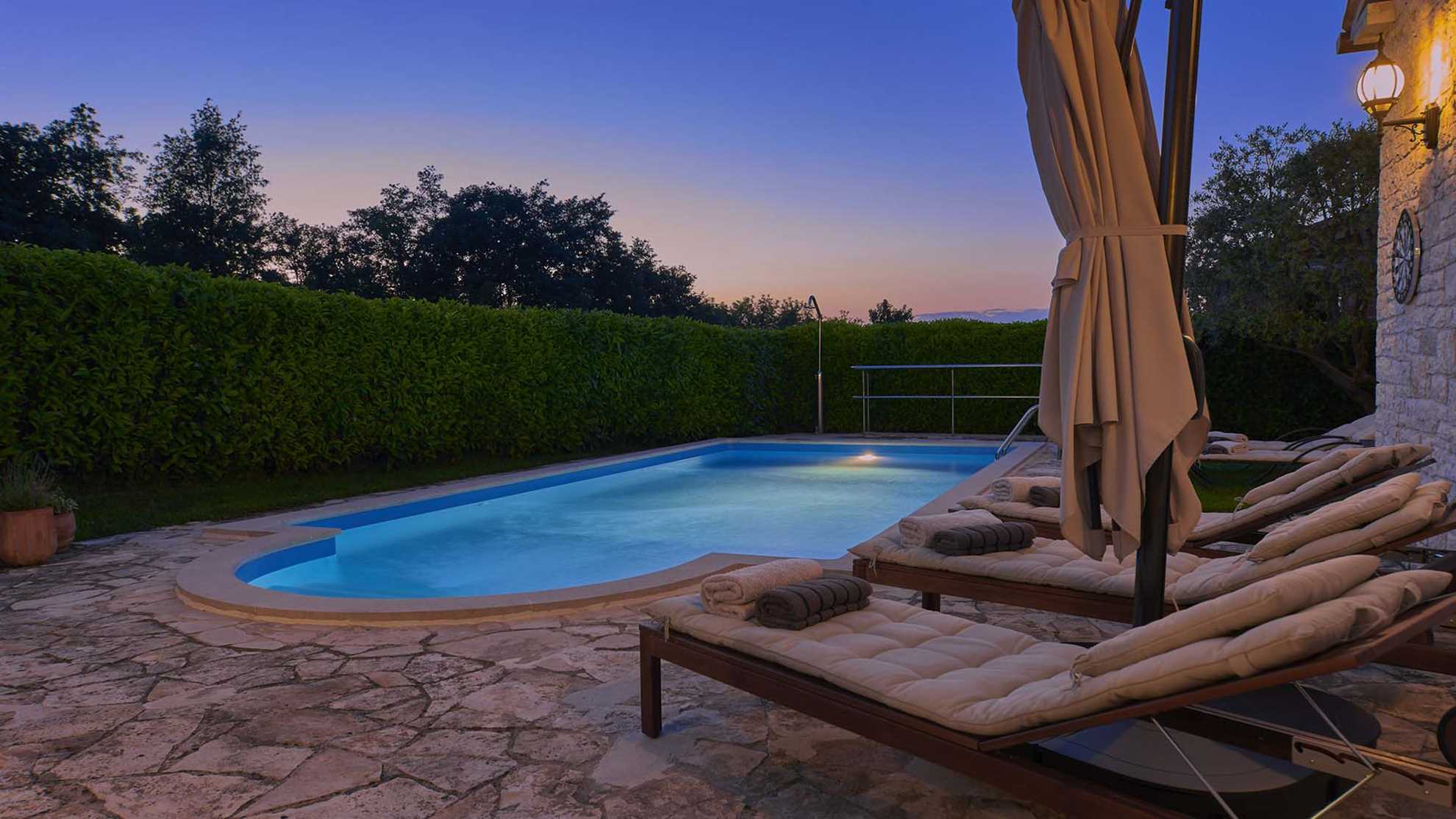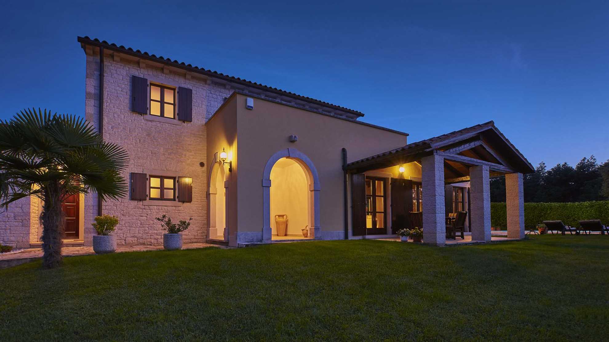 This lovely stone villa offers four bedrooms, each with its own bathroom. Guests will share a spacious living room decorated in a style of wood and stone combination. It exudes the warmth of old Istrian houses with a large antique fireplace, and on the other hand offers guests a luxurious and modern space for relaxation. It is followed by a dining room and kitchen that stylishly accompany the decoration of the entire building. During their stay in the villa, guests will mostly enjoy the garden terraces and the pool, next to which you can sunbathe on one of the five large deck chairs during the day, while at night you can admire the beautiful starry sky. The outdoor dining and kitchen are covered and equipped with a wood or gas grill. What further enriches your stay here is a beautiful garden full of greenery, centuries-old olive trees and palm trees. It is quite distant from the first neighbors so guests will be able to enjoy a complete vacation in peace and quiet.