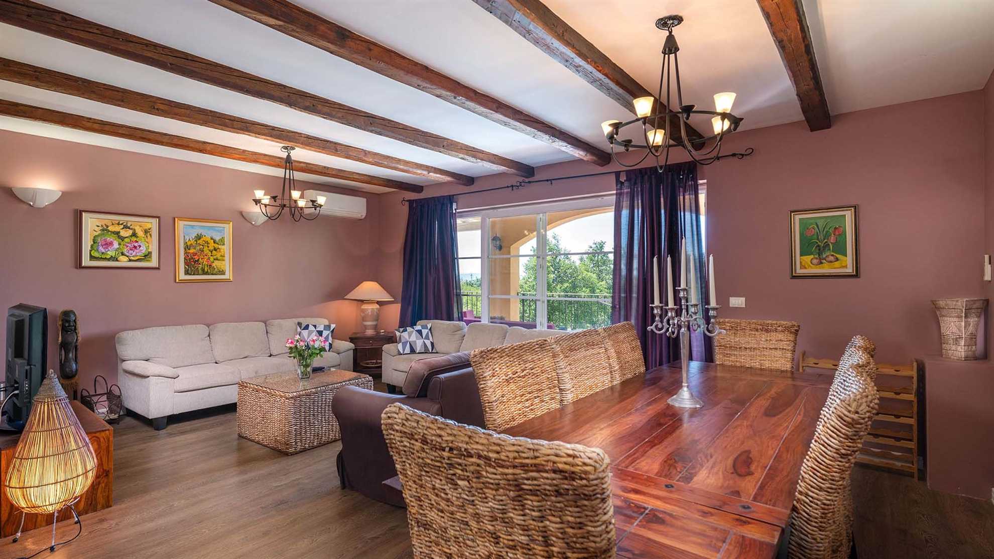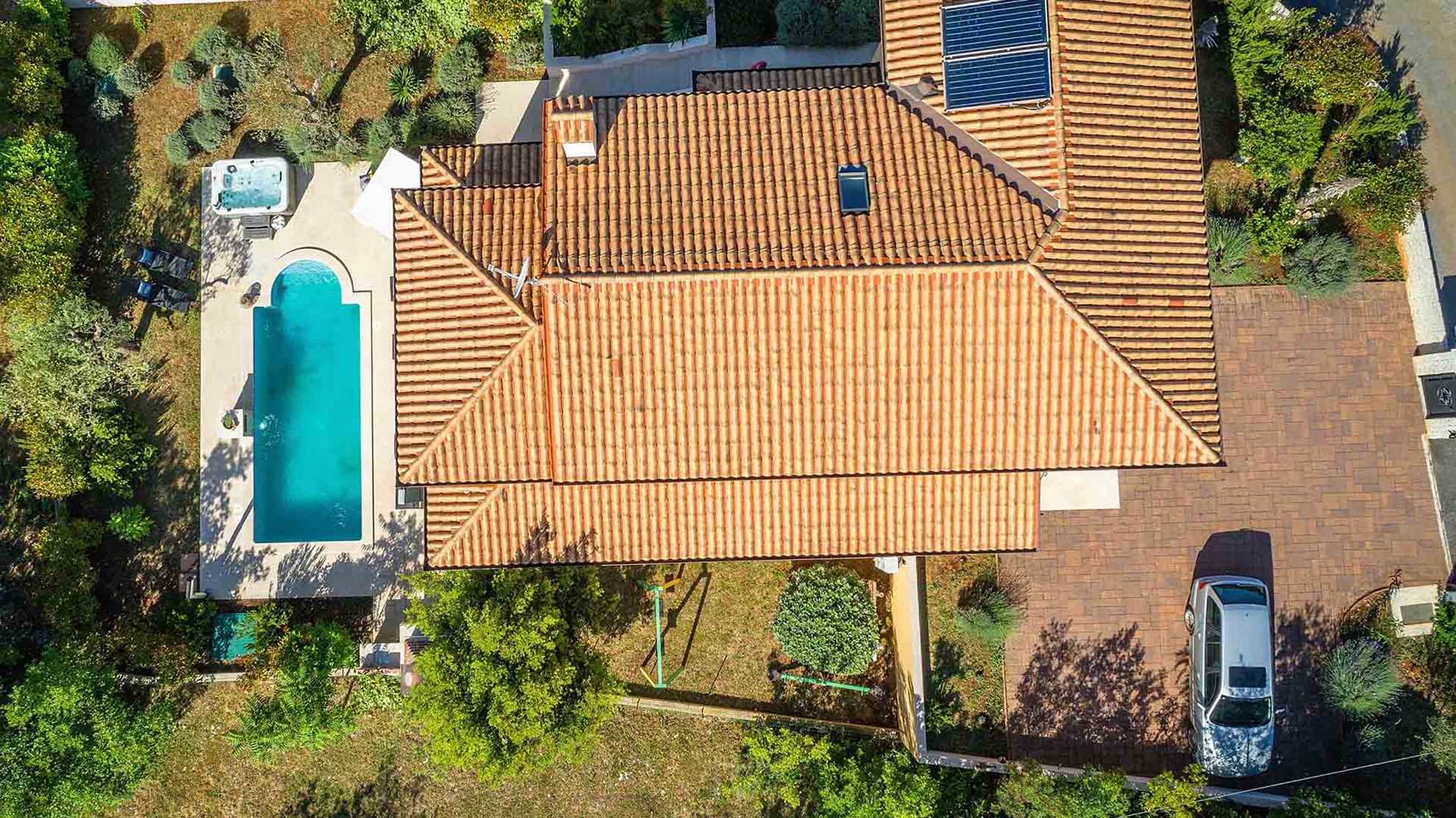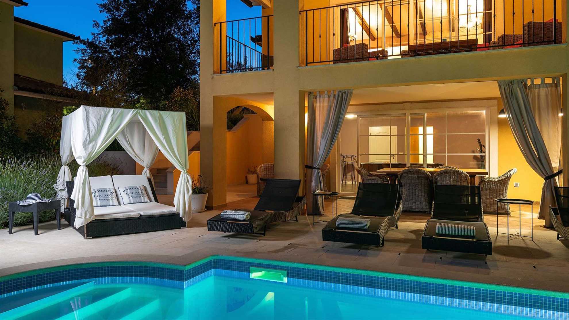 This beautiful poolside modern villa built on three levels is ideal for a party of 10. Its architects and interior designers thought on both sunny and rainy days, so the exterior of the villa is surrounded with a gorgeous, green Mediterranean garden and the typical olive trees are there to provide shade during the hot summer days. The smell of lavender and other etherical plants will sooth and relax you, and the pool is here for refreshment and entertainment. The interior of the house was decorated with every little detail taken into consideration, so apart from the modernly equipped kitchen and an elegant living area, there is a game room, with a pool table and fitness equipment, and a sauna to make your stay as carefree as possible.