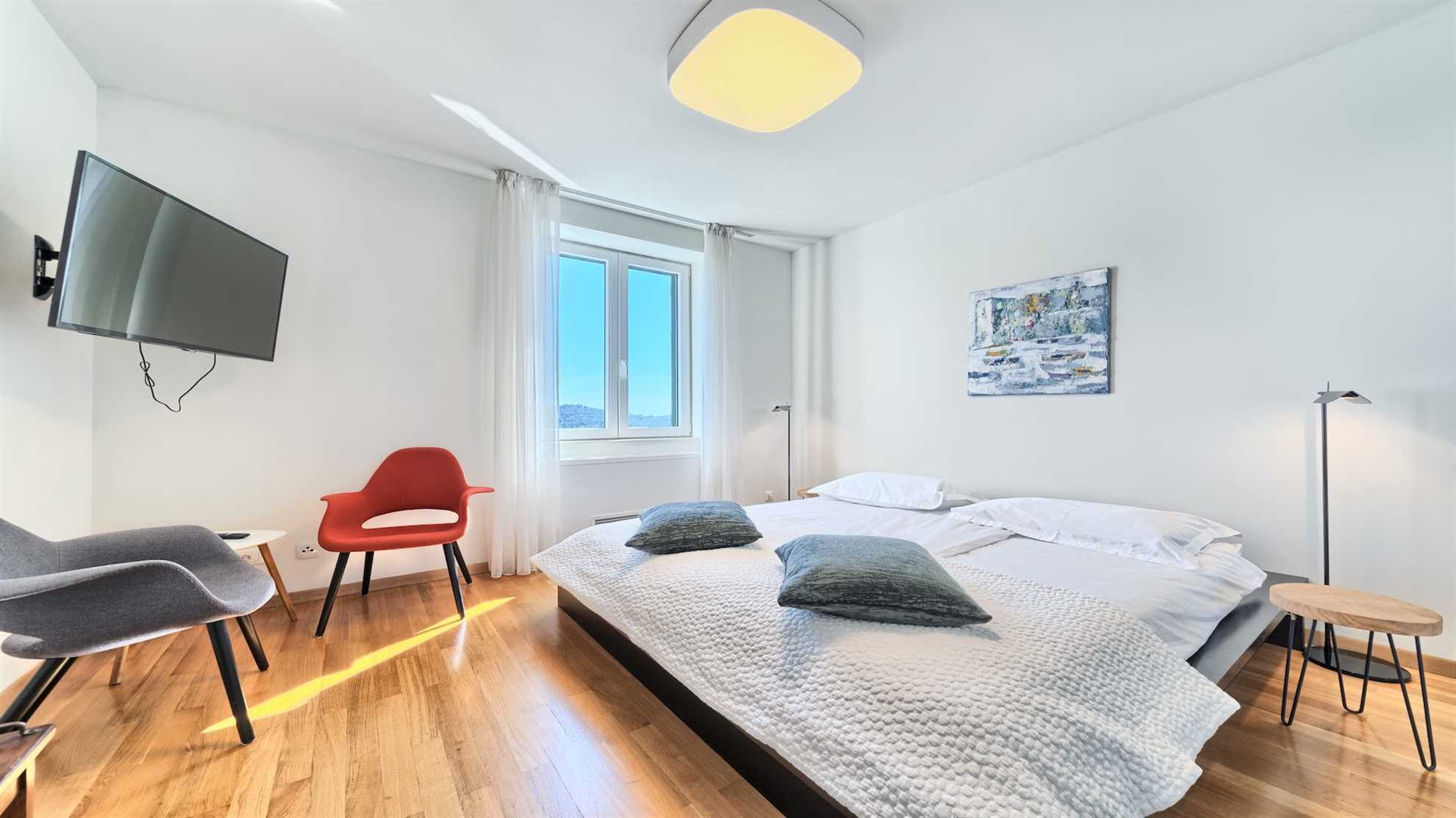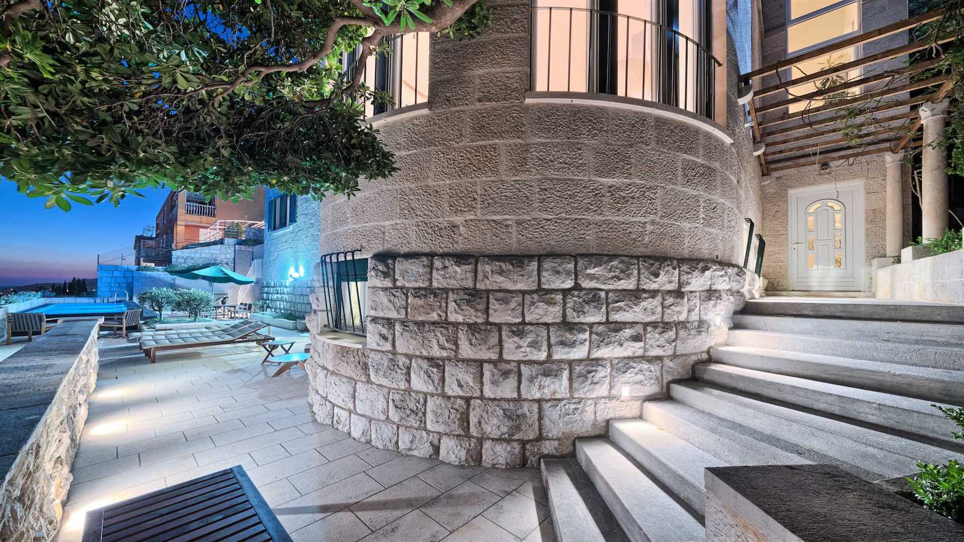 On the ground floor is a fully equipped kitchen, a dining room and a salon which will magically take you back decades in time into the royal era that the house continues to embrace. On the first floor is a one-bedroom suite with en-suite bath and its own salon and a private balcony overlooking the Adriatic. On the balcony you will find a hot tub. On the second floor are two beautifully designed en-suite bedrooms, a sauna with a shower room, and a mirror room with a luxury bathtub. And finally in the attic is another en-suite bedroom with a reading nook to enjoy a classic piece of literature. A smaller bedroom with two single beds is at your disposal should you require it.