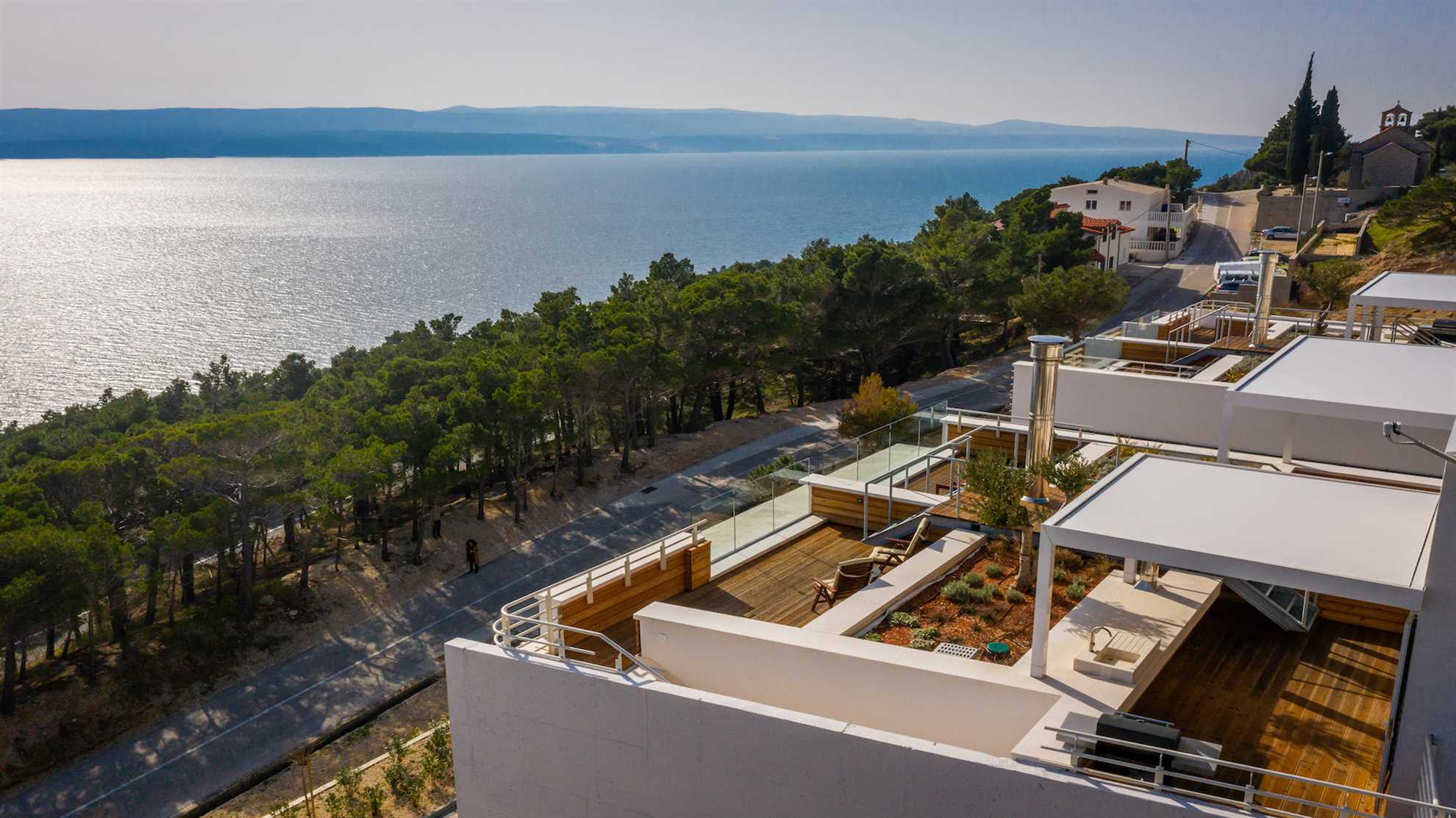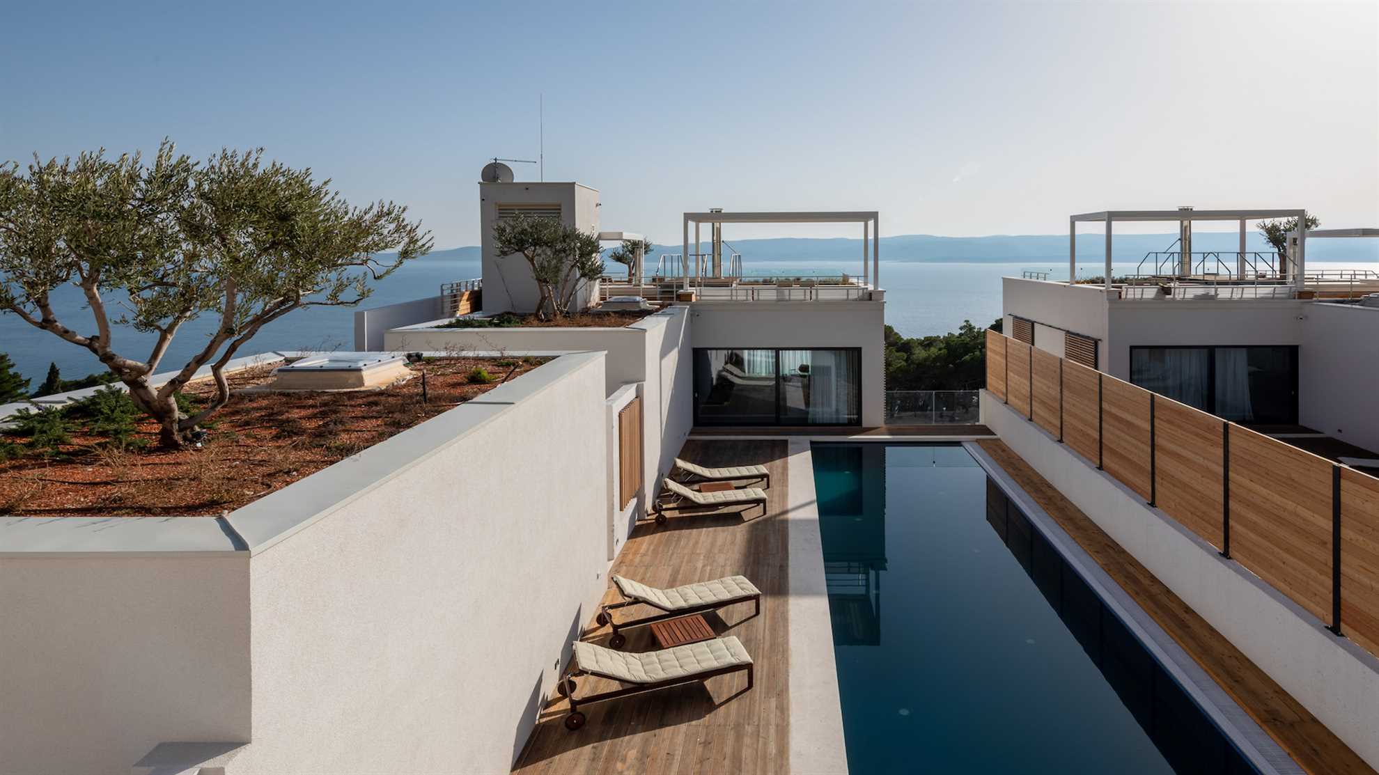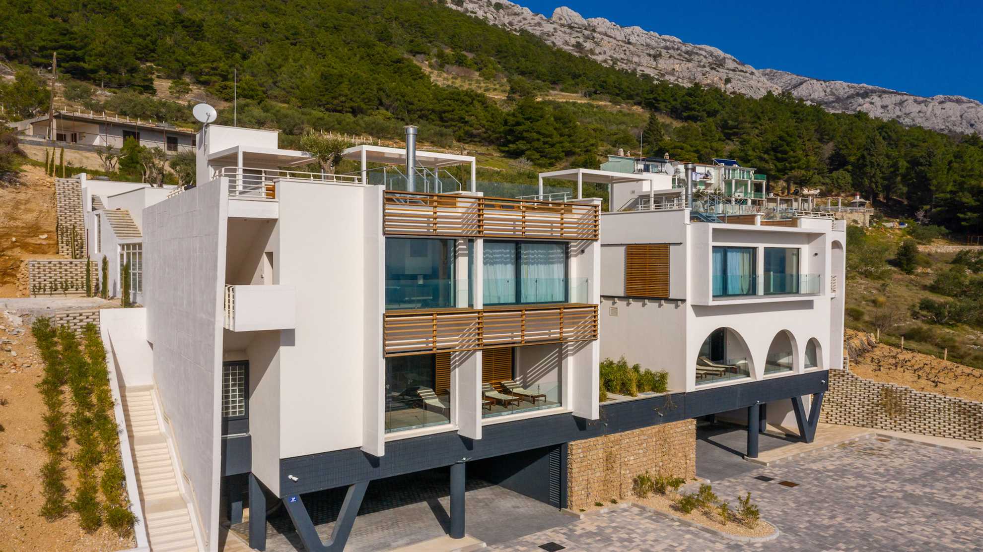 Double the joy with Villa Gemelos, consisting of two sister villas, each with a private entrance, with 2 pools, jacuzzi, gym, a sauna and two amazing roof top terraces yielding impeccable views of the Adriatic. Elegant style, unparallel comfort, contemporary design, breathtaking views and secluded yet convenient location make this villa one of a kind treasure. Modern architecture, floor to ceiling windows and large open living spaces overlooking the horizon immediately impress while the contemporary luxuries, convenient technology and an open plan fully equipped kitchen make it perfect for entertaining. Enjoy a swim in the pool while admiring both the sea in the front and the stunning mountains in the background, prepare a BBQ at sunset on a roof top terrace or simply enjoy the natural beauty around you. Step onto the treadmill, cycle on the exercise bike or check into the spa and treat yourself to a day of relaxation with a hydromassage jacuzzi, a Finnish sauna and a hammam by the top manufacturer Effegibi. You are in for a treat.