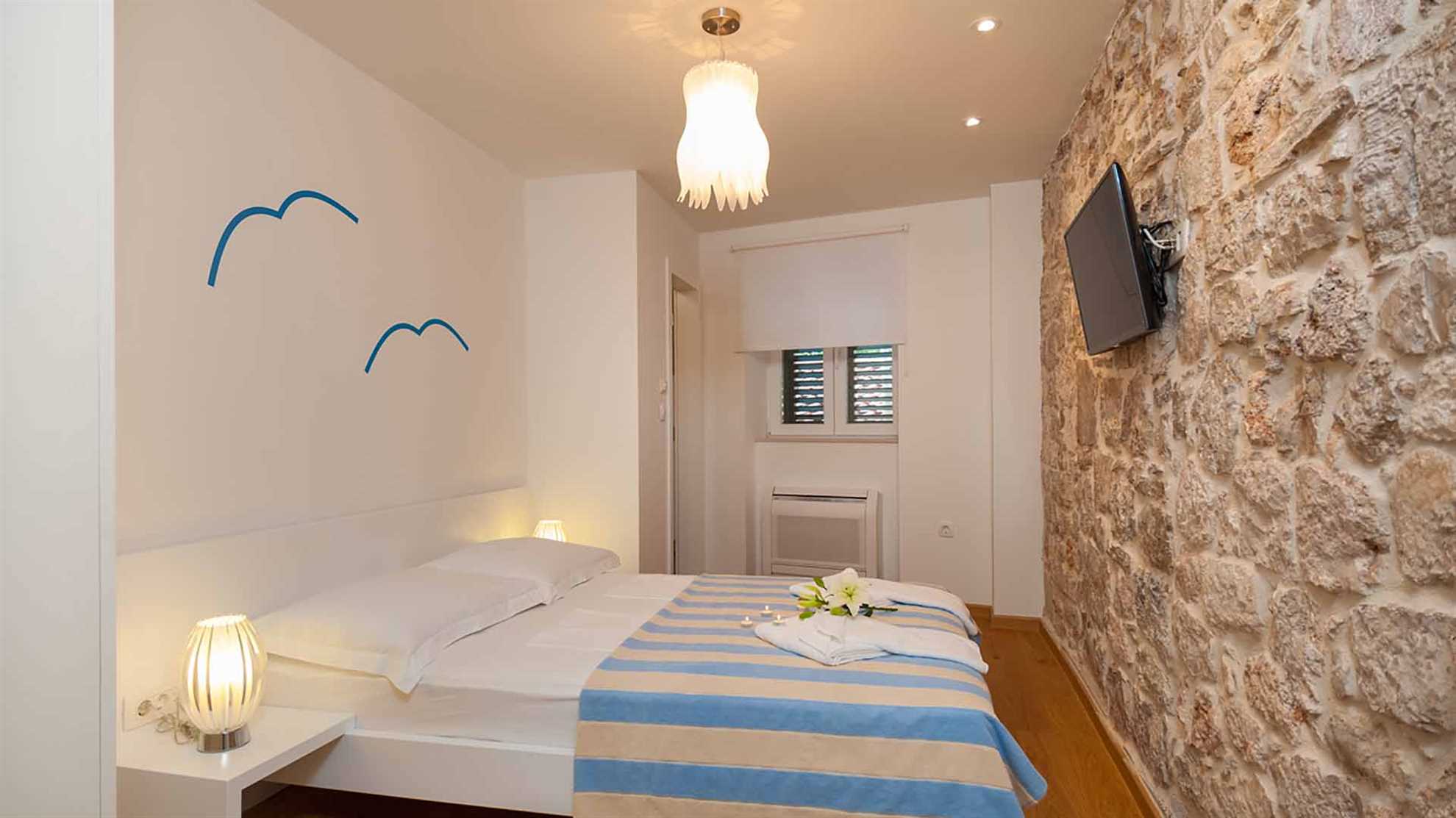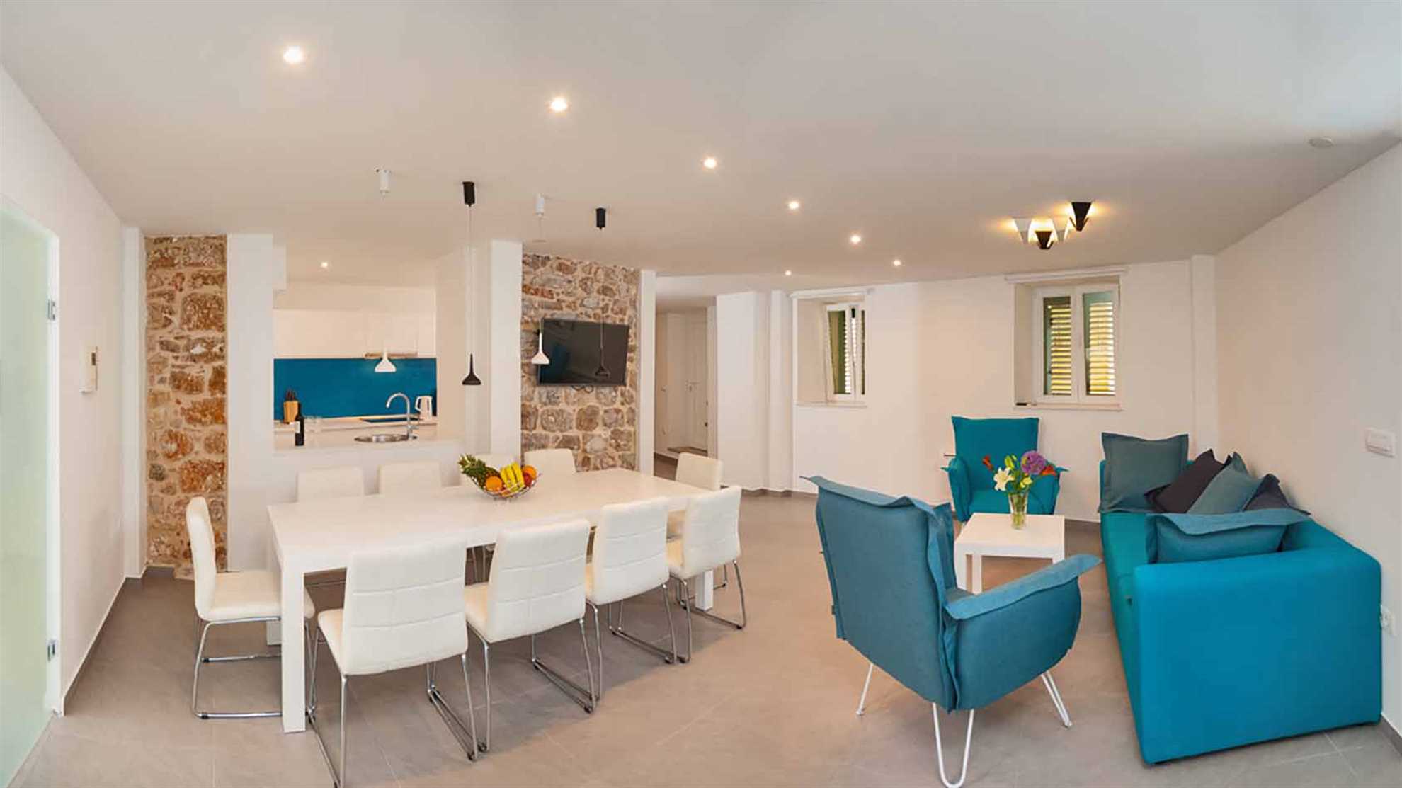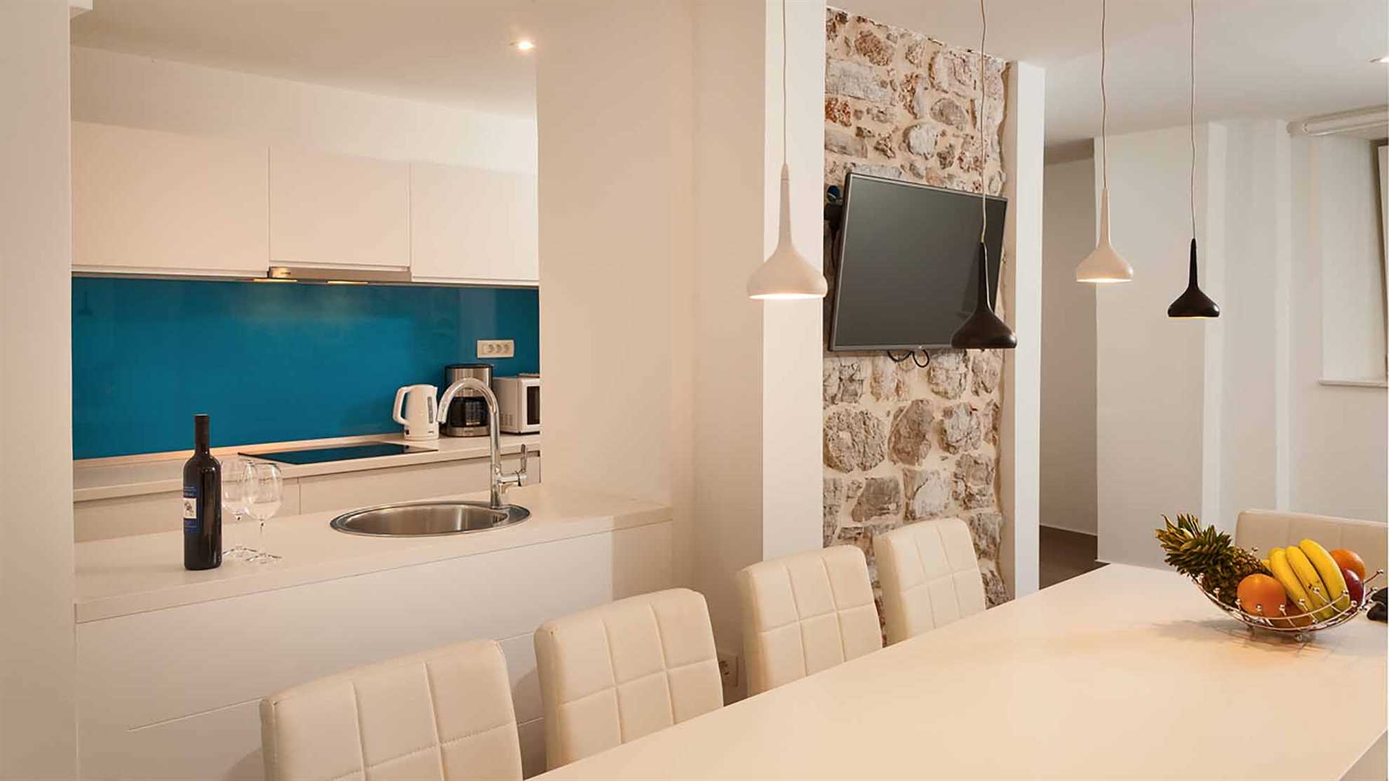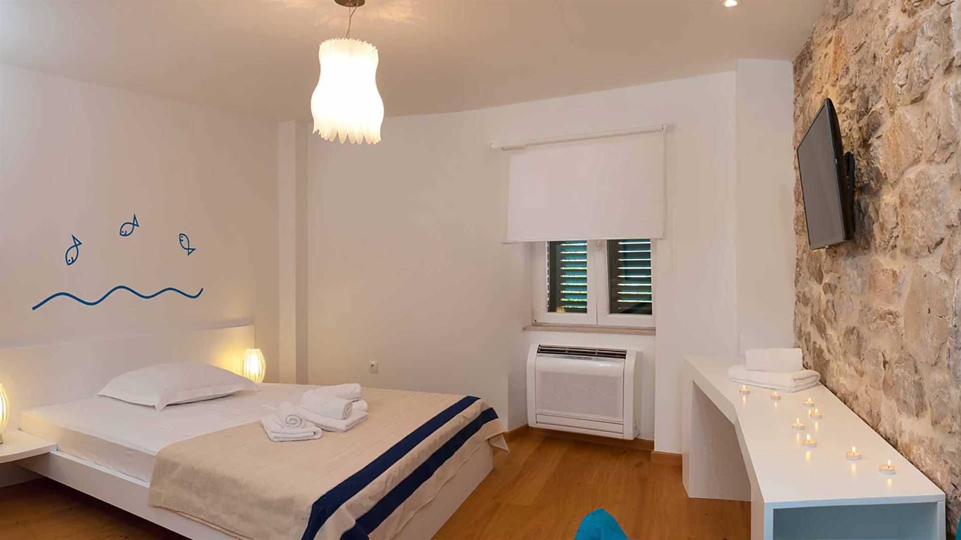 There is something special thing about the island villas. They have the extraordinary ability to merge the beautiful, traditional stone island architecture with the most contemporary design and features. This modern poolside villa on the island Brač is just like that. A truly majestic house that will make you reconsider the length of your stay. Even though it is situated in the center of Bol, the villa ensures complete privacy, and the terrace offers a spectacular view over the Adriatic. The house is perfect for a party of 9 guest but can easily accommodate up to 15 guests in 5 bedrooms. The outdoor pool with the sun loungers is ideal for the moments you seek refreshment, but don’t feel like going to the beach. The interior designers did an excellent merge of the modern style with the stone walls using contemporary wall decorations and modern appliances. The sauna is an extra perk in case of a rainy day or simply a wish to enjoy your day in a different way.