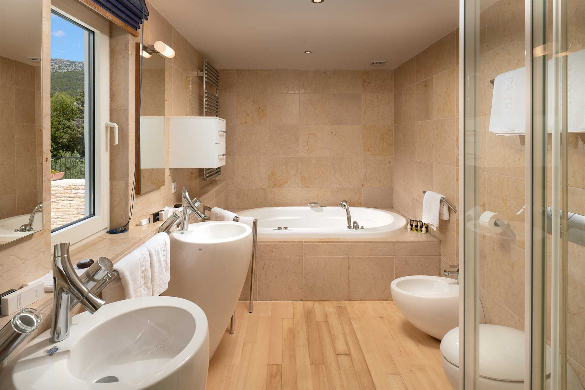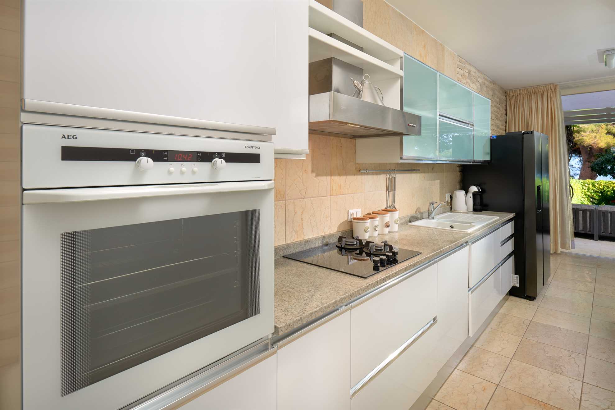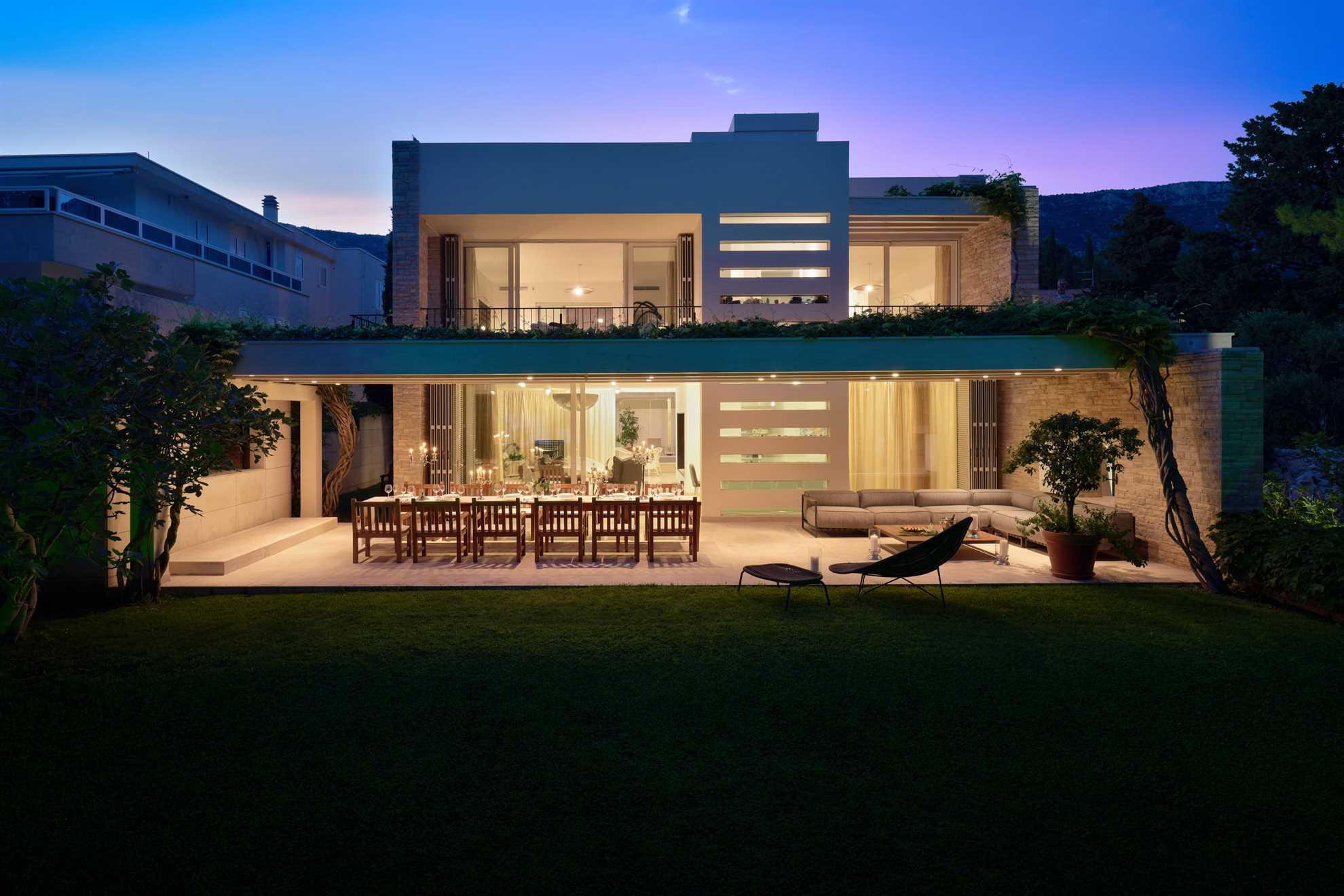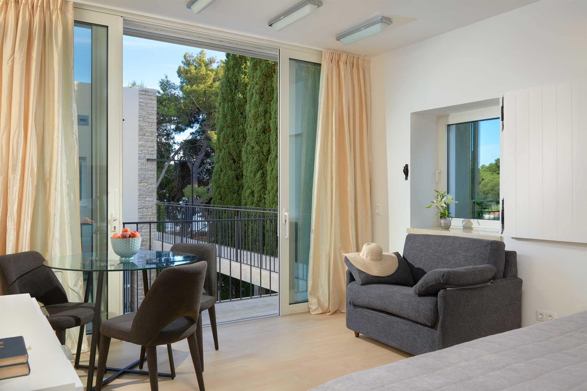 Located 500m from Croatia‘s most famous beach Zlatan Rat, as well as the center of Bol, Golden Beach Villa is a holiday luxury accommodation with two living units, offering privacy for larger groups or multiple families. Beautifully designed in contemporary style and furnished with most elegant pieces and decorative light fixtures, specious rooms are equally elegant and comfortable. The main building comprises of two ample and bright master bedrooms, each with a private balcony and ensuite bathroom with hydromassage bathtub and a shower. Connected by a courtyard with a heated pool, the second unit consist of four separate apartments each with a bedroom, ensuite bathroom and a small kitchen. Large living room with a fireplace and a smart TV, as well as a fully equipped kitchen and a separate dining area are provided. The outdoor terrace is surrounded by a beautiful green garden with views of the sea and is equipped with a large comfy lounge seating, an extra-large dining table set underneath the grape vines, and authentic barbecue facilities. Welcome to a luxurious relaxation on island Brač.