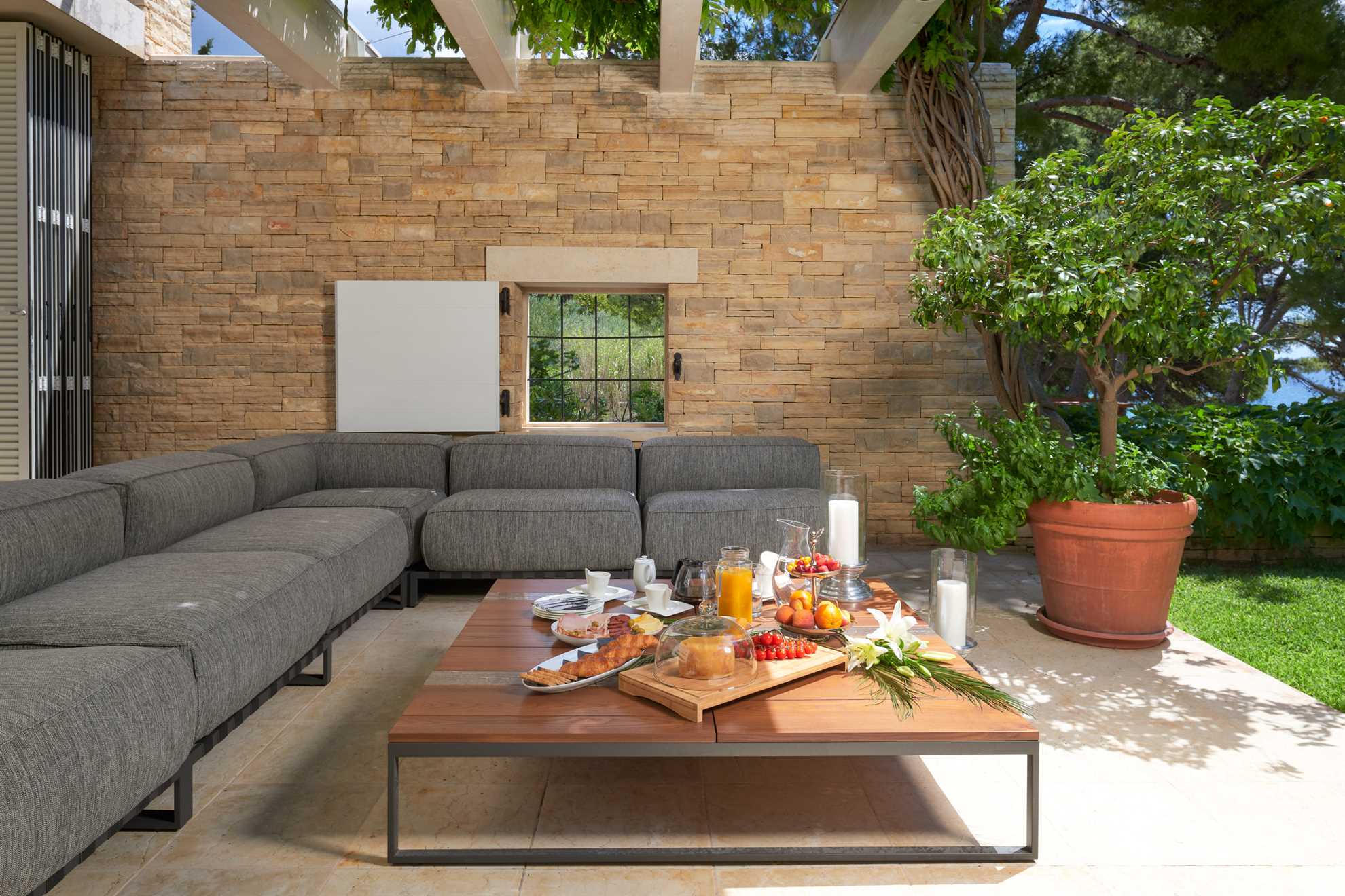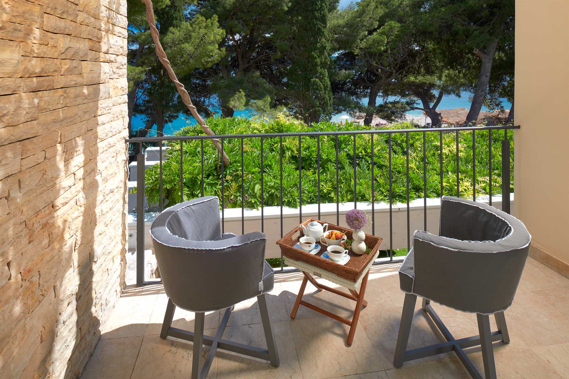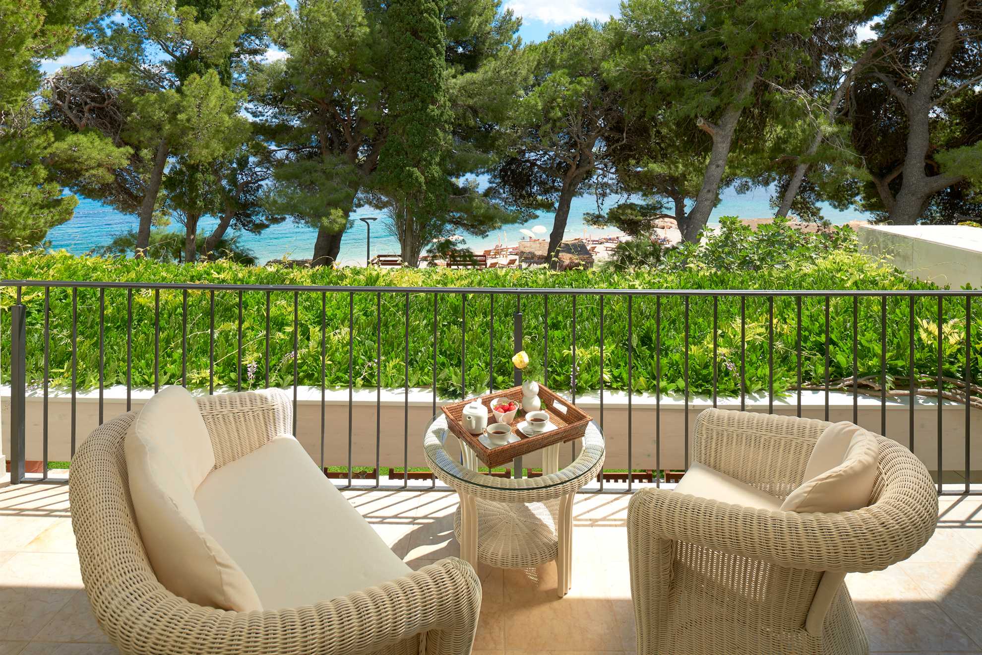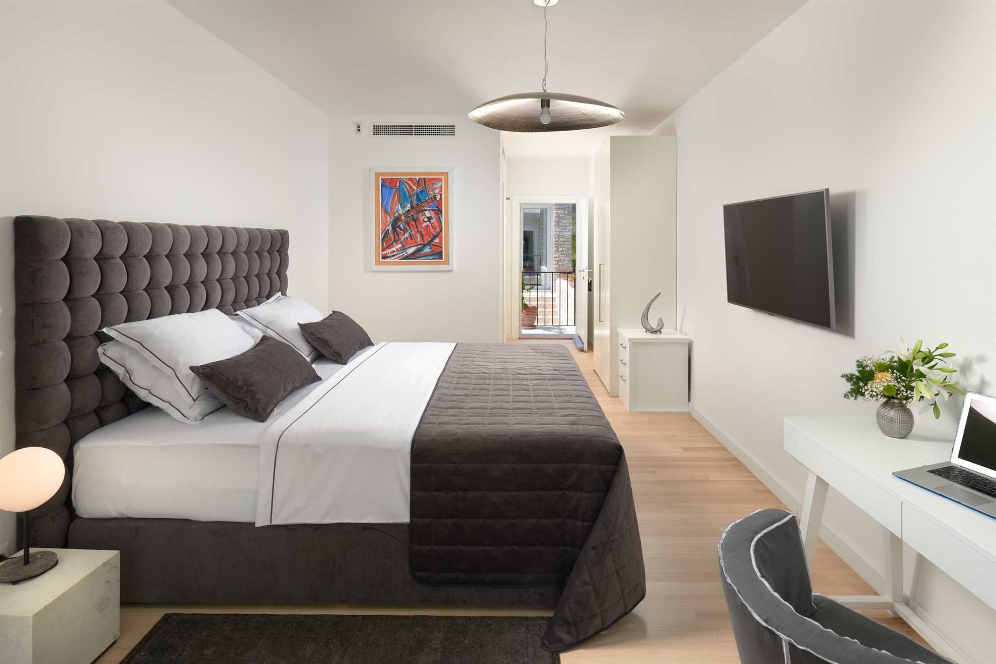 Located 500m from Croatia‘s most famous beach Zlatan Rat, as well as the center of Bol, Golden Beach Villa is a holiday luxury accommodation with two living units, offering privacy for larger groups or multiple families. Beautifully designed in contemporary style and furnished with most elegant pieces and decorative light fixtures, specious rooms are equally elegant and comfortable. The main building comprises of two ample and bright master bedrooms, each with a private balcony and ensuite bathroom with hydromassage bathtub and a shower. Connected by a courtyard with a heated pool, the second unit consist of four separate apartments each with a bedroom, ensuite bathroom and a small kitchen. Large living room with a fireplace and a smart TV, as well as a fully equipped kitchen and a separate dining area are provided. The outdoor terrace is surrounded by a beautiful green garden with views of the sea and is equipped with a large comfy lounge seating, an extra-large dining table set underneath the grape vines, and authentic barbecue facilities. Welcome to a luxurious relaxation on island Brač.