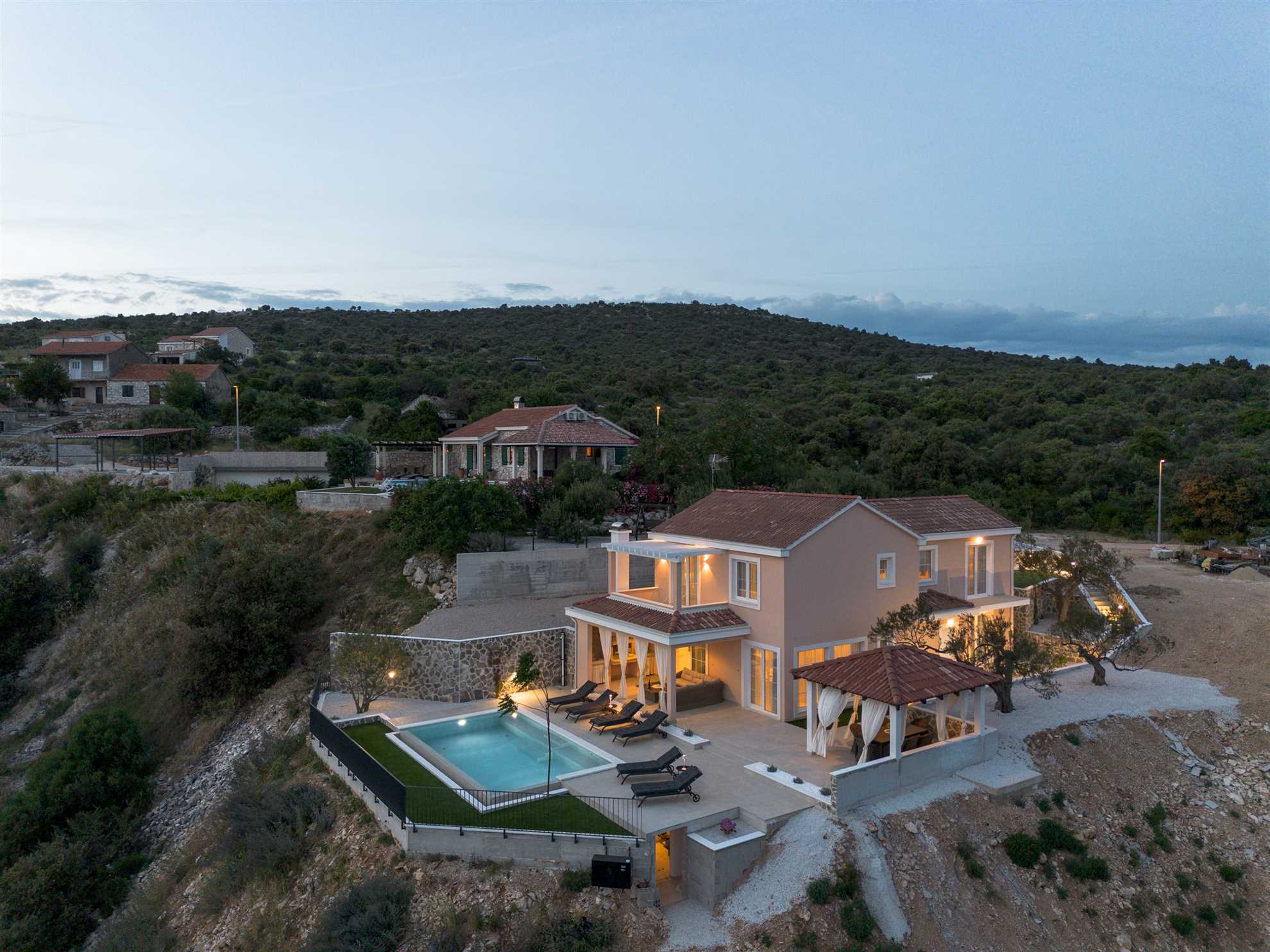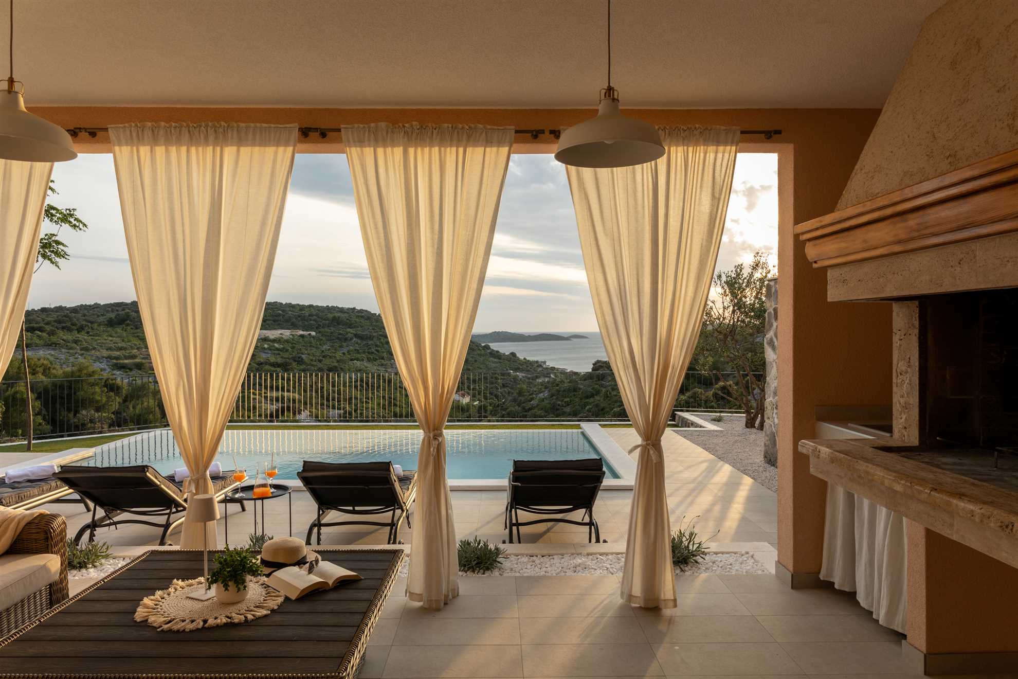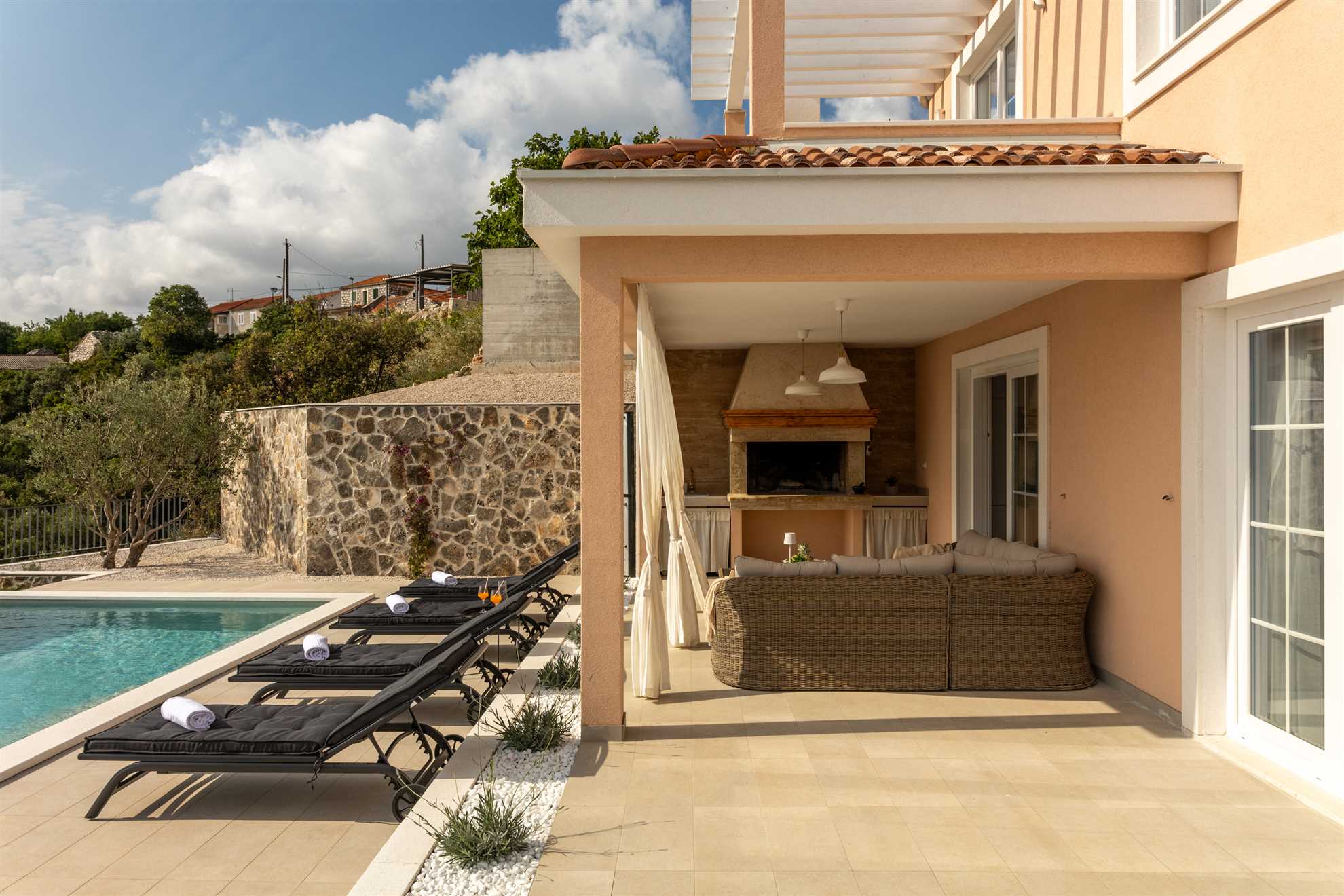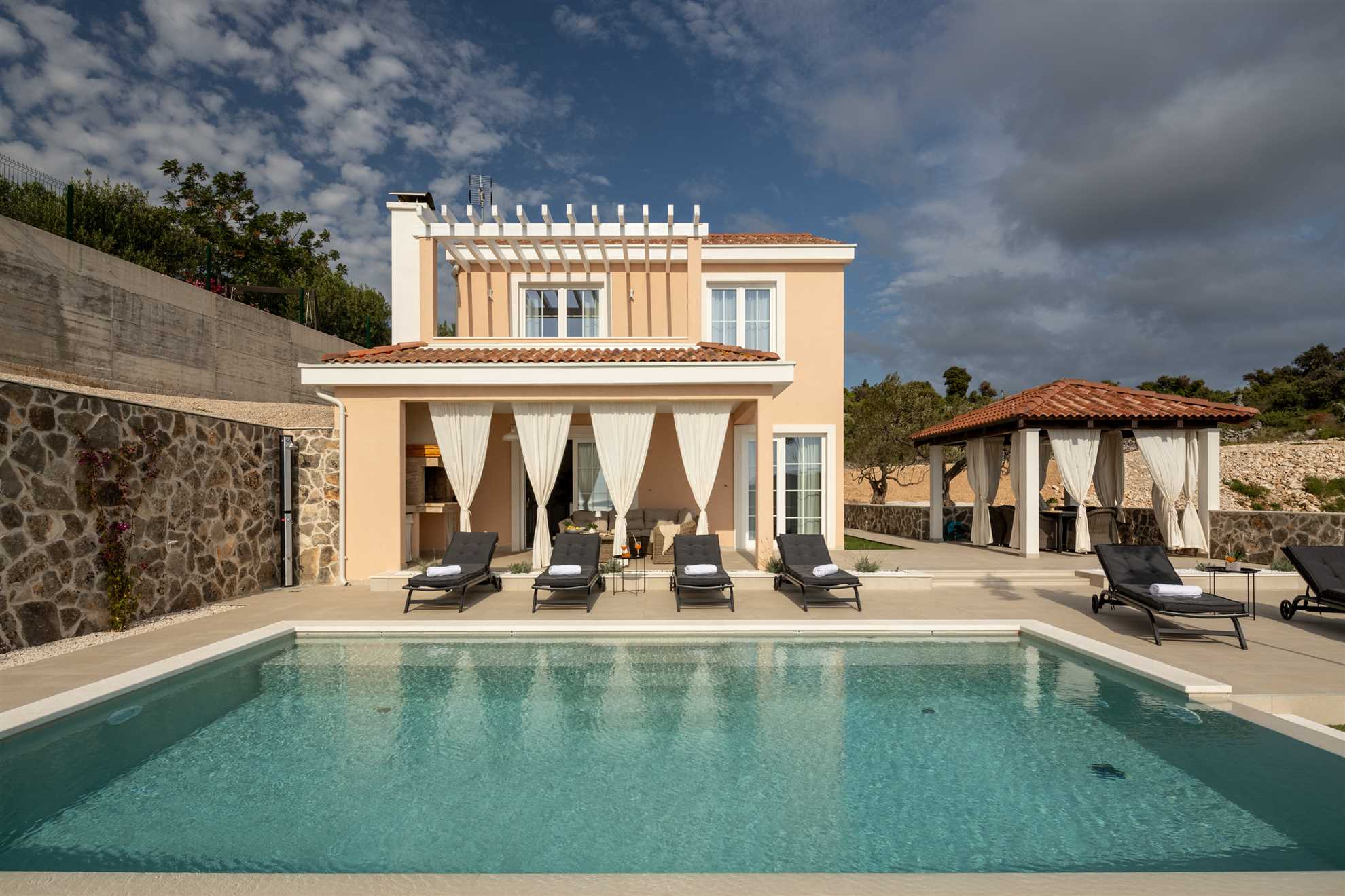 Nestled on a picturesque hill with breathtaking sea views, Villa Allegra defines refined living. This newly built addition to the luxury market boasts saltwater infinity heated pool, perfect for year-round enjoyment. For moments of relaxation, the covered seating lounge provides a tranquil spot to unwind while taking in the stunning surroundings. Lavish outdoor area is complete with sun loungers and an inviting alfresco dining area fitted with built in authentic BBQ. Inside, the villa is spread across two floors of opulent living space covering 230m2. Each of the luxury ensuite bedrooms offers a serene retreat with high-end finishes. The graceful dining room makes every dinner an elegant experience, while the large kitchen, featuring a central breakfast island, is equipped with the finest appliances. Subtle decor, soft colors, exposed wood beams and cozy yet sophisticated living area all add to a welcoming atmosphere making this a lovely choice for a holiday for family and friends.