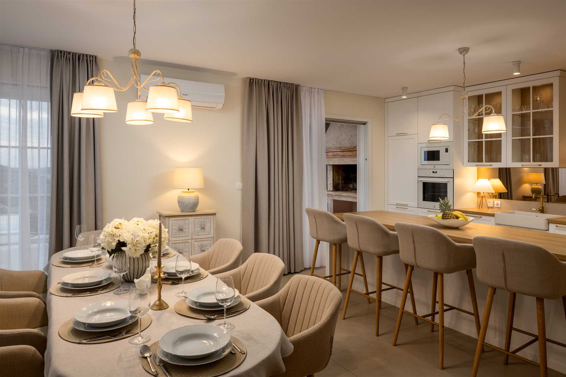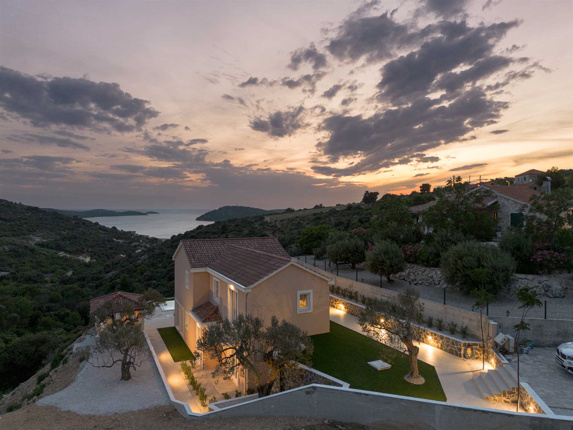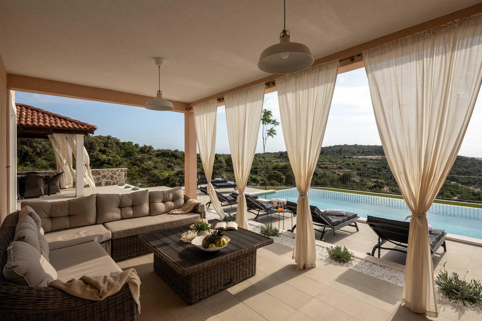 Nestled on a picturesque hill with breathtaking sea views, Villa Allegra defines refined living. This newly built addition to the luxury market boasts saltwater infinity heated pool, perfect for year-round enjoyment. For moments of relaxation, the covered seating lounge provides a tranquil spot to unwind while taking in the stunning surroundings. Lavish outdoor area is complete with sun loungers and an inviting alfresco dining area fitted with built in authentic BBQ. Inside, the villa is spread across two floors of opulent living space covering 230m2. Each of the luxury ensuite bedrooms offers a serene retreat with high-end finishes. The graceful dining room makes every dinner an elegant experience, while the large kitchen, featuring a central breakfast island, is equipped with the finest appliances. Subtle decor, soft colors, exposed wood beams and cozy yet sophisticated living area all add to a welcoming atmosphere making this a lovely choice for a holiday for family and friends.