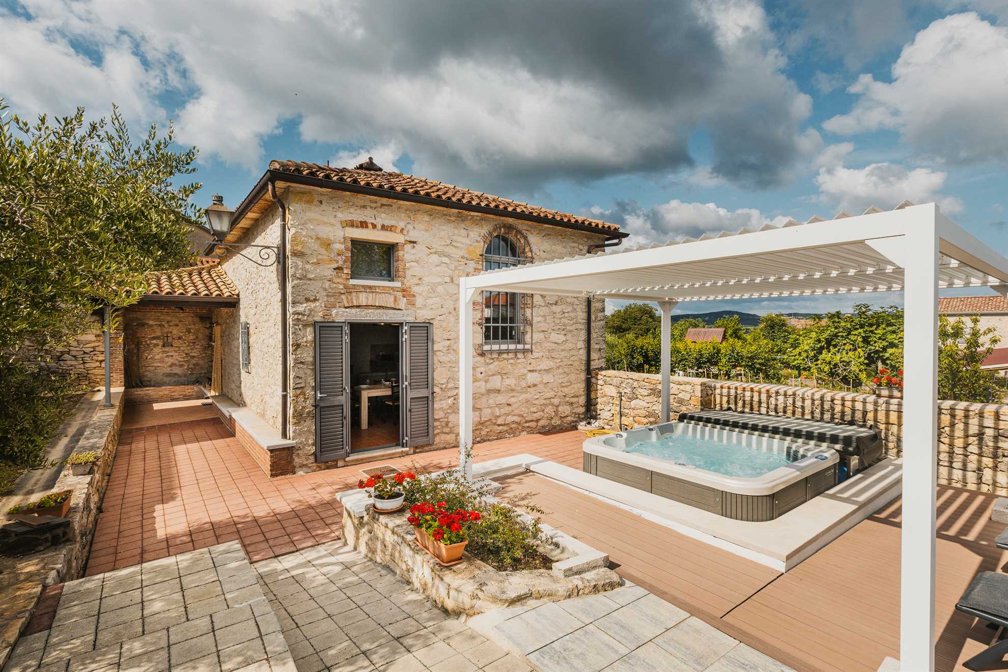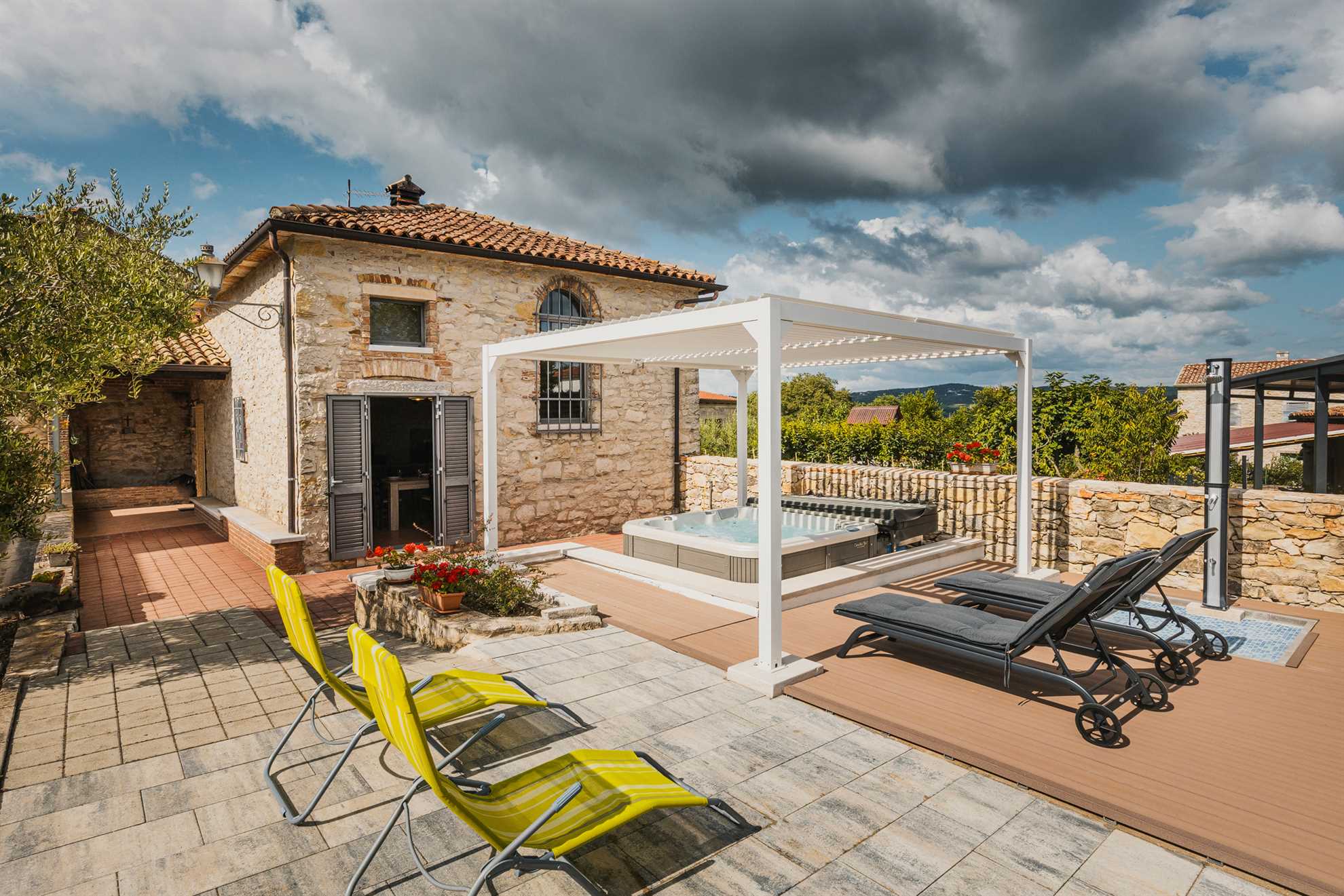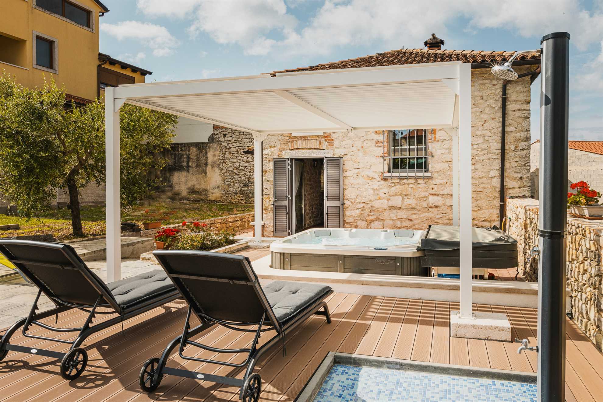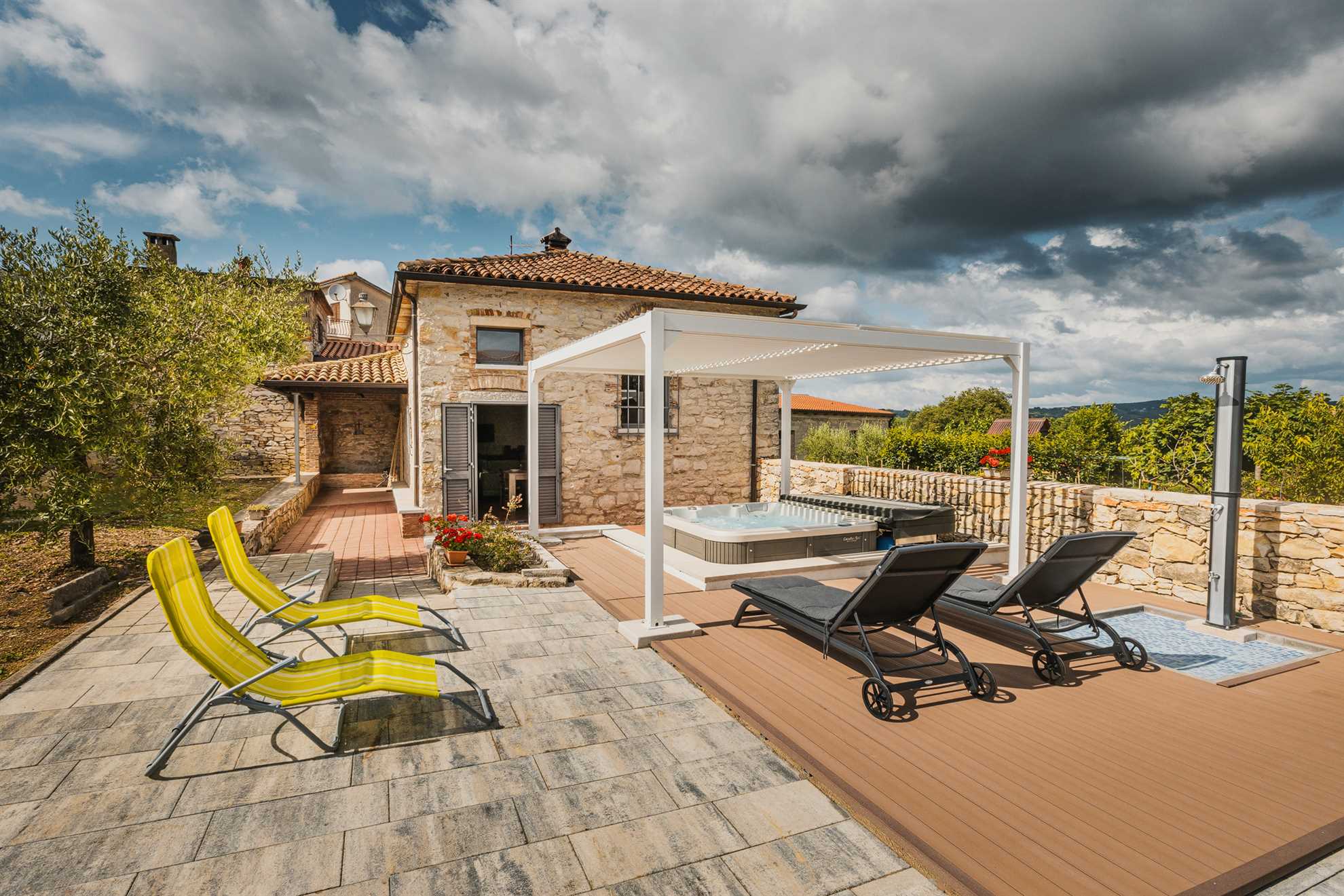 Step into this charming home in Brtonigla, where the serene gallery bedroom on the upper floor offers a luxurious double bed and opens onto a private terrace, perfect for morning coffee or stargazing. The cozy ground floor bedroom is furnished with a bunk bed, ideal for children or extra guests. There are two bathrooms: one on the ground floor with a refreshing shower, and the other in the gallery with a spacious bathtub and a bidet for added comfort.