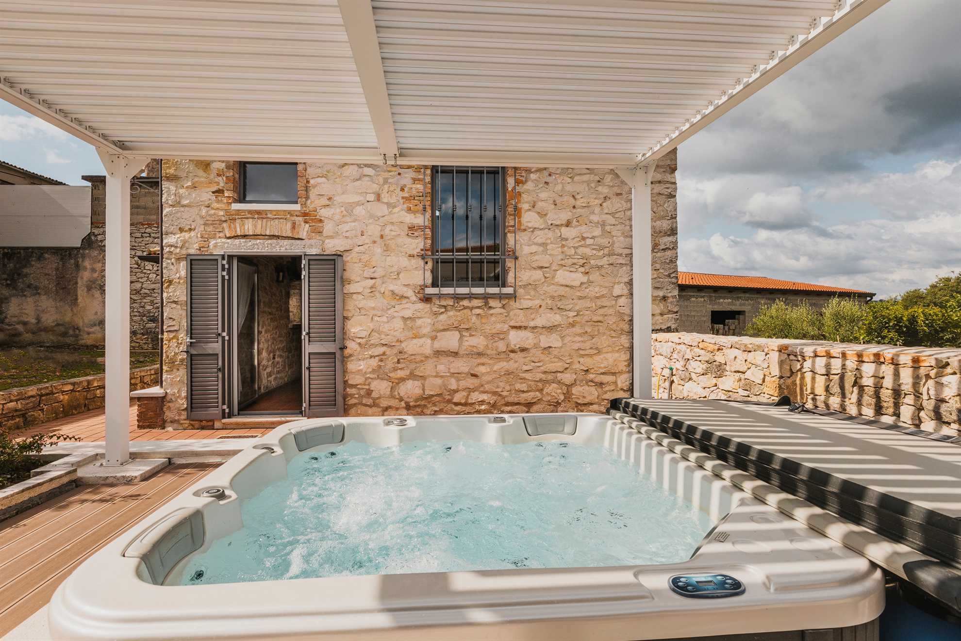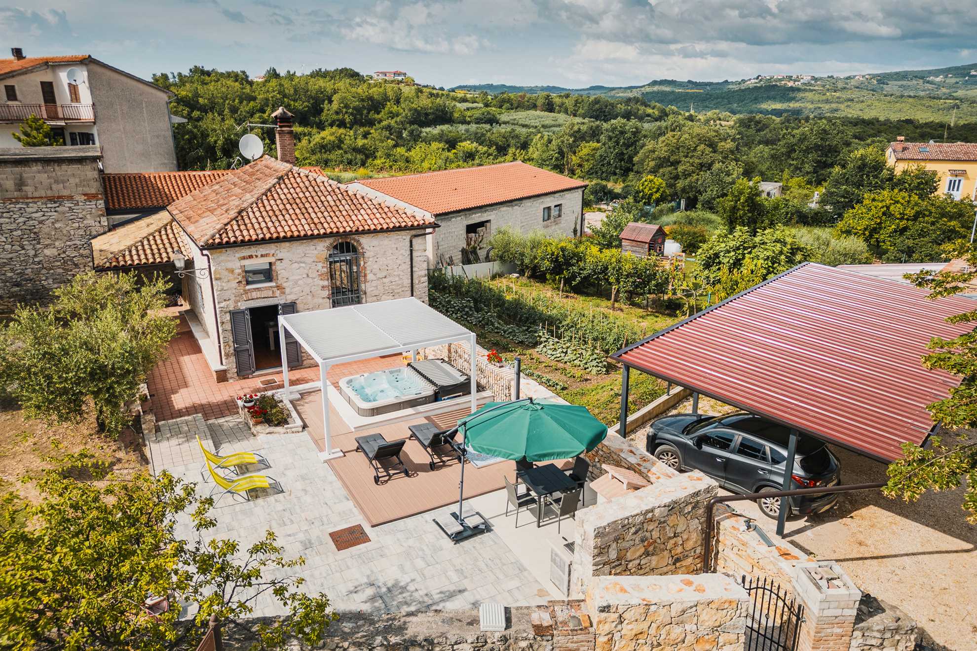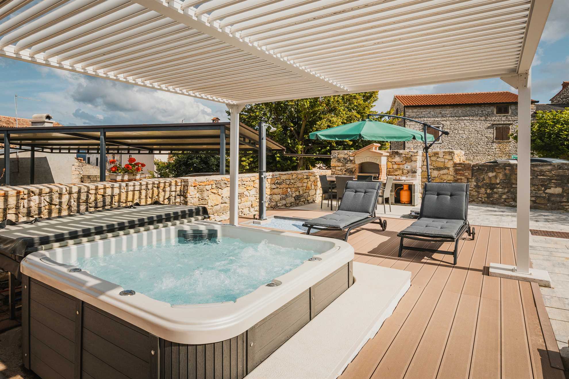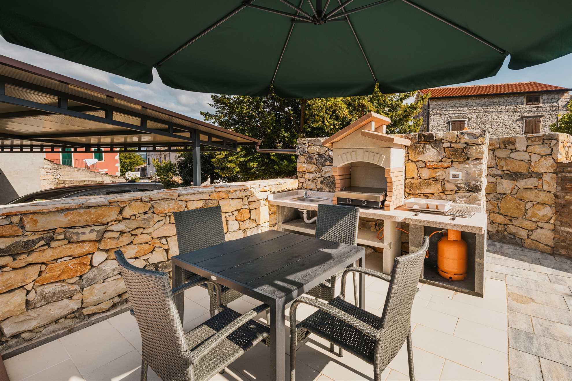 Step into this charming home in Brtonigla, where the serene gallery bedroom on the upper floor offers a luxurious double bed and opens onto a private terrace, perfect for morning coffee or stargazing. The cozy ground floor bedroom is furnished with a bunk bed, ideal for children or extra guests. There are two bathrooms: one on the ground floor with a refreshing shower, and the other in the gallery with a spacious bathtub and a bidet for added comfort.