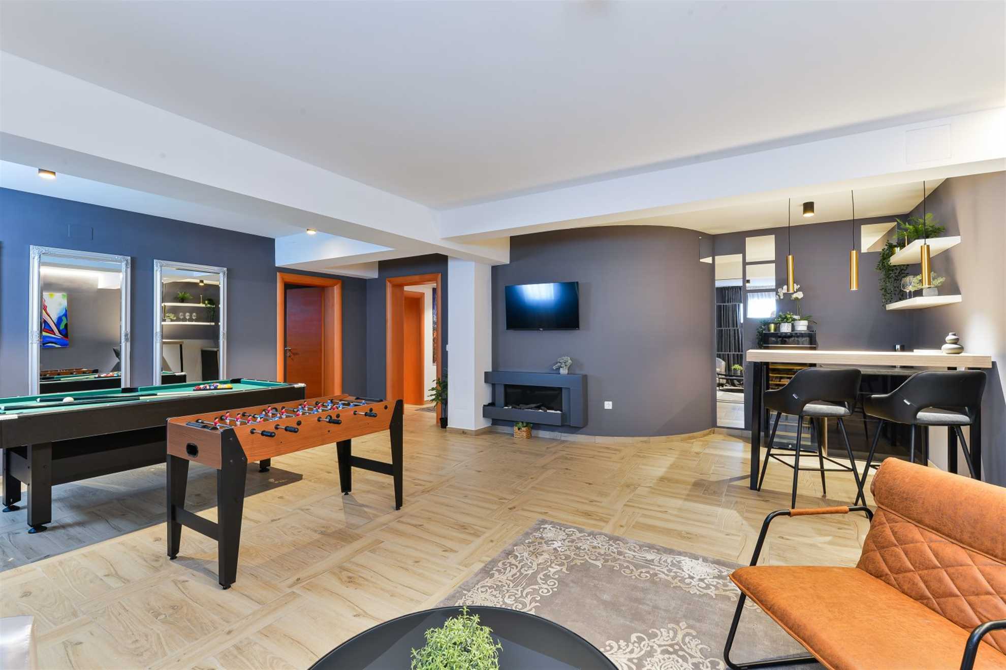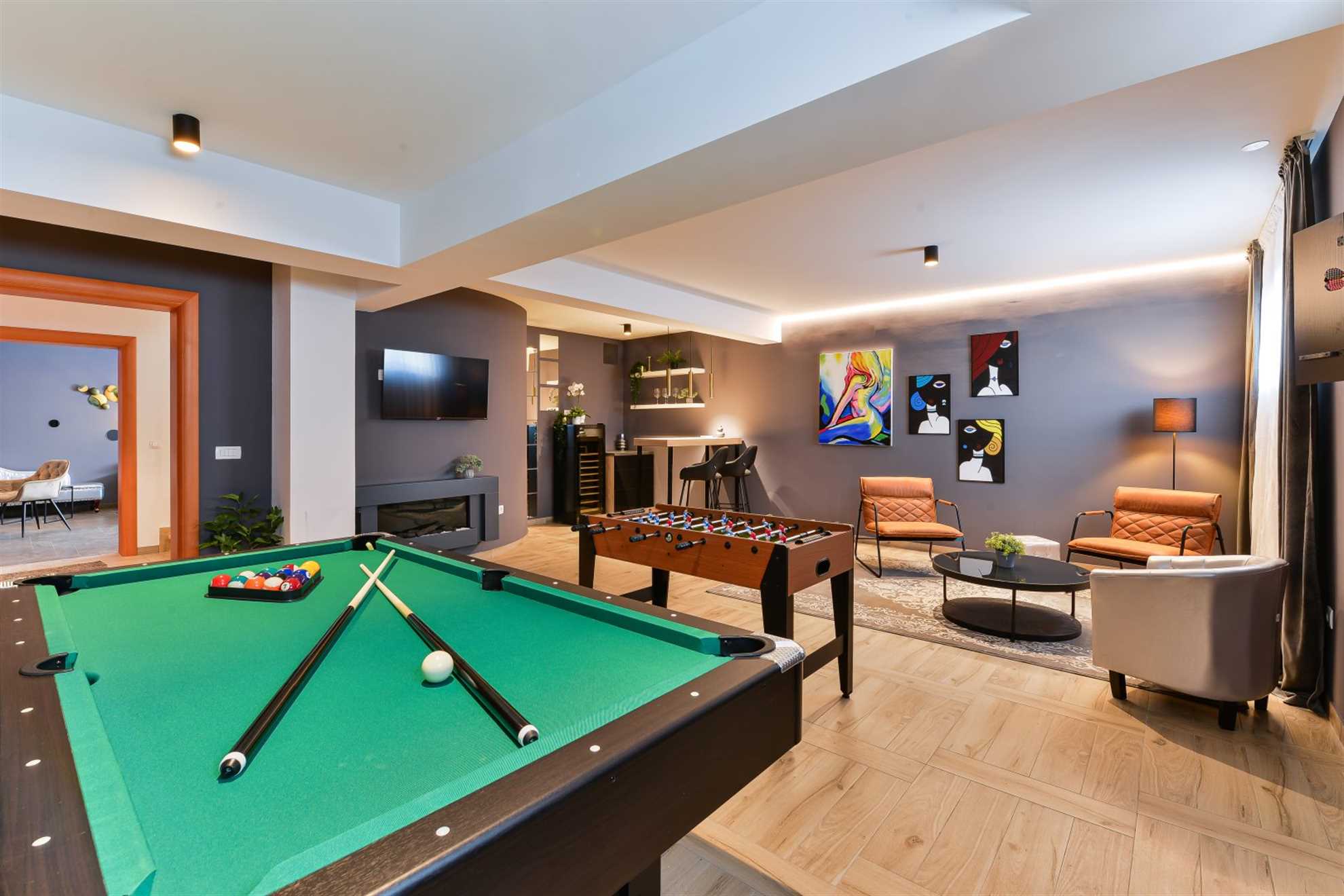 Underground Floor: The ultimate entertainment hub! Enjoy billiards, darts, table football, TV lounge, plus a wellness area with sauna, shower, and wooden loungers. One bedroom and a private bathroom complete this floor.