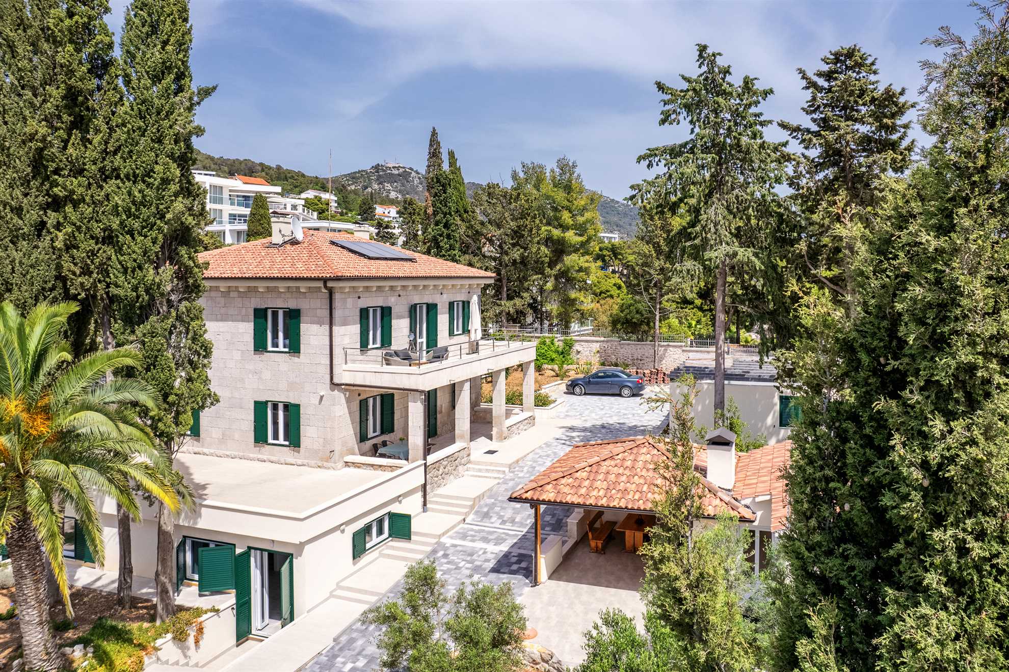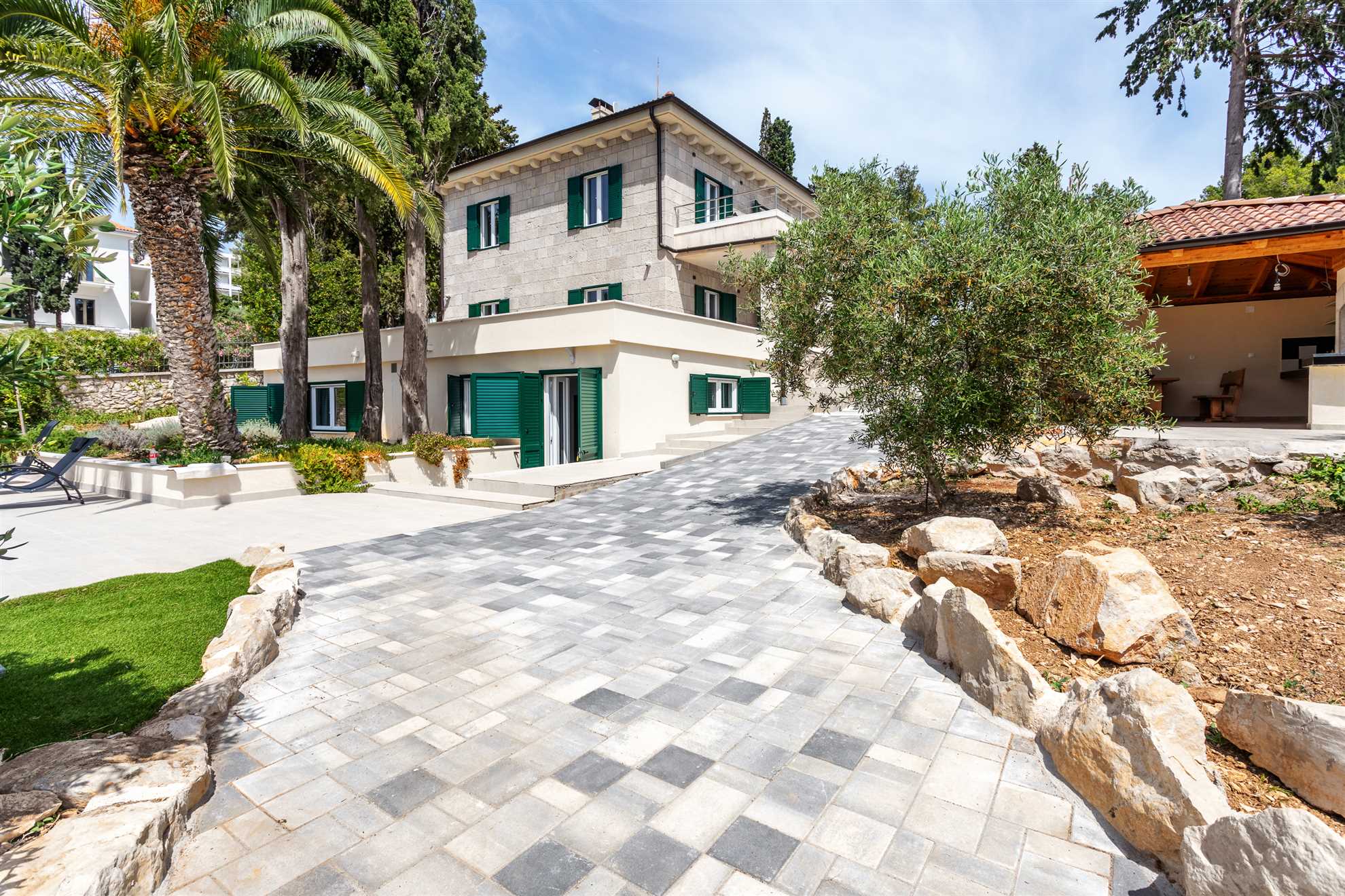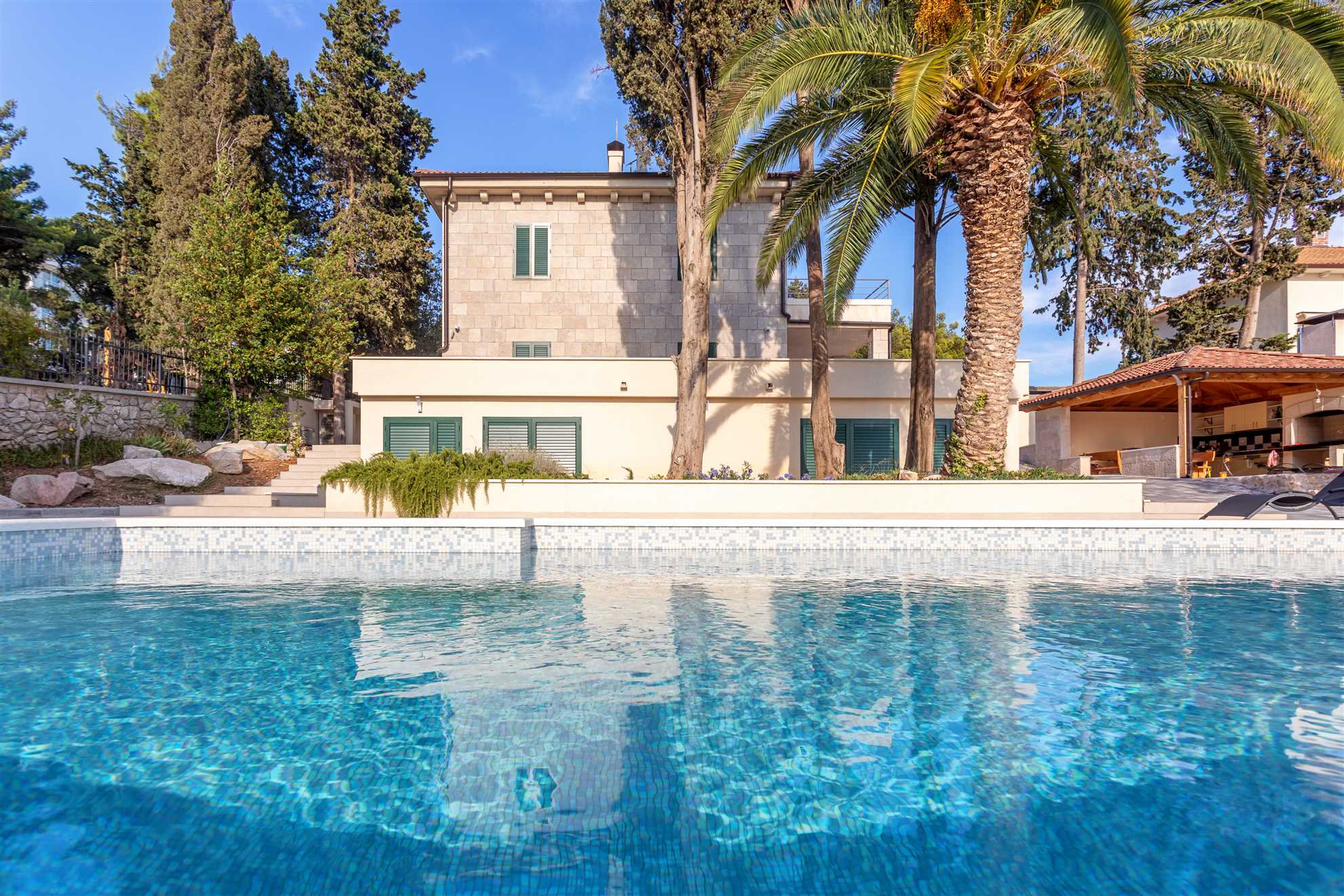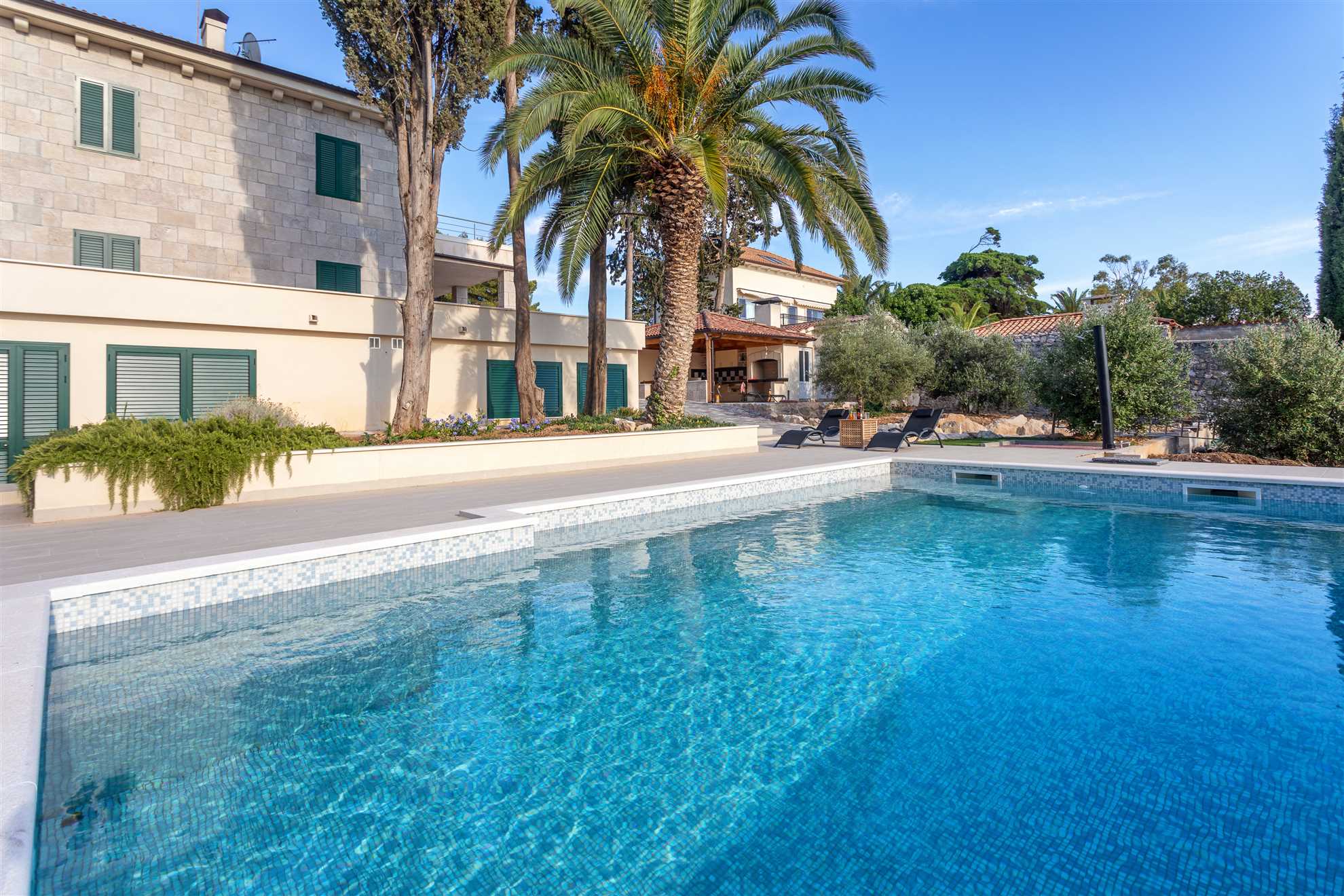 The enchanting Villa Garden Heights offers an exceptional location perched on a hill with breathtaking sea views, just a 2-minute walk from the beach and a 10-minute stroll to the heart of Hvar Town. Spread across two levels, the villa features its own living room and kitchen on each floor, providing ample space and privacy for larger groups or multiple families with its 5 bedrooms and 6 bathrooms. The impressive outdoor space spans 1,500 square meters and includes a charming gazebo with an outdoor kitchen and BBQ, a spacious pool, and a tranquil terrace ideal for lounging and soaking in the surroundings. With private parking and a beautifully landscaped garden, Villa Garden Heights offers the perfect retreat for a peaceful and unforgettable stay in Hvar.