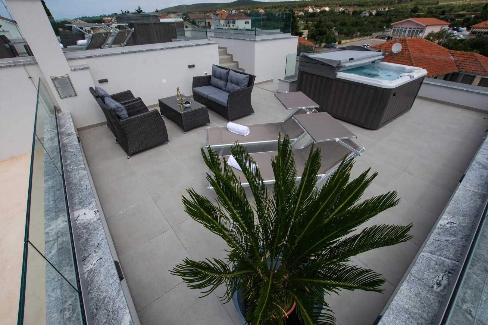 On the roof of the villa (third floor), there is a two-level sun terrace with 2 whirlpools, 2 sets of garden lounge furniture, and sun loungers. During the day, guests can take a relaxing bath in the sun while admiring the view of the sea and the nearby islands. In the evenings, enjoy beautiful sunsets with a glass of fine Croatian wine.
