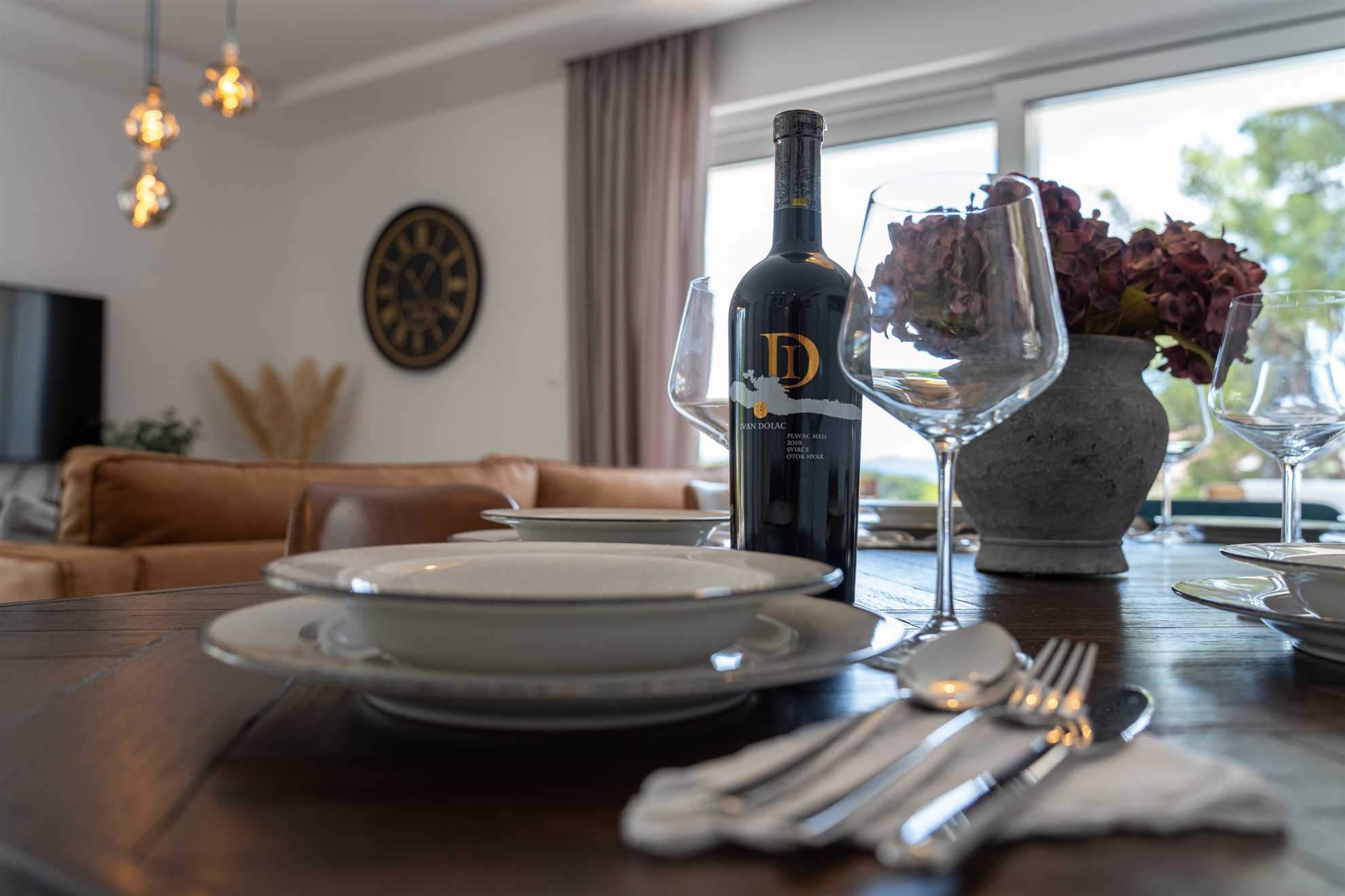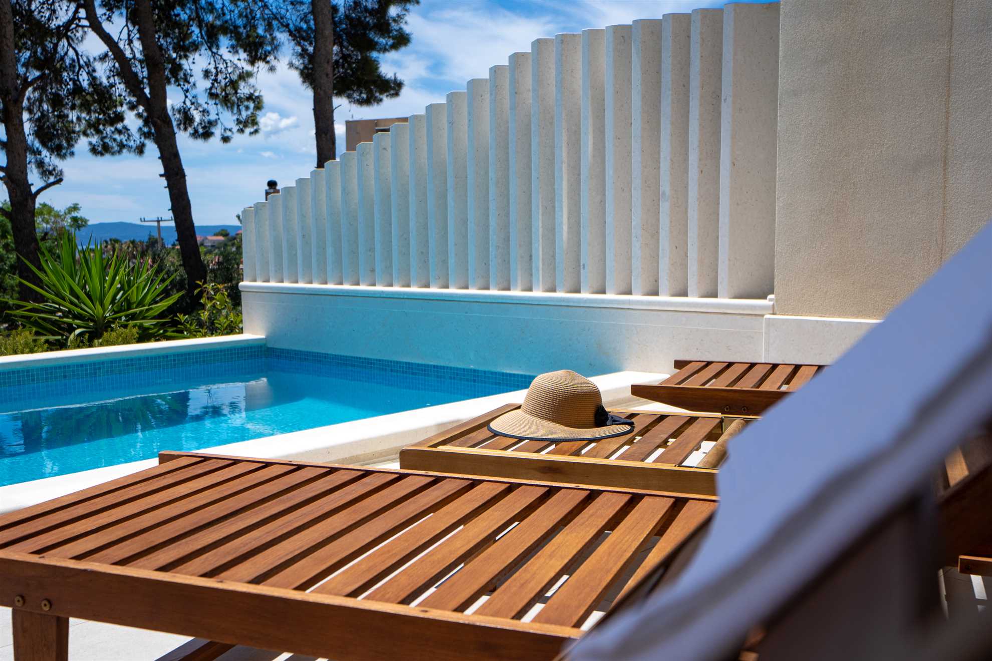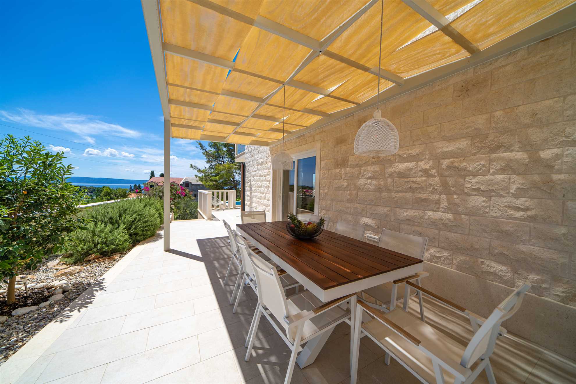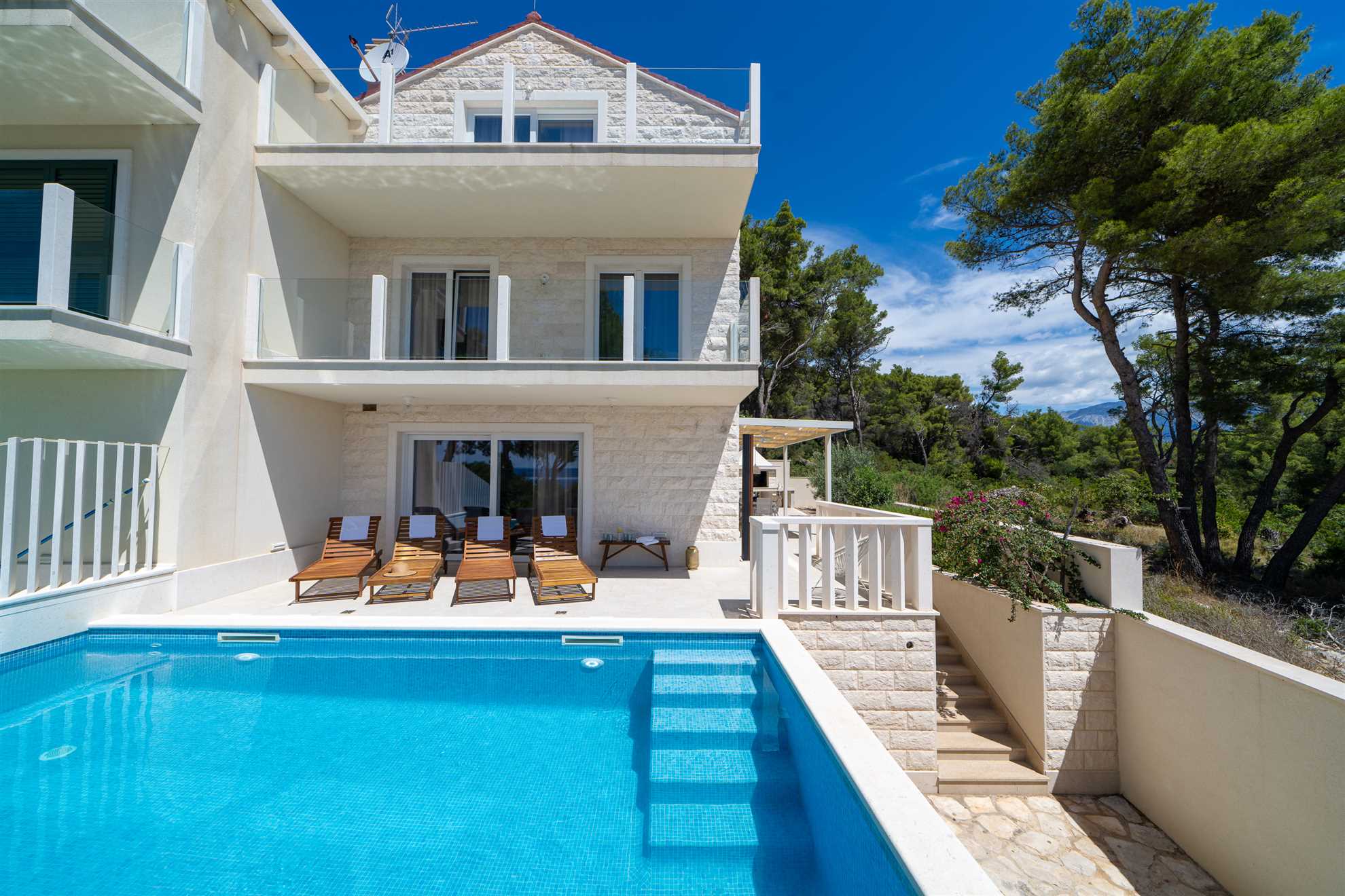 In the serene and picturesque village of Sumartin on the island of Brač, the luxurious semi-detached Mediterranean villa is crafted from exquisite stone, offering both elegance and comfort. Villa Belina features three beautifully designed bedrooms, including a master suite with breathtaking panoramic views of the sea and the charming bay of Sumartin. Ground floor boasts a fully equipped kitchen, an elegant dining room, and a stylish living room that combines warm, inviting hues to create a cozy, welcoming atmosphere. From here access a spacious terrace with a heated outdoor pool, and a traditional stone barbecue area—ideal for al fresco dining and relaxation. We invite you to gather your loved ones and furry companions, and let us welcome you to your perfect, relaxing holiday retreat on Brač.