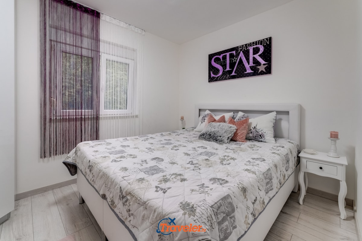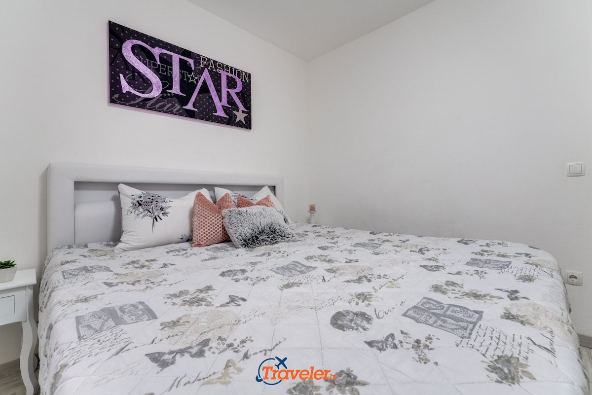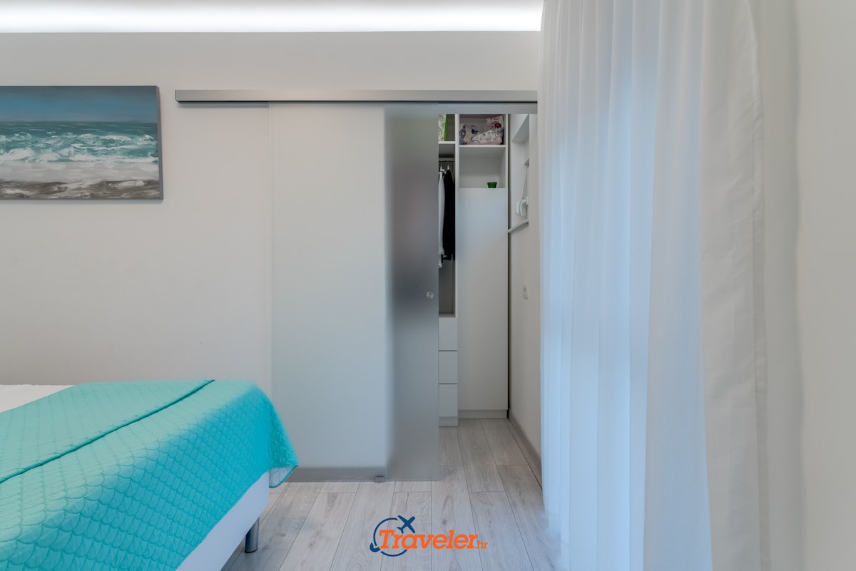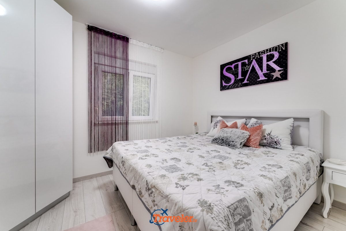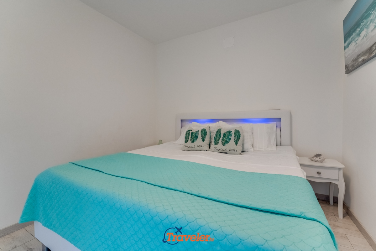 On the upper floor of the villa there are 2 apartments. Each apartment has one bedroom with double bed, bathroom, kitchen and living room.