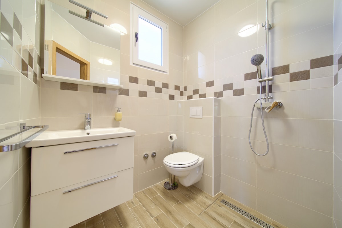 Villa has 2 bedrooms, each with double bed, 2 bathrooms and outdoor shower. One guest can sleep on the sofa bed in the living room. The villa offers accommodation for a total of 5 people. The kitchen is equipped with modern furniture and has a stove, washing machine, refrigerator, toaster and coffee machine. The house has its own electricity supply via sun collectors. The living room opens a large terrace with sofas and barbecue, and an infinity pool that offers a magnificent view, where you will surely enjoy in your free time.