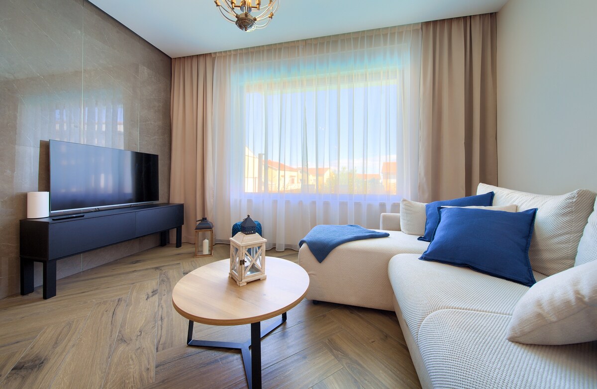 This completely new modern villa is located 600 meters from the sea and a beautiful beach. It accommodates 8 guests in total. On the ground floor of the villa there is a fully equipped kitchen with a dining room, a living room and a toilet. The sofa in the living room is used as an extra bed for 2 people.