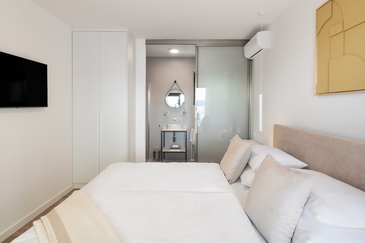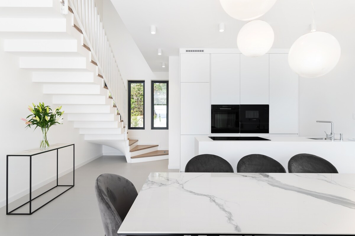 On the ground floor of this modern beauty there is one bedroom and an open living room and a fully equipped kitchen.