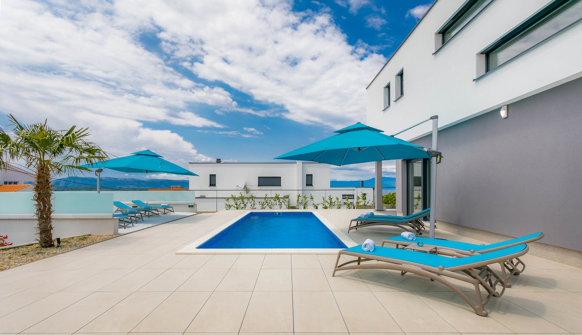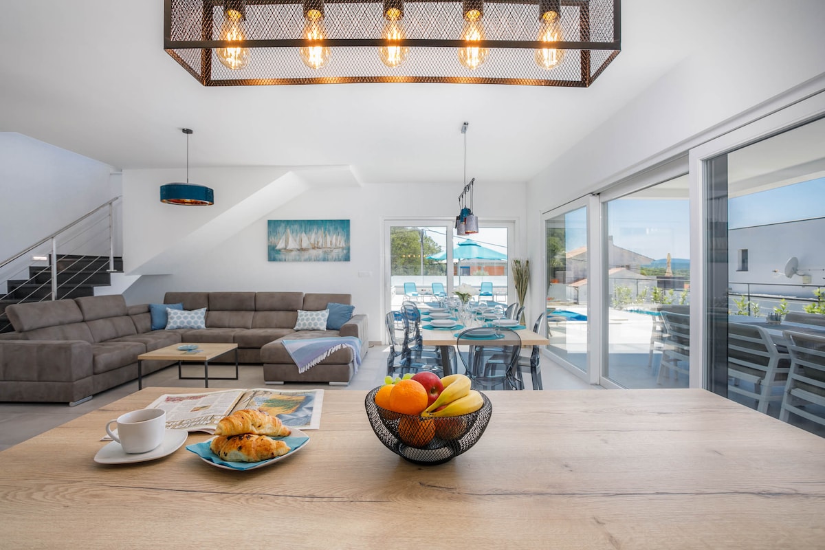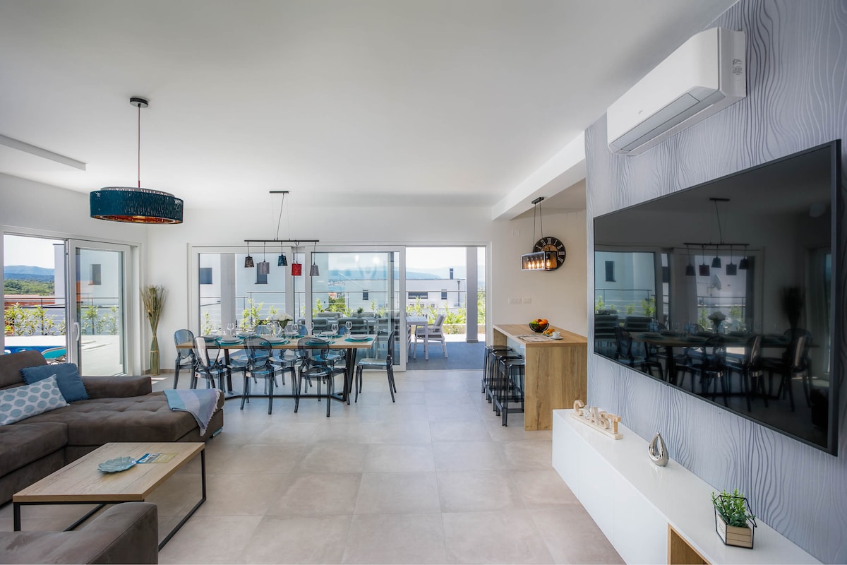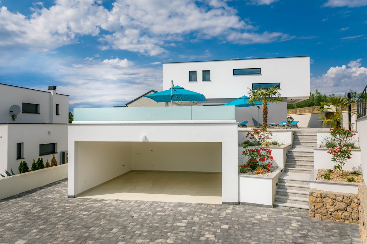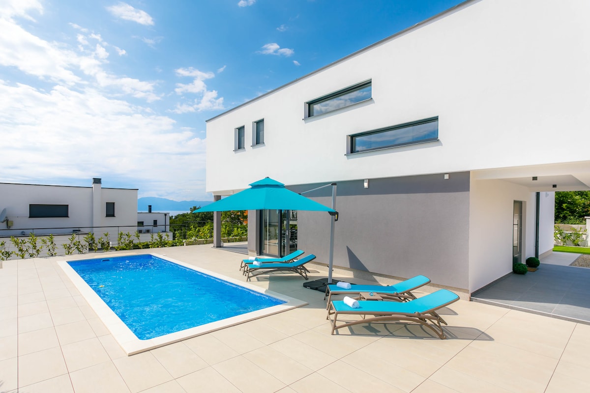 In the small and quiet village of Kremenići, not far from the famous tourist center of Malinska, on the island of Krk, is located this brand new beautiful villa with a swimming pool.