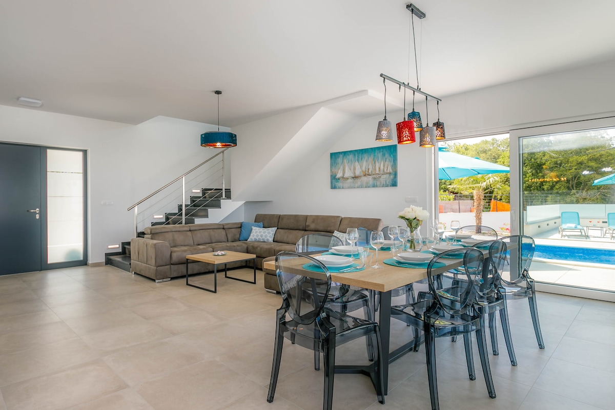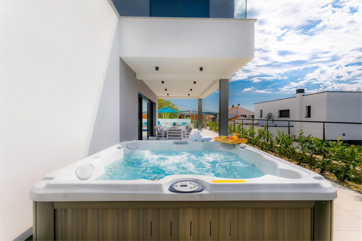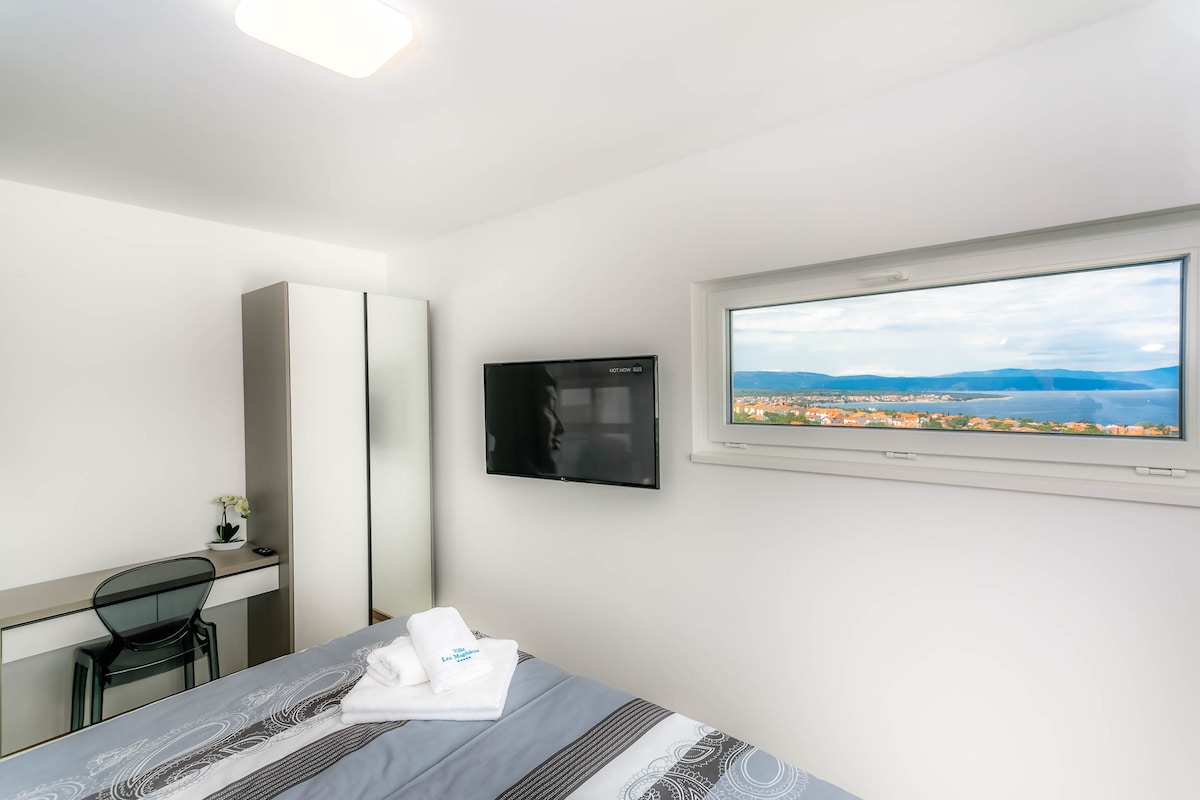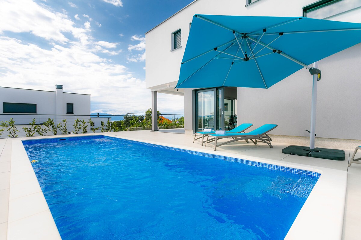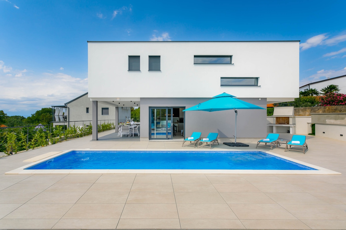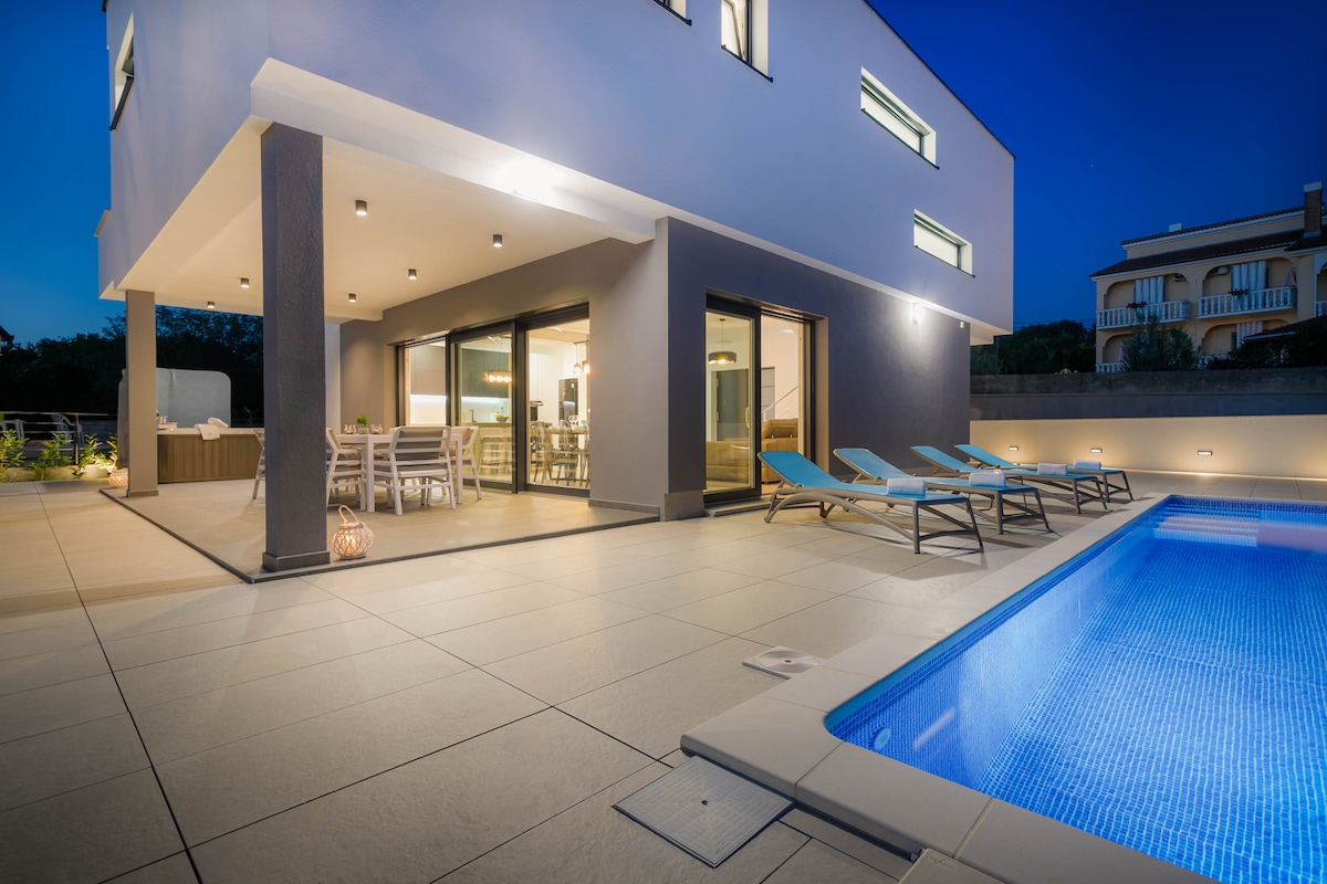 In the small and quiet village of Kremenići, not far from the famous tourist center of Malinska, on the island of Krk, is located this brand new beautiful villa with a swimming pool.