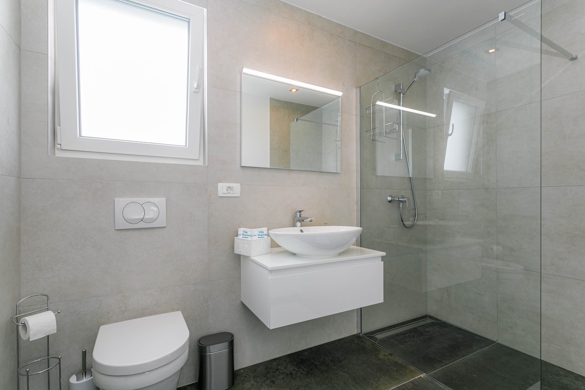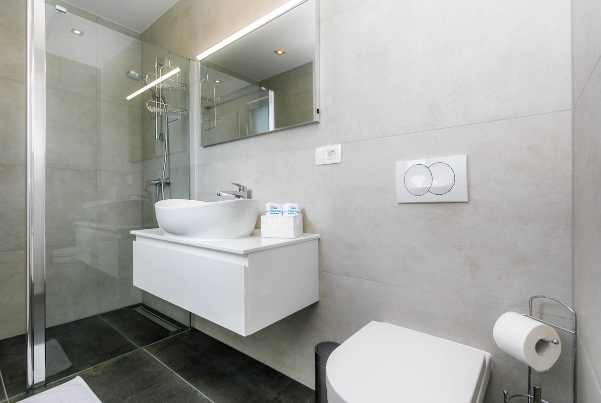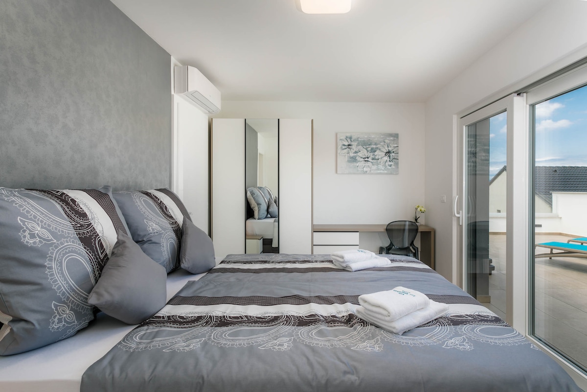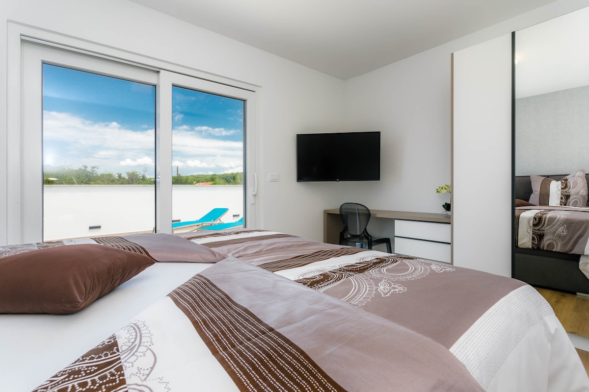 The villa has approx. 220 m2, 4 bedrooms, 4 bathrooms and can accommodate a total of 10 guests. On the ground floor of the villa there is a spacious living room with direct access to the pool, a fully equipped modern kitchen, one bedroom, bathroom and toilet.