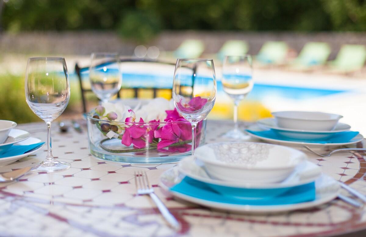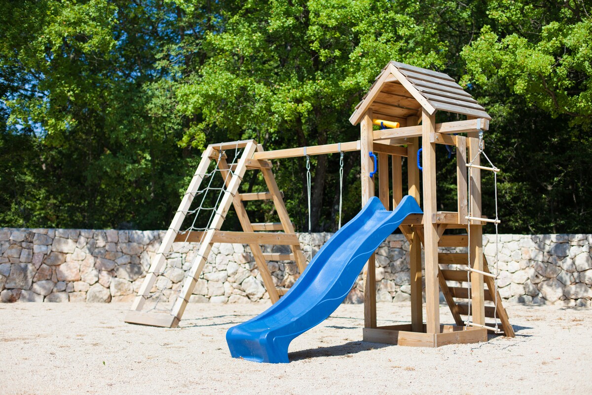 Next to the pool is a covered terrace with table and barbecue, as well as a large children's playground. Near the villa you will find a small shop, where you can buy fresh pastries and other groceries.