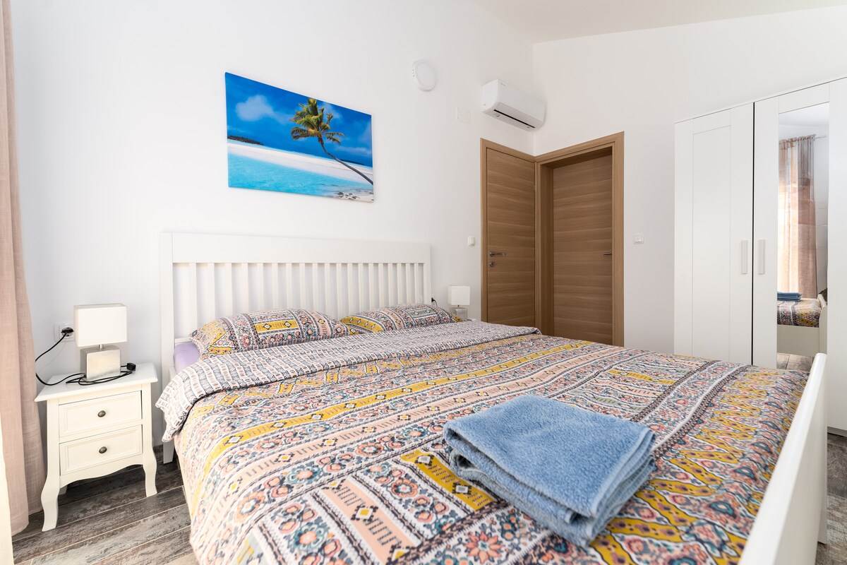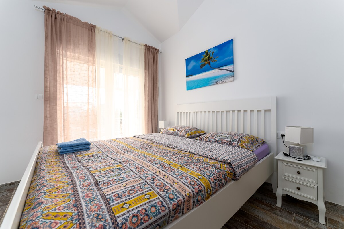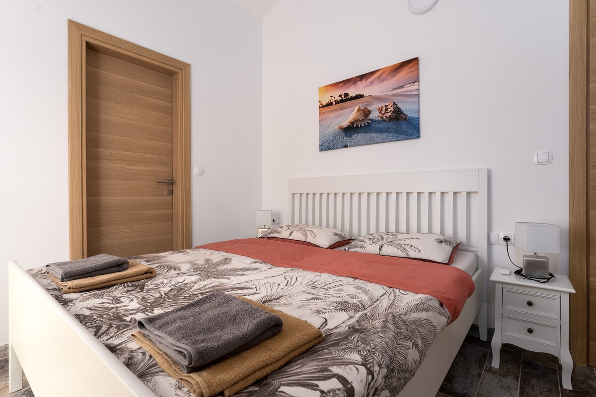 On the ground floor of the villa is situated a spacious living room, a fully equipped kitchen (dishwasher, microwave, toaster, coffee maker), one bedrooms and bathroom. From the living room you can access a covered terrace with seating and barbecue. Right next to the terrace is a pool of 35 m2 with sundeck and sun loungers where you can enjoy your time with family and friends.