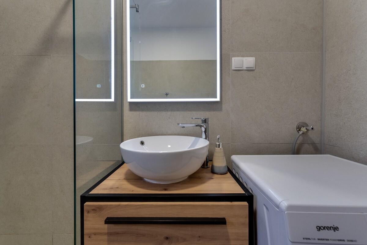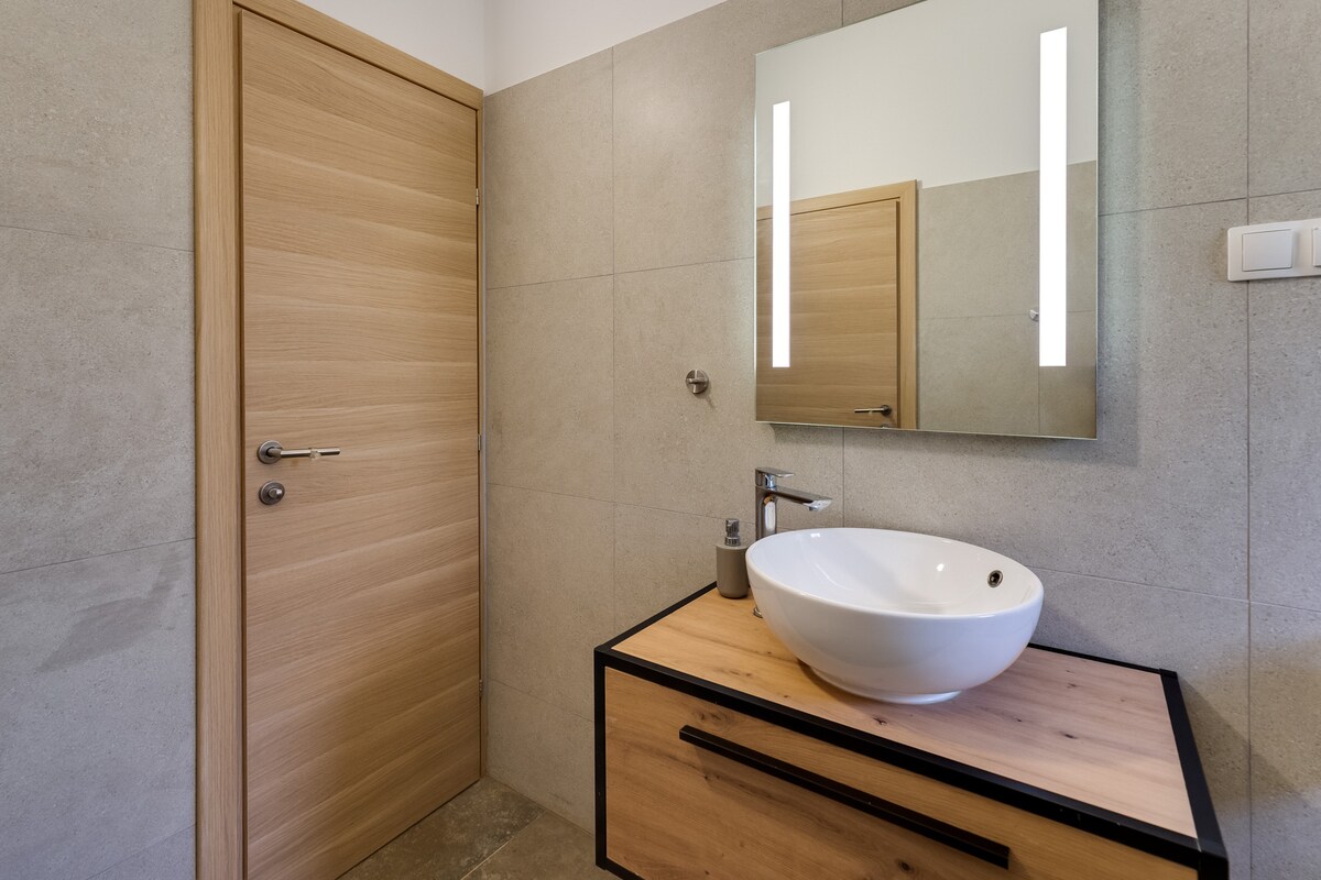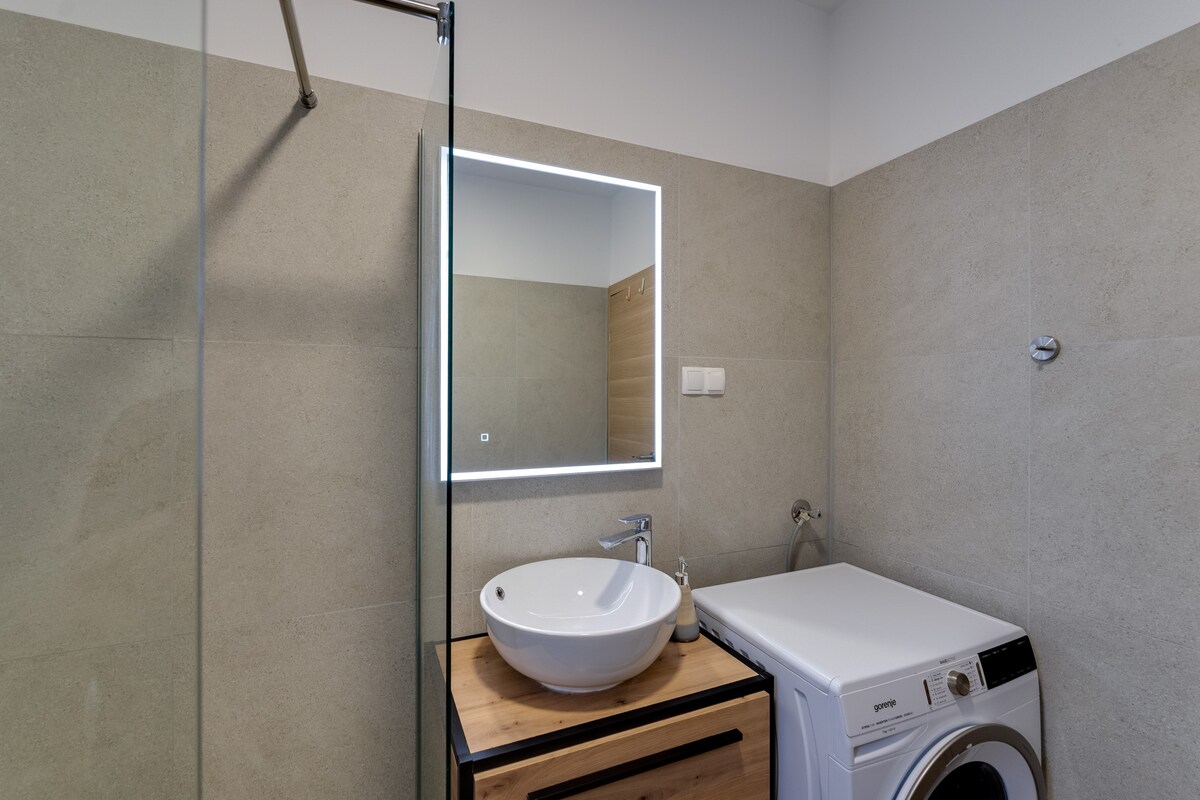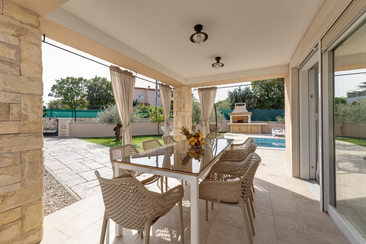 On the ground floor of the villa is situated a spacious living room, a fully equipped kitchen (dishwasher, microwave, toaster, coffee maker), one bedrooms and bathroom. From the living room you can access a covered terrace with seating and barbecue. Right next to the terrace is a pool of 35 m2 with sundeck and sun loungers where you can enjoy your time with family and friends.