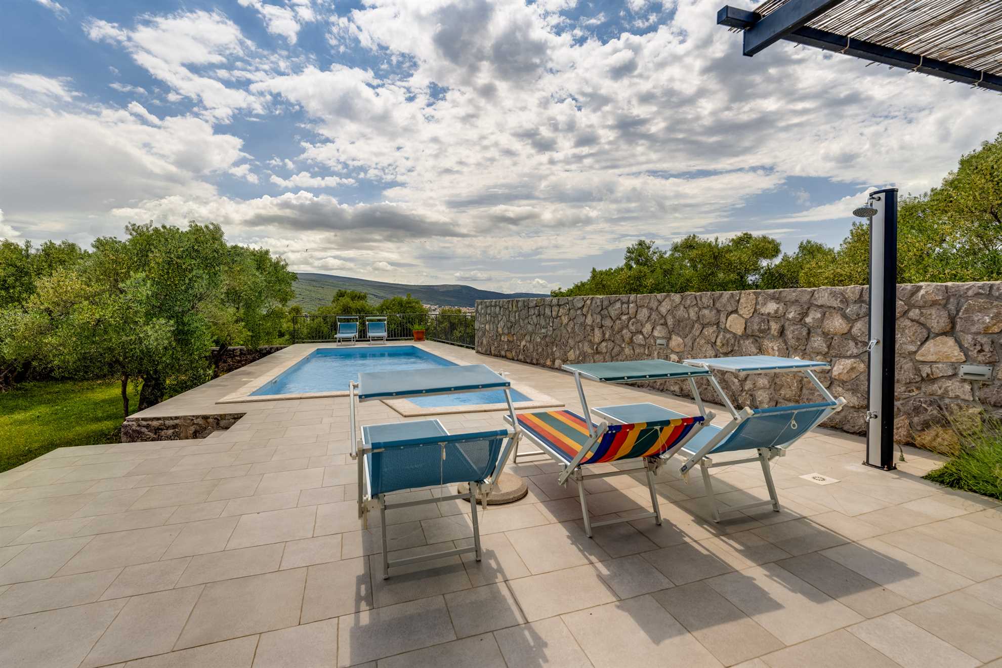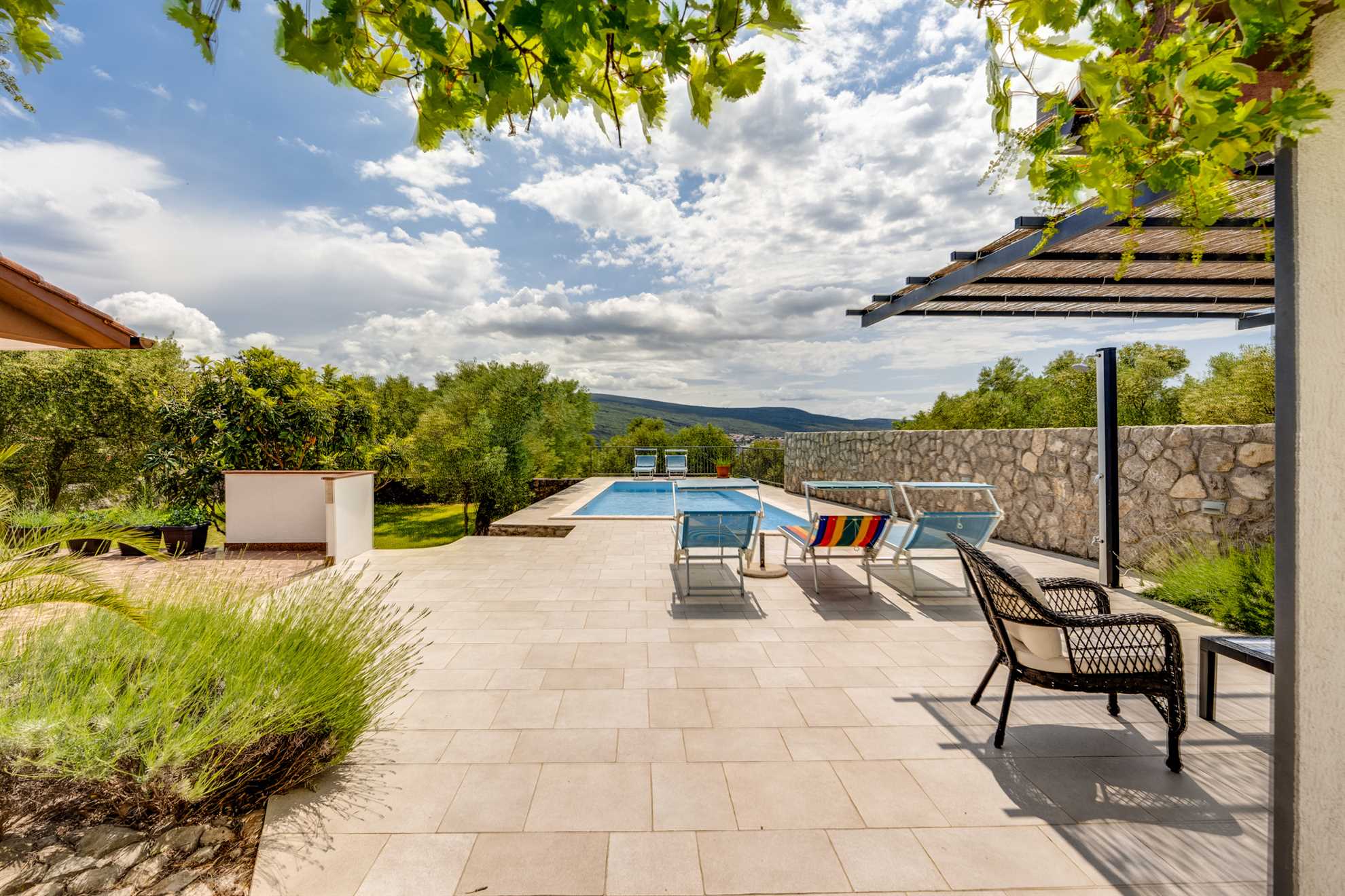The small village where Villa is located is perfect, for all those who want to escape from the hectic everyday life and stress. Nice, clean air, the chirping of birds and the only thing you can hear is the village church bells in the morning. The island of Krk is the largest island on the Adriatic, and is full of attractions that will keep your attention occupied for only 5-15 minutes by car to all locations. The motorway and airport are also nearby by. Krk town has beautiful old churches, old city walls, towers and the remains of the ancient Romans, the town of Vrbnik is known for its vineyards and excellent wines, Punat with the largest marina on the Adriatic and Košljun with the famous Franciscan monastery with a museum. Baska has one of the largest sandy beaches and an aquarium, Soline Bay has healthy mud and Biserujka cave. In all these places there are many restaurants where you can try fresh fish, wine and other specialties, take a trip with the fishing and tourist boats and swim with dolphins or take children to ride a submarine (the town of Krk) .