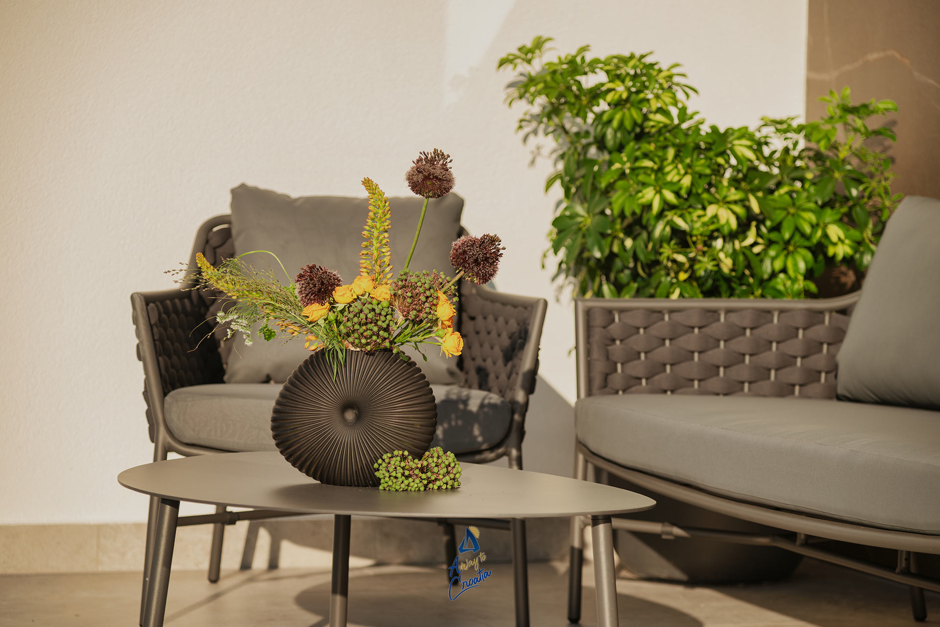 Spread across two floors, Villa KIM welcomes you with a spacious open-plan living and dining area, complete with a fully equipped kitchen and a central island – ideal for cooking and entertaining. On the ground floor, you’ll also find a stylish en-suite bedroom with direct access to the terrace. Upstairs, three beautifully appointed bedrooms, each with its own bathroom, provide comfort and privacy, with one enjoying access to a private terrace.