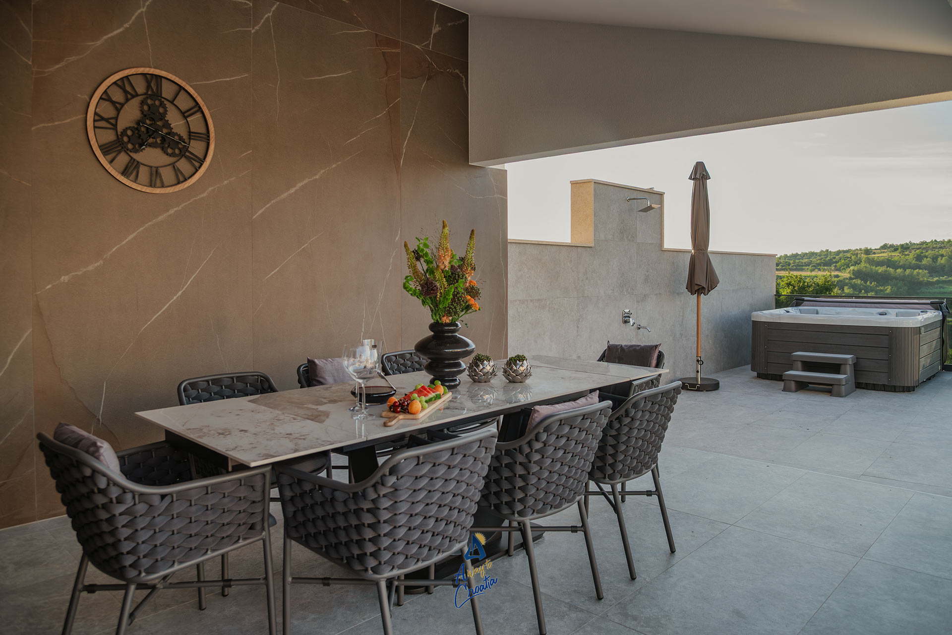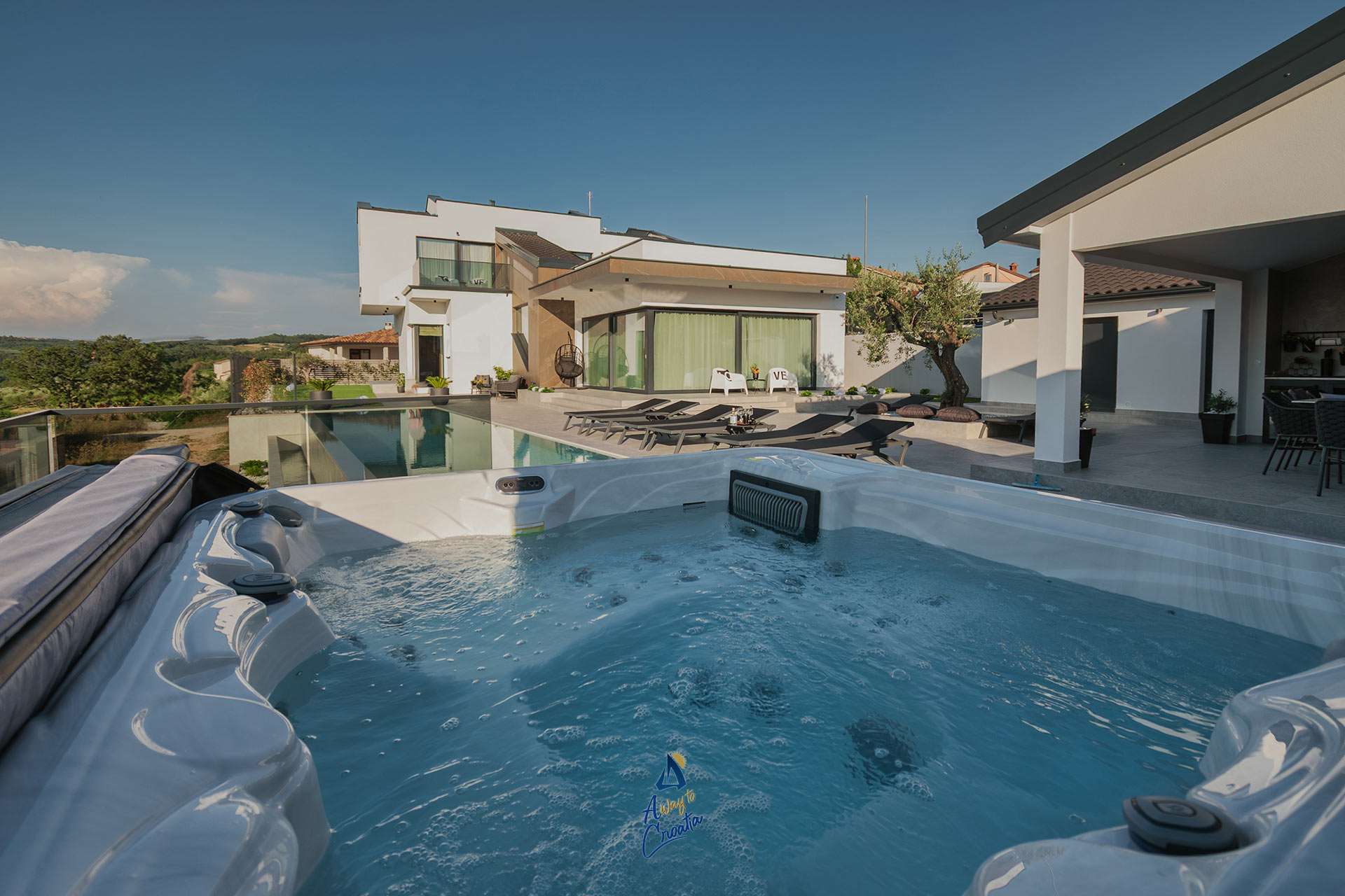 Step outside and discover your own private paradise: a saltwater infinity pool that seems to melt into the horizon, a jacuzzi on the terrace for unforgettable sunsets, and a separate summer kitchen with a barbecue and dining area – perfect for long evenings under the stars. For moments of pure relaxation, the villa also features its own spa area with a sauna.