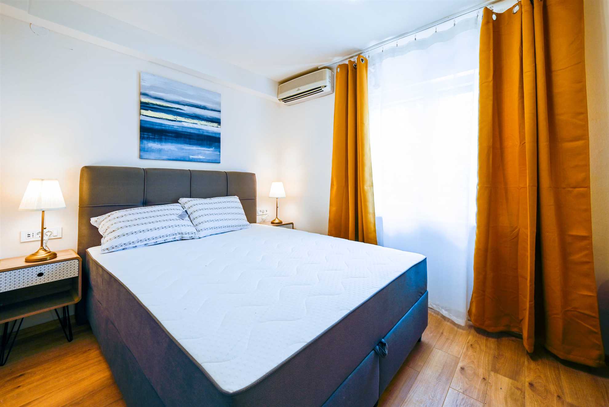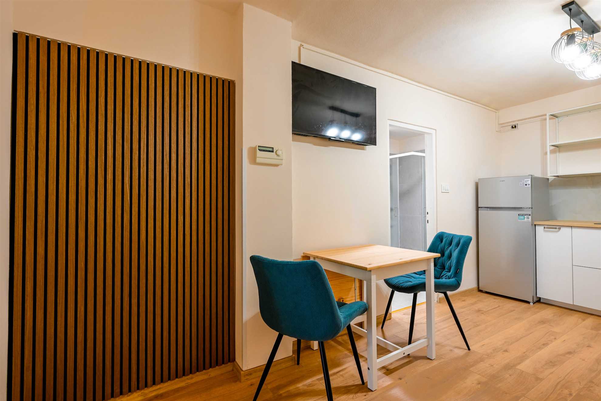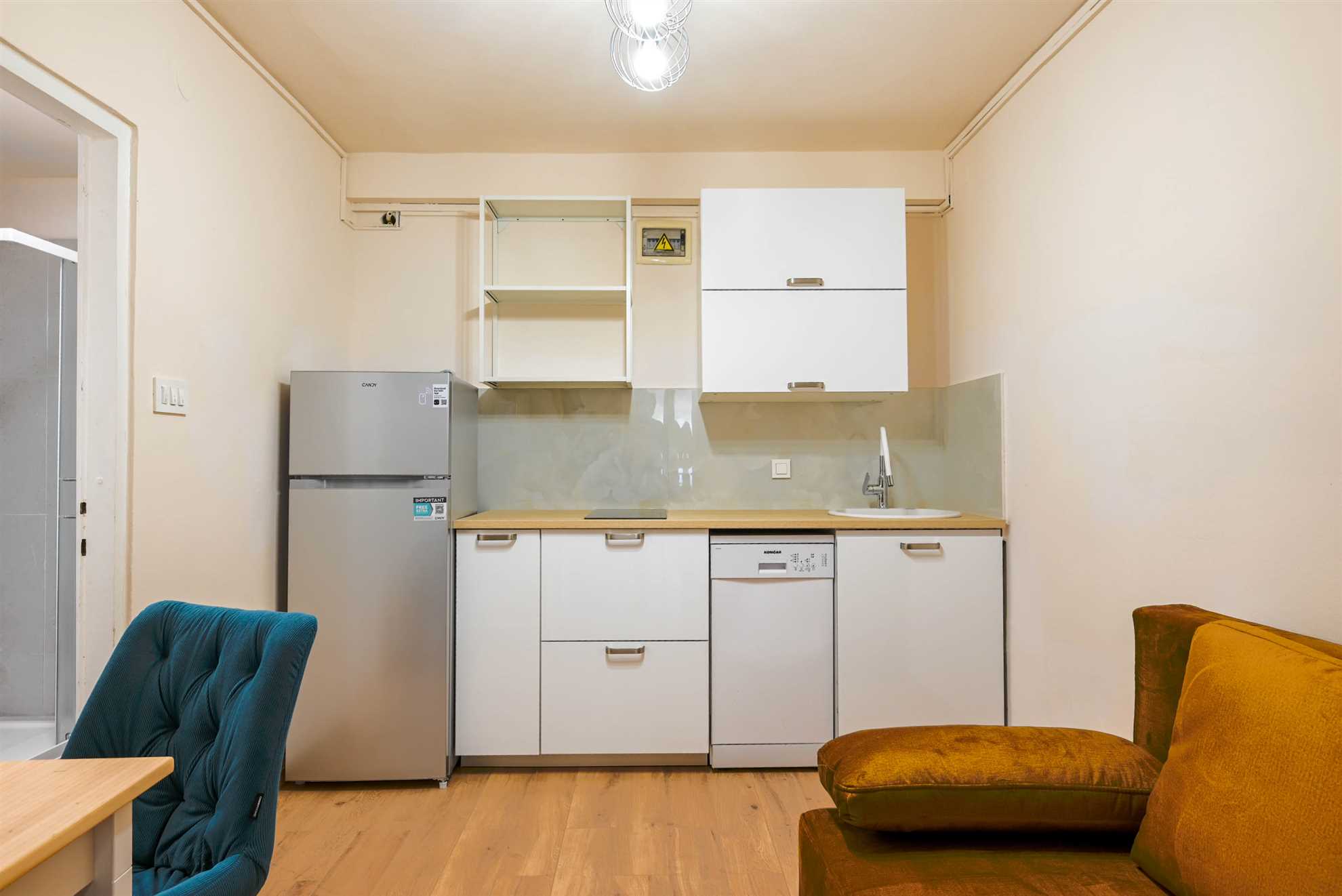 Apartment have one separate bedrooms with double bed and air condition, with laptop friendly desk and smart TV. Free wifi is available. In kitchen there is table with chairs and sofa that can be used for third person. Kitchen have fridge, dishwasher and all necessary to prepare meals.