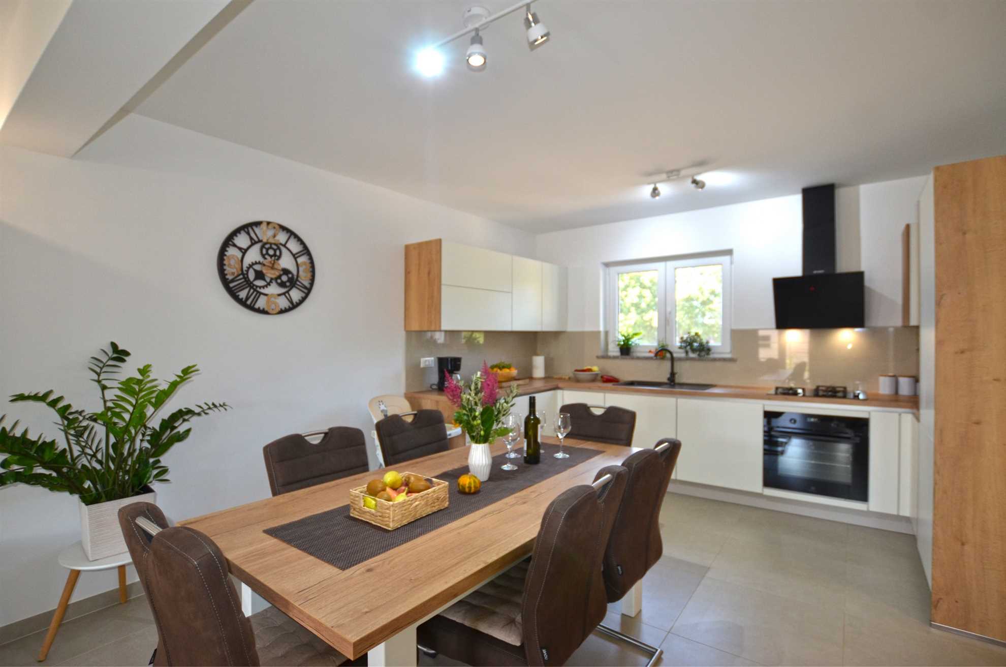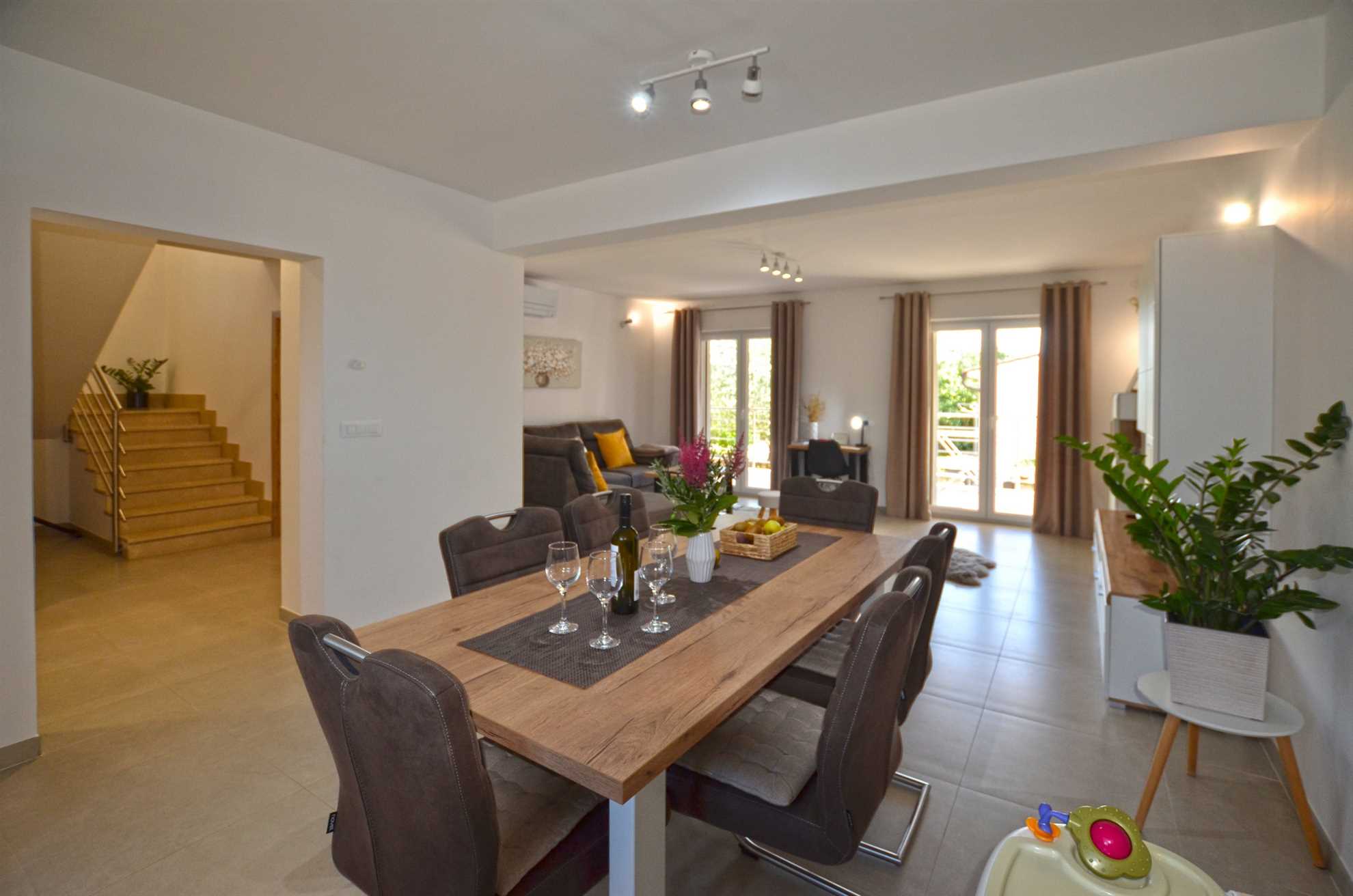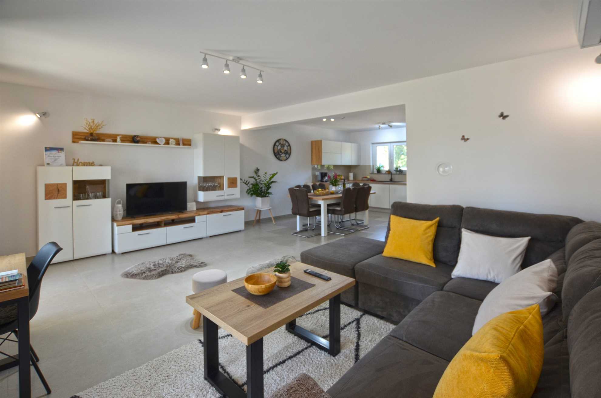 A generously sized and warmly decorated living room invites you to sit back, unwind, and enjoy heartfelt conversations, shared laughter or a captivating book. This tranquil environment beautifully complements the serene Croatian evening sky after a fantastic day of sightseeing.