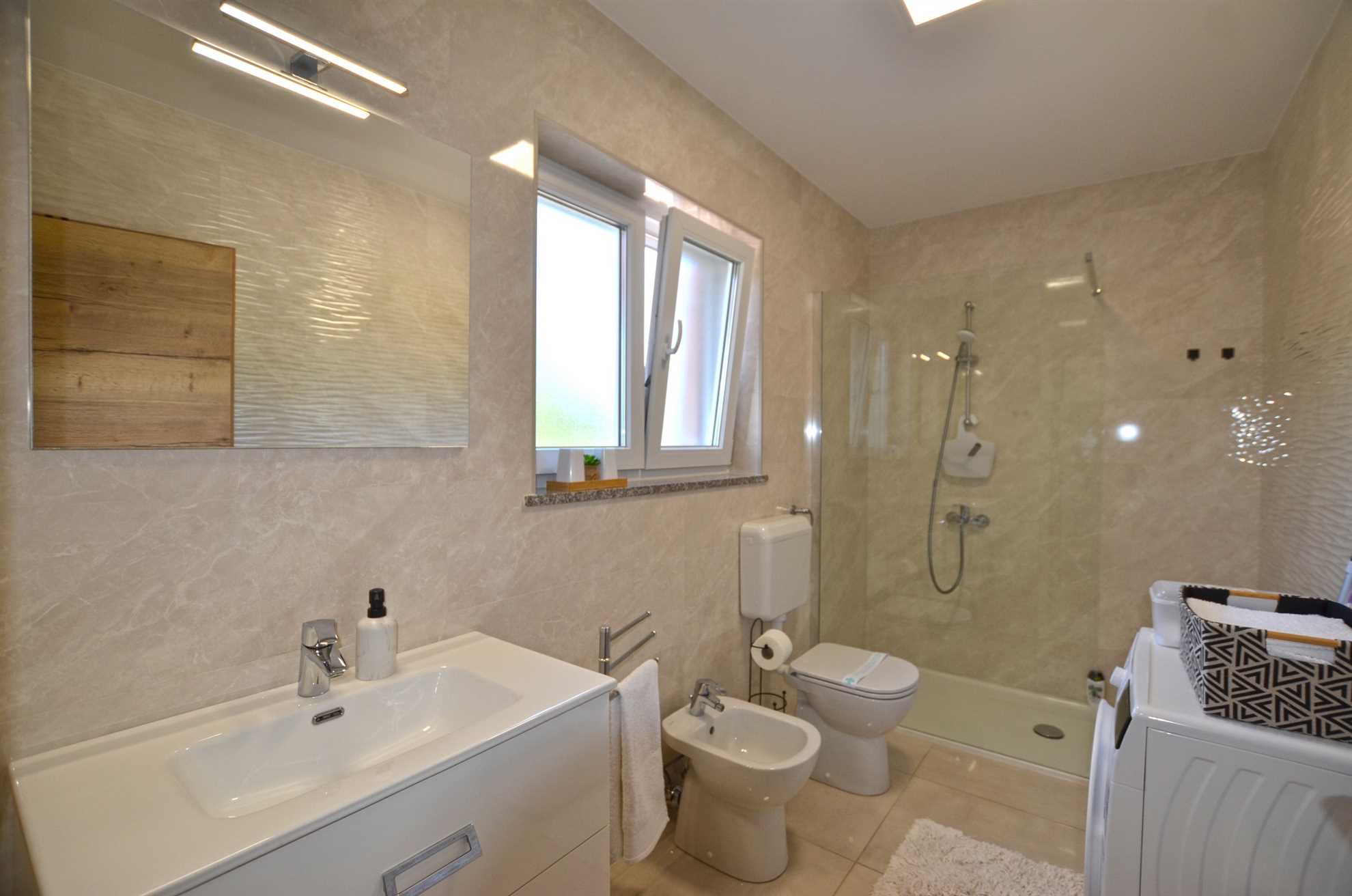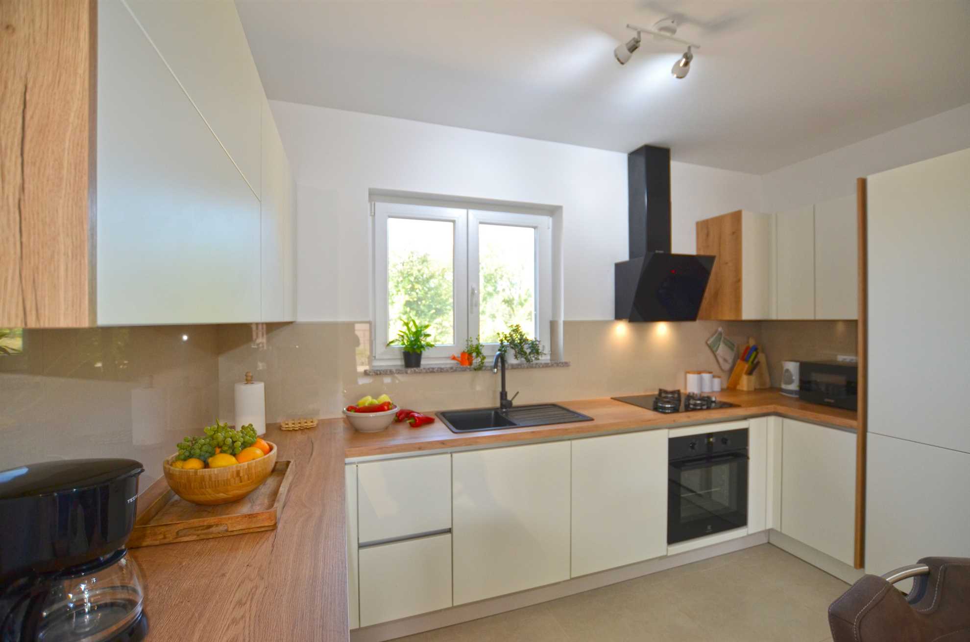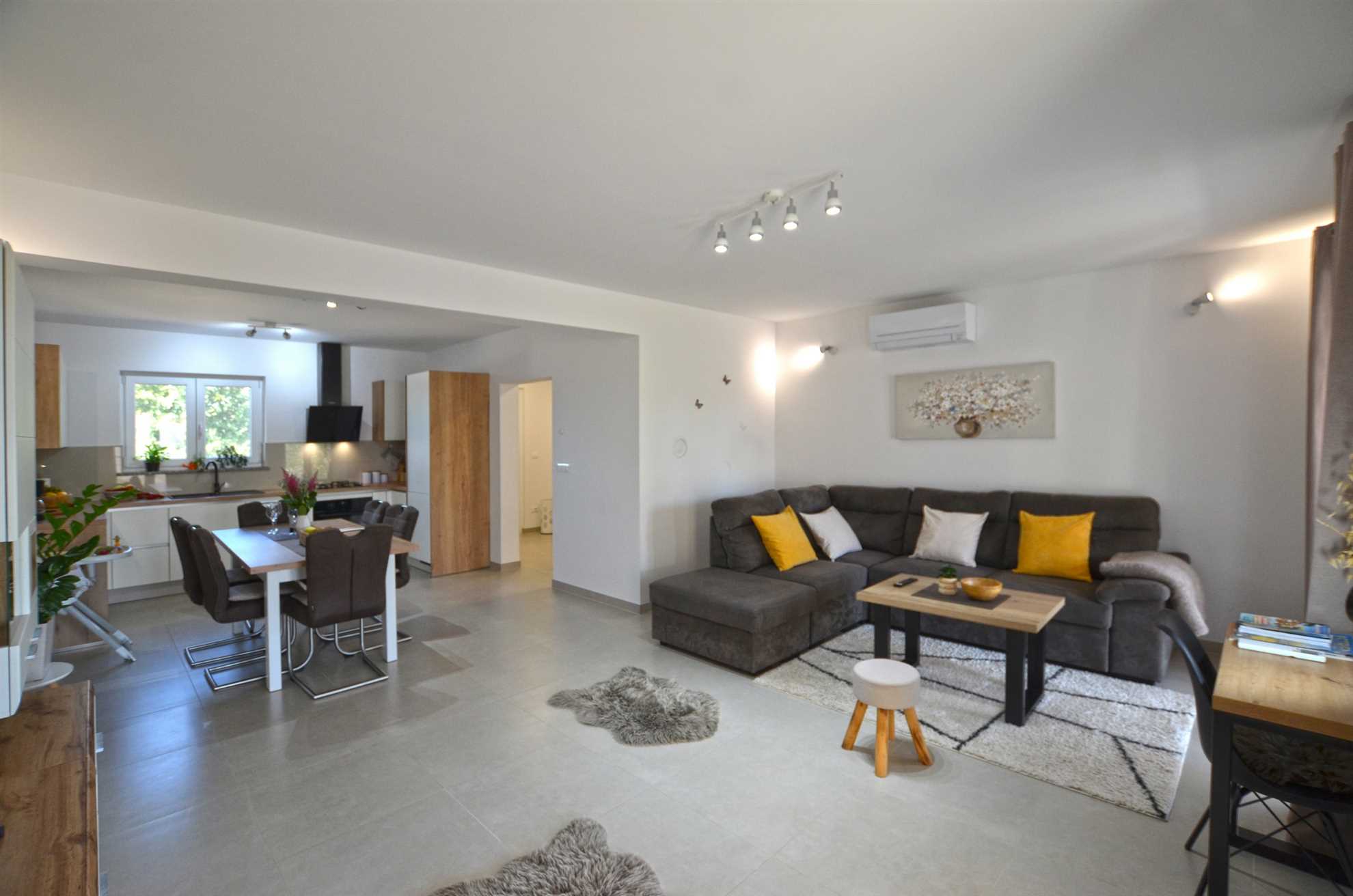 A generously sized and warmly decorated living room invites you to sit back, unwind, and enjoy heartfelt conversations, shared laughter or a captivating book. This tranquil environment beautifully complements the serene Croatian evening sky after a fantastic day of sightseeing.