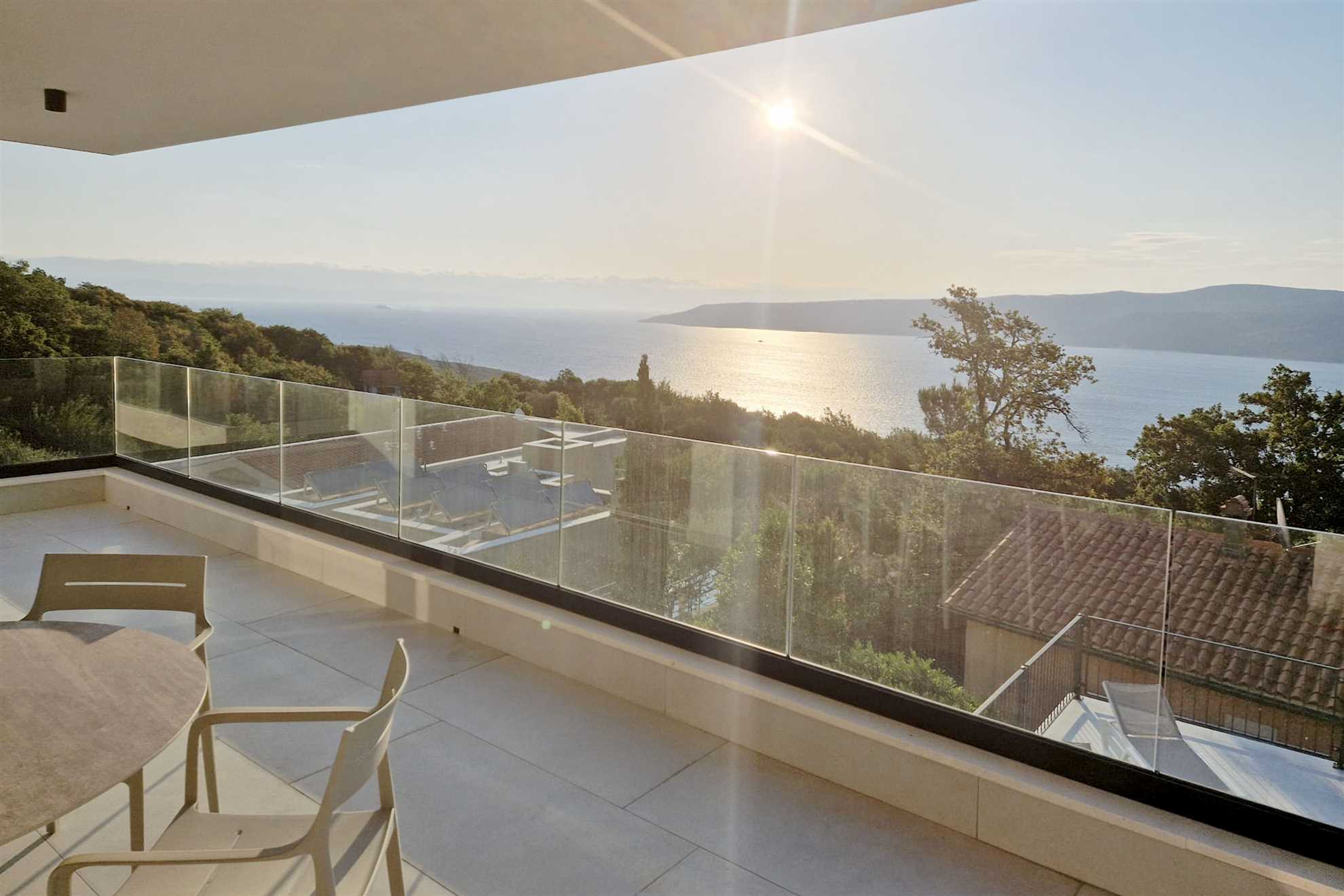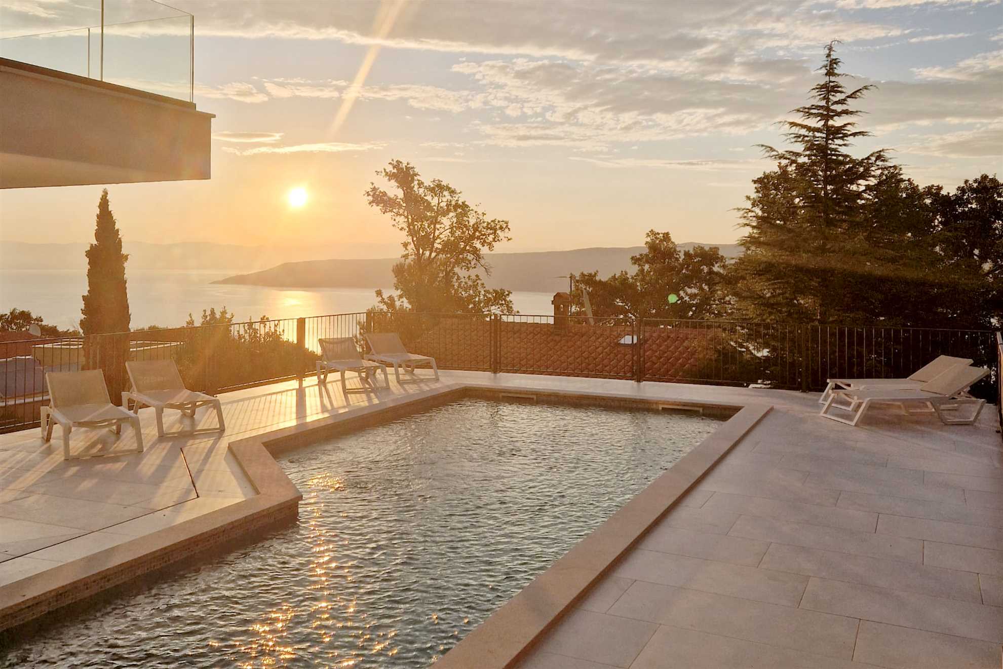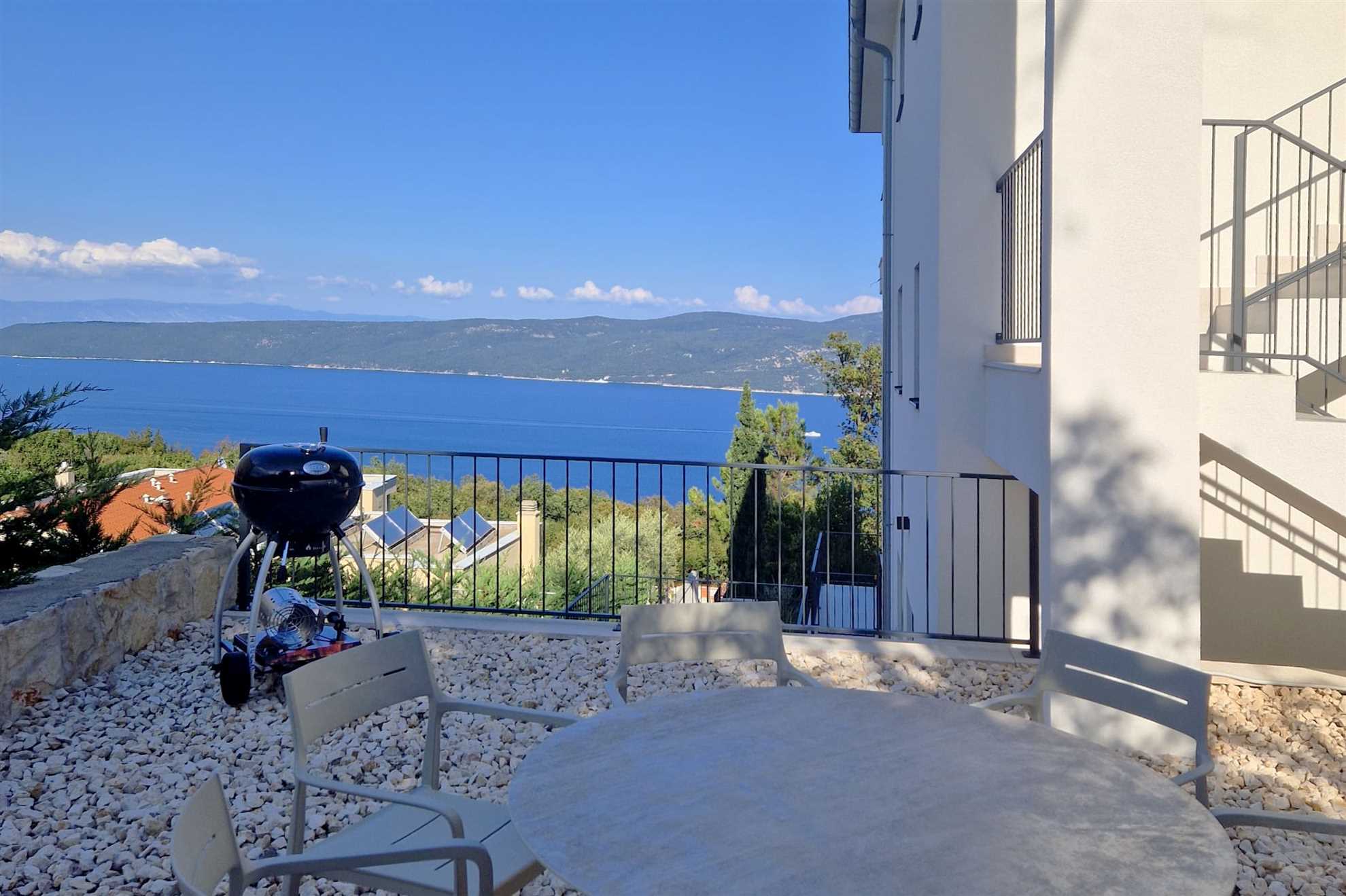 The outdoor area features a refreshing private 36 m² pool (12×3×1.5 m), offering panoramic sea views that reach all the way to the island of Cres. Pool heating is available for an additional fee, making it enjoyable even during cooler months. A spacious deck surrounds the pool and is furnished with ten sun loungers and four parasols, along with a convenient outdoor shower with both hot and cold water — perfect after a swim or a sunny afternoon by the water.