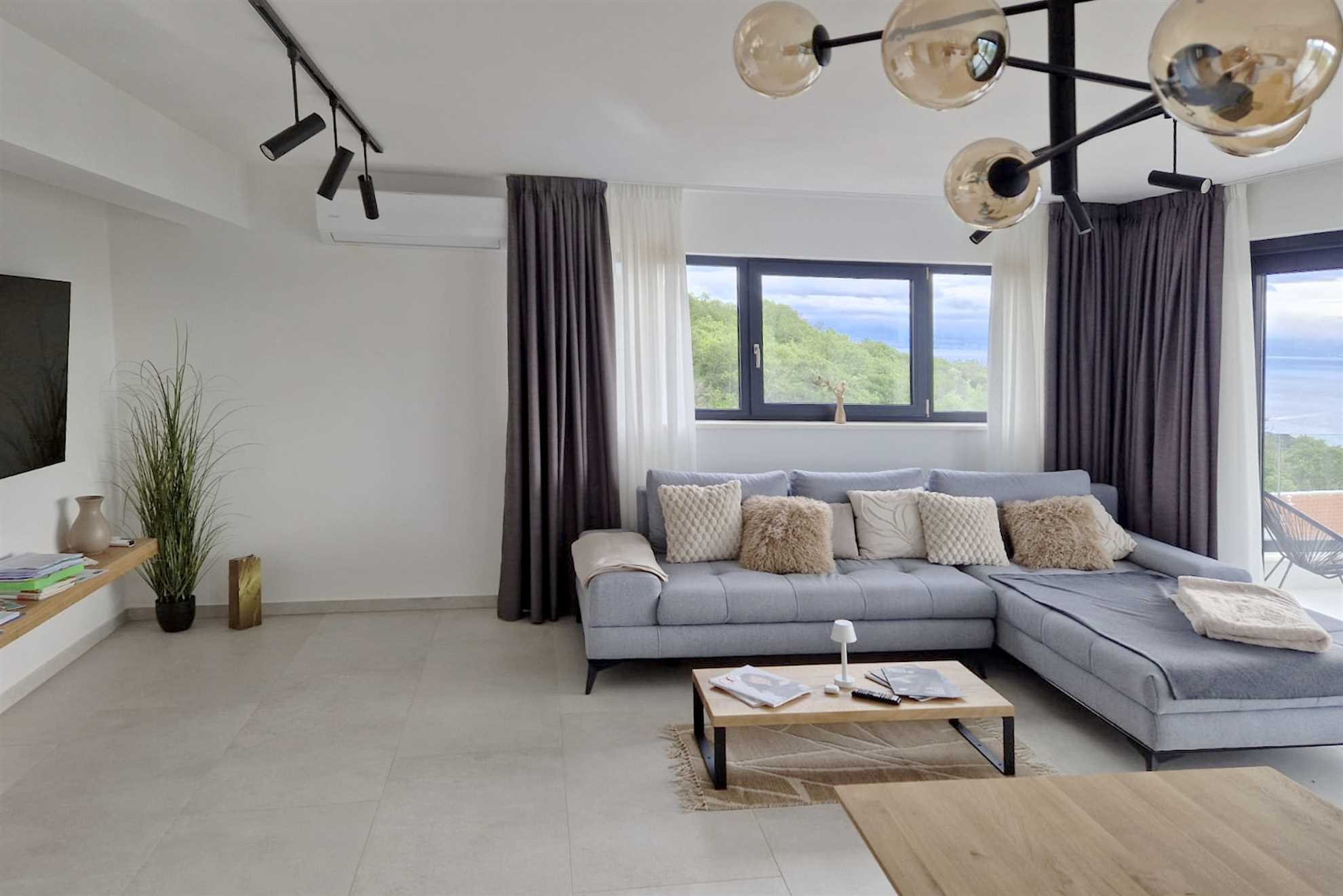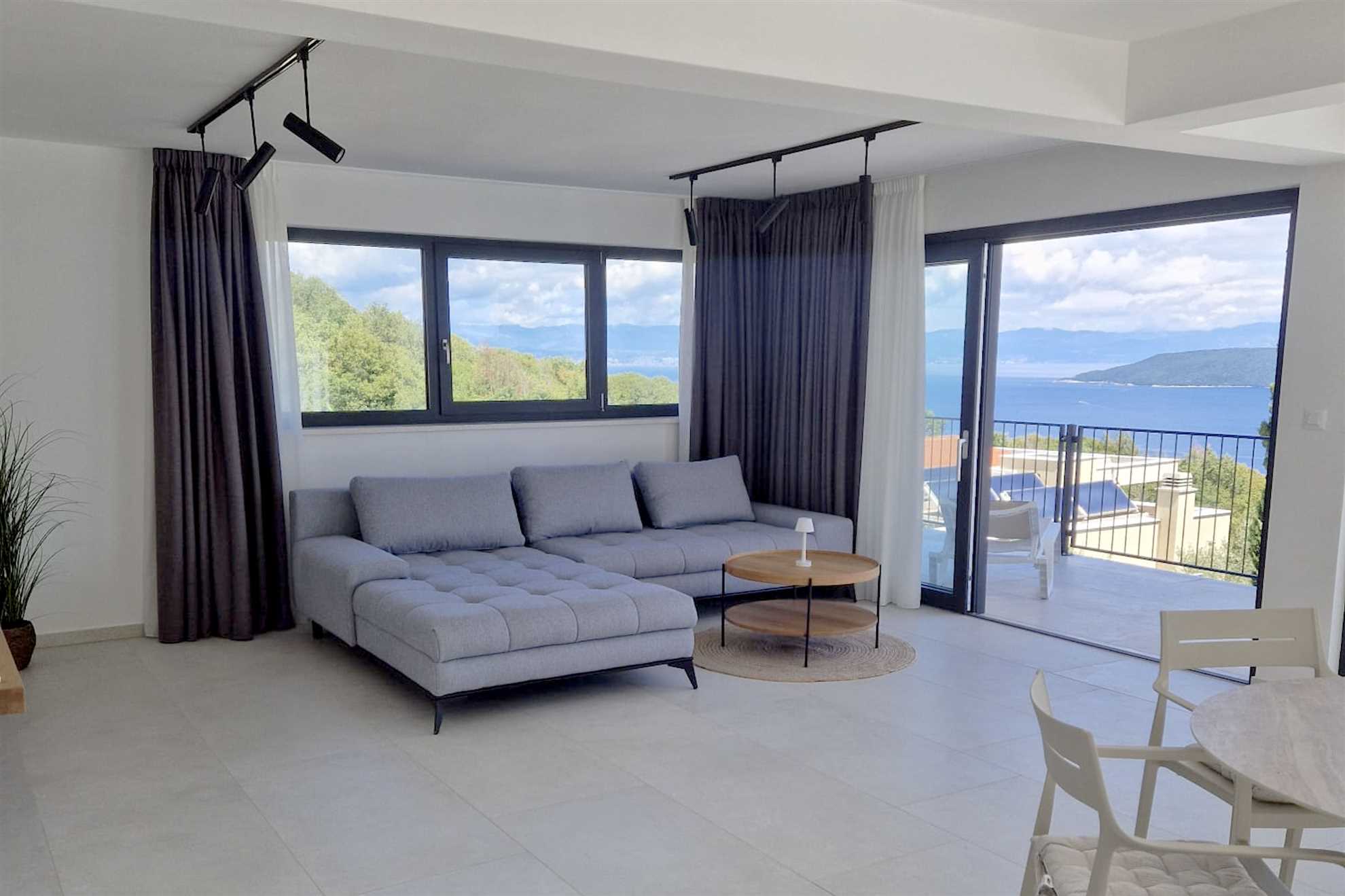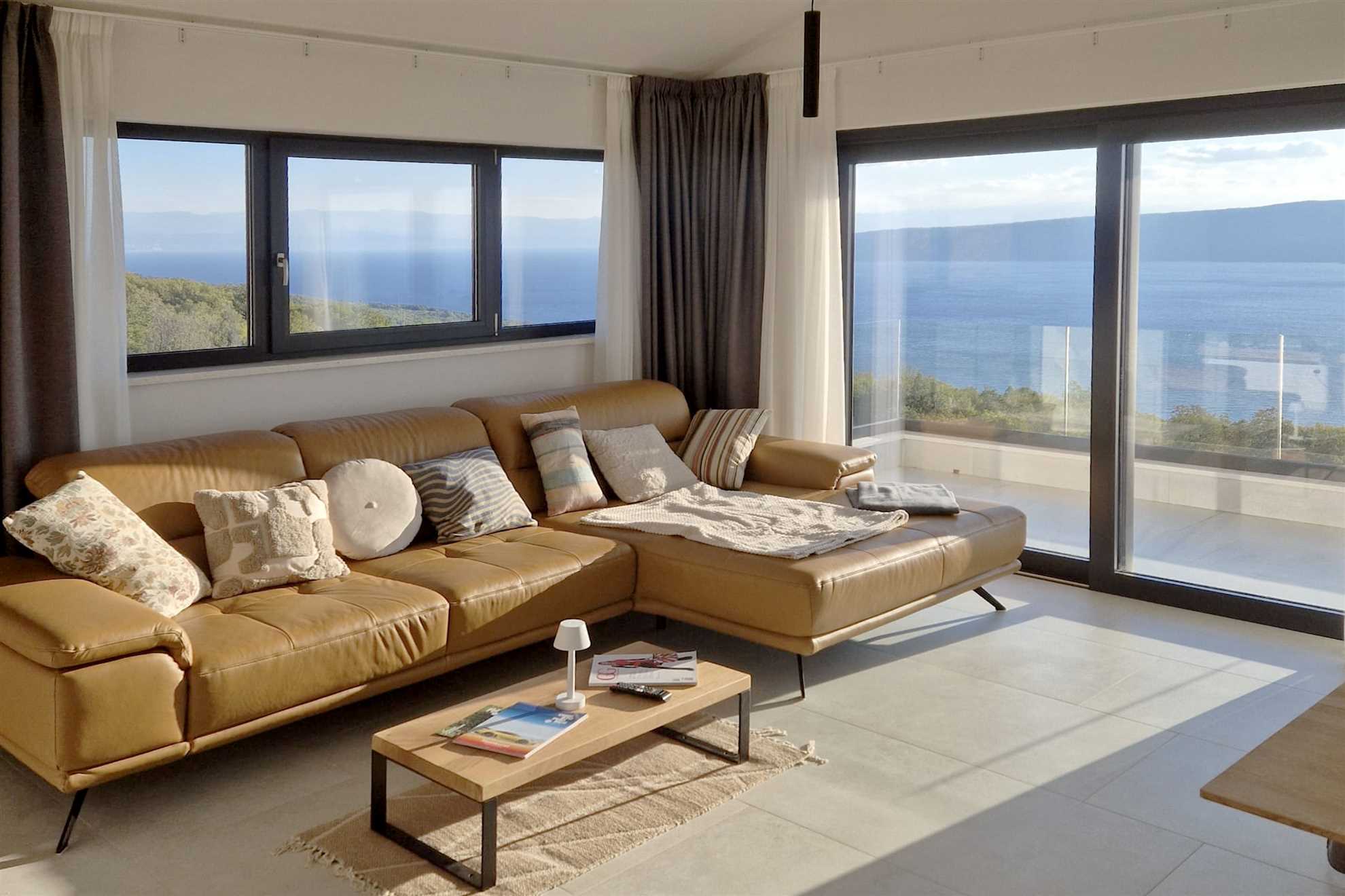Casa Meer features three bright panoramic living rooms, each offering a cozy L-shaped sofa and direct access to a spacious 20 m² balcony or terrace. From here, you can enjoy stunning views of the open sea and the island of Cres — the perfect setting for slow mornings, sunset drinks, or simply relaxing with the sound of nature. Each living room includes a 50-inch smart satellite TV, a Bluetooth music system, floor heating, and air conditioning. The open-plan spaces extend across 30 m², creating an inviting area to unwind.